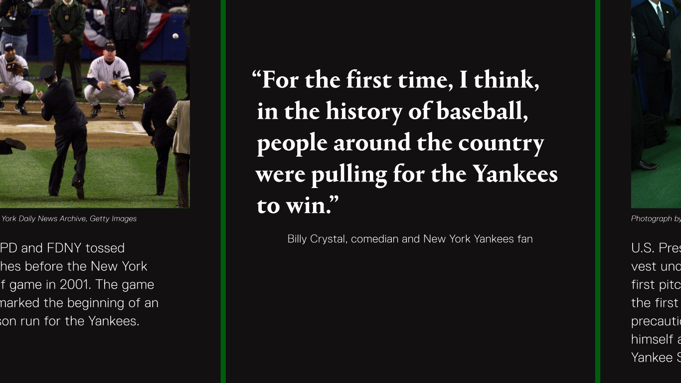 The emotions of sports crowds at various points after 9/11 is an effective way to frame the story arc, using design gestures to take visitors back to those key moments in stadiums and portray the changing emotions of a whole nation.