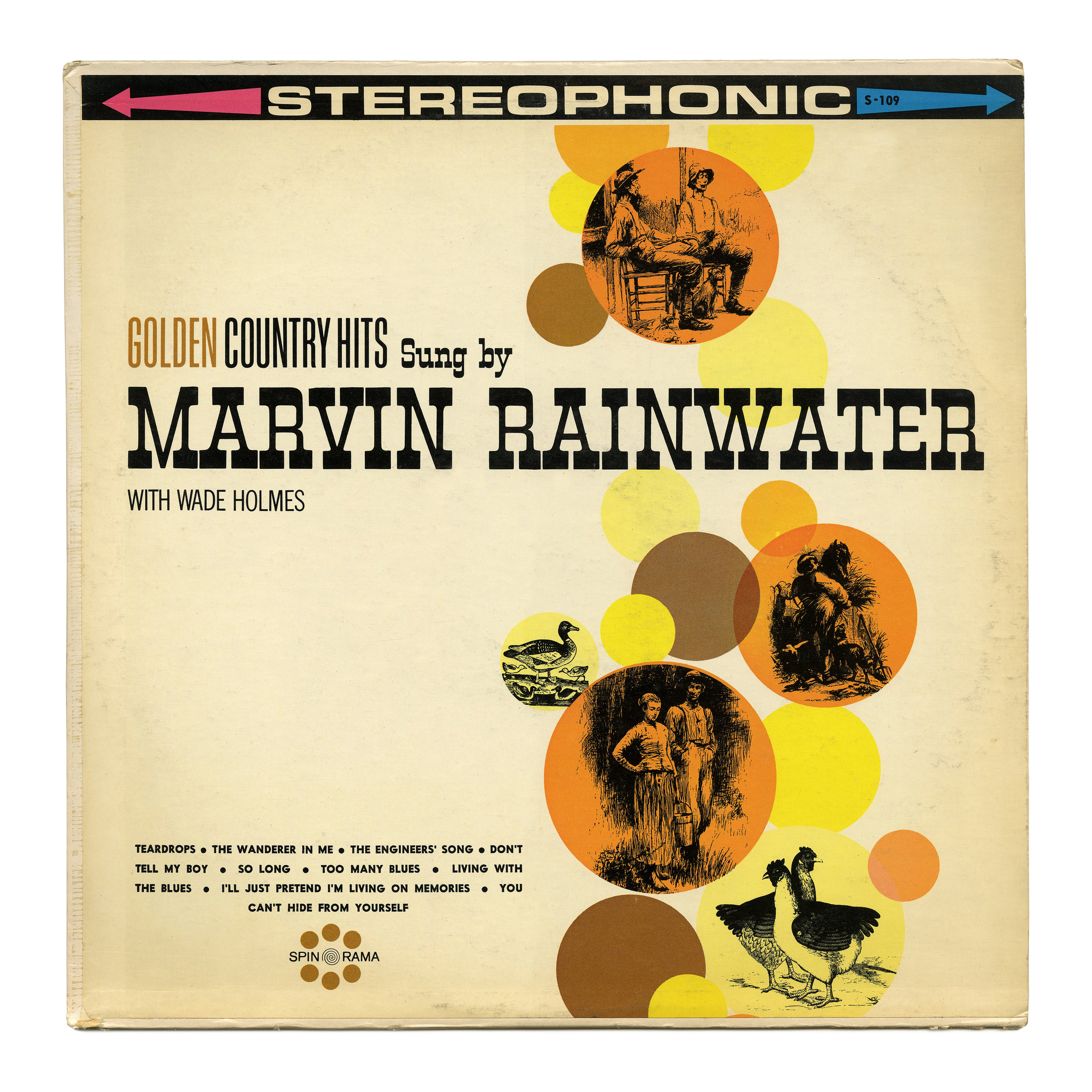 Golden Country Hits Sung By Marvin Rainwater with Wade Holmes. Spin-O-Rama Records/USA (1972). The title typography features two faces from Filmotype: Wigwam, a “railroad” slab, and Garfield, from their “G” series of condensed Grotesques which was copied by VGC as “B” series and digitized by URW as Bee.