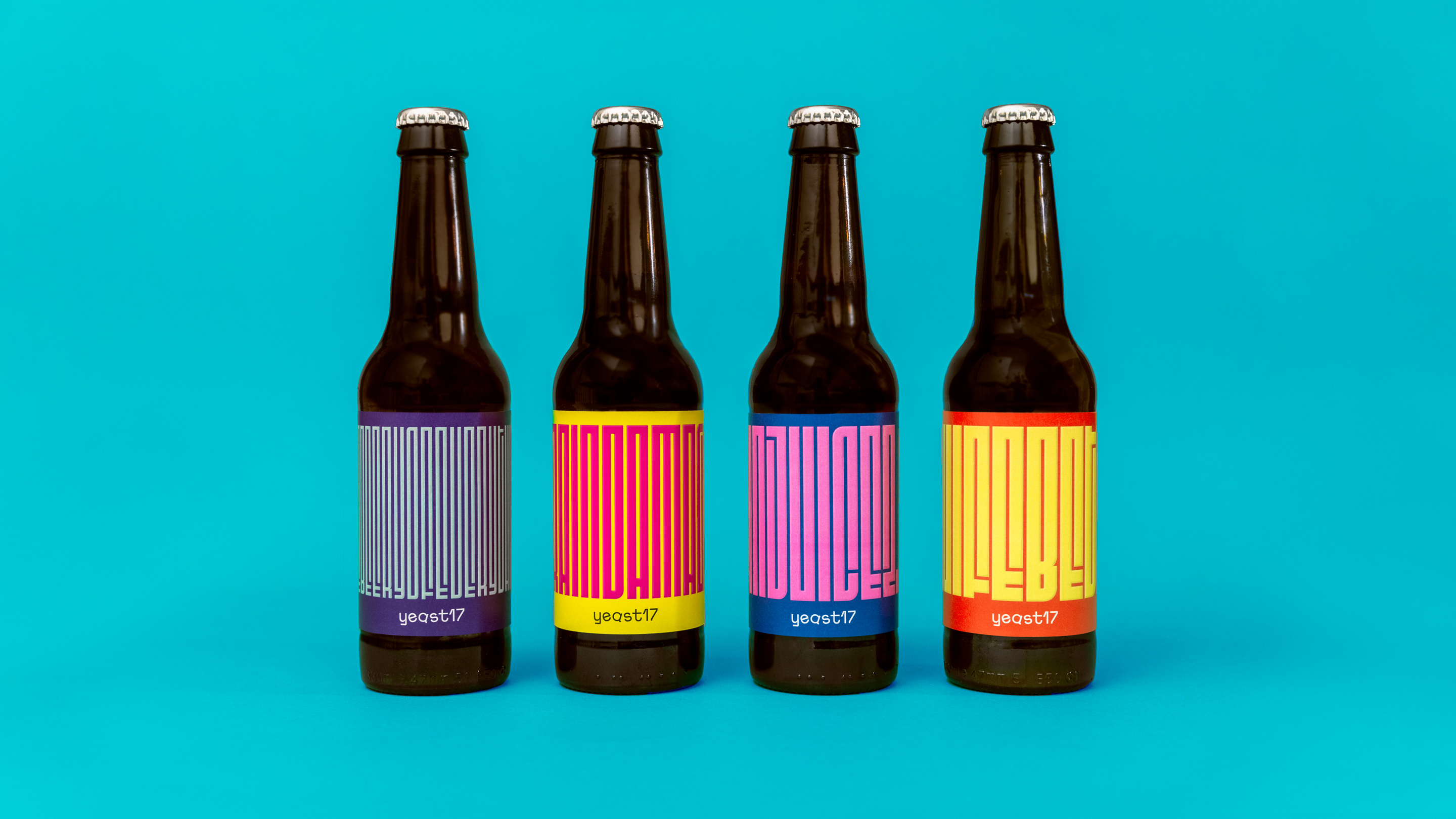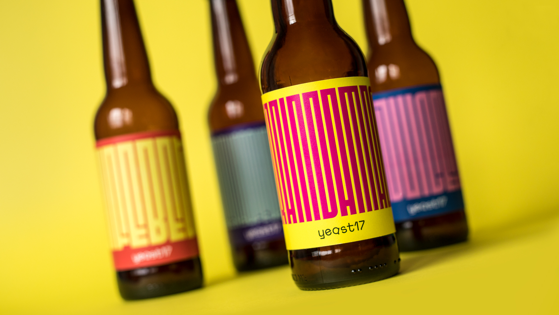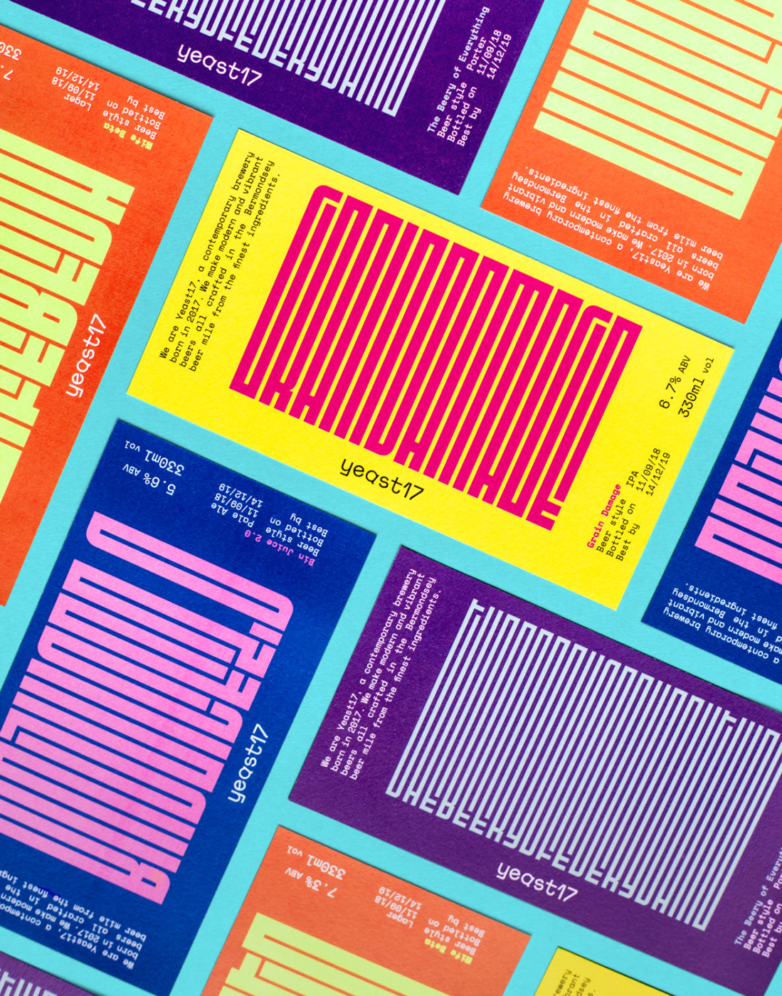 The wordmark design embodies the playful spirit of Yeast17 brand with rotated letters and its idiosyncratic custom designed typeface. The visual research leads to the creation of a bold and vibrant colour palette reflecting the pop culture of their naming along side the usage of the uncompromising and unmistakable typeface Fit. The typeface adapts its forms to the space within the label limits, in this way the beer’s names become a graphic property in itself creating different patterns for each beer. The result is a new visual expression that is distinctive on the store shelves and that embodies the soul of Yeast17: ironic, pop, anti-boring, bold and playful.