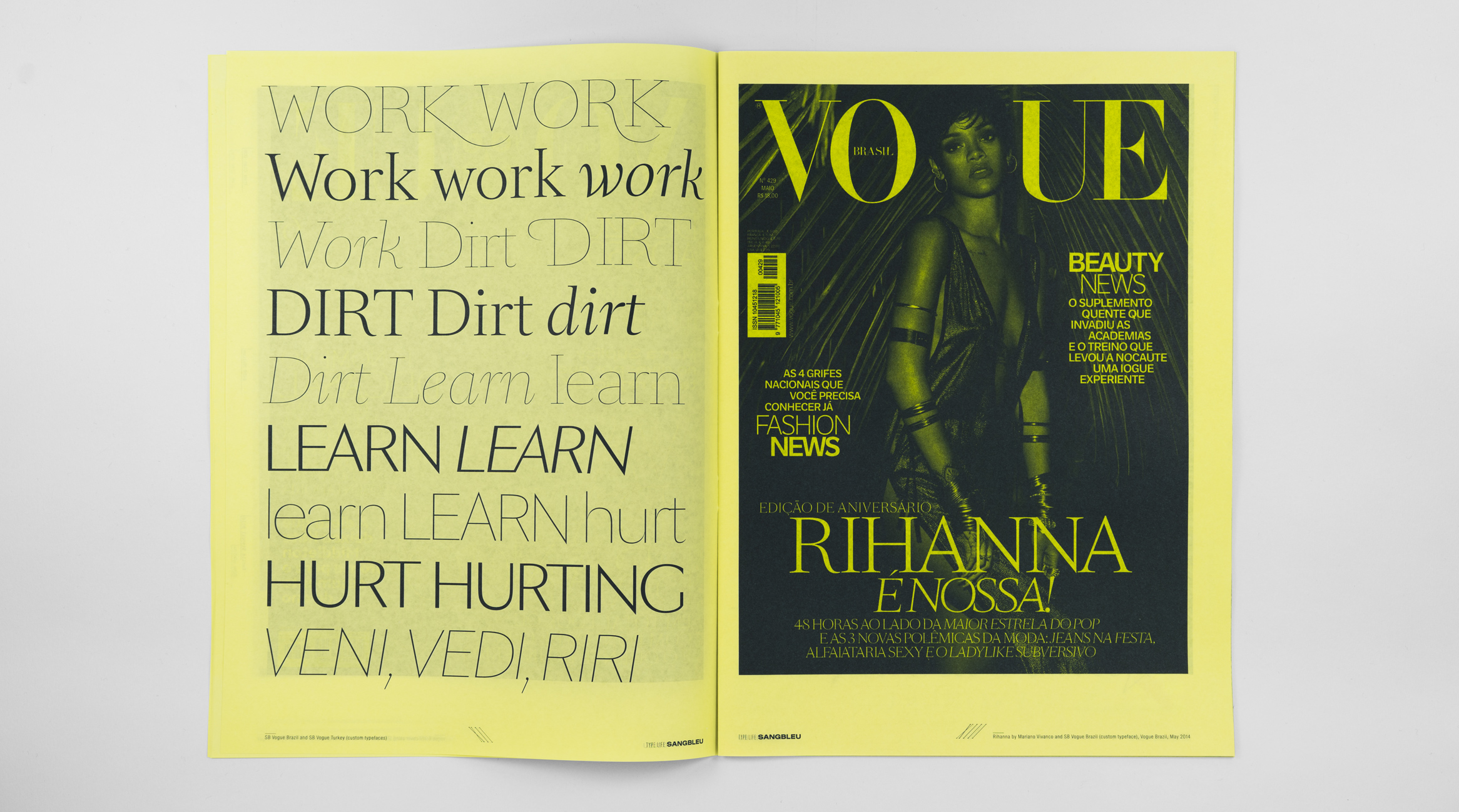 Since 2010, Vogue Magazine commissioned several custom versions of the SangBleu typeface from Swiss Typefaces, for their Brazilian and Turkish editions. SangBleu Vogue Turkey is based on the Sans, with the dots of Ü vertically arranged within the interior shape, so that all-caps headlines can be set big, with minimal line-spacing. SangBleu Vogue Brazil is derived from the Serif, with longer serifs and luscious swash capitals. Type Life shows reproductions of covers and feature pages, next to remix versions that give a hint what Vogue would look like if Swiss Typefaces were in charge.