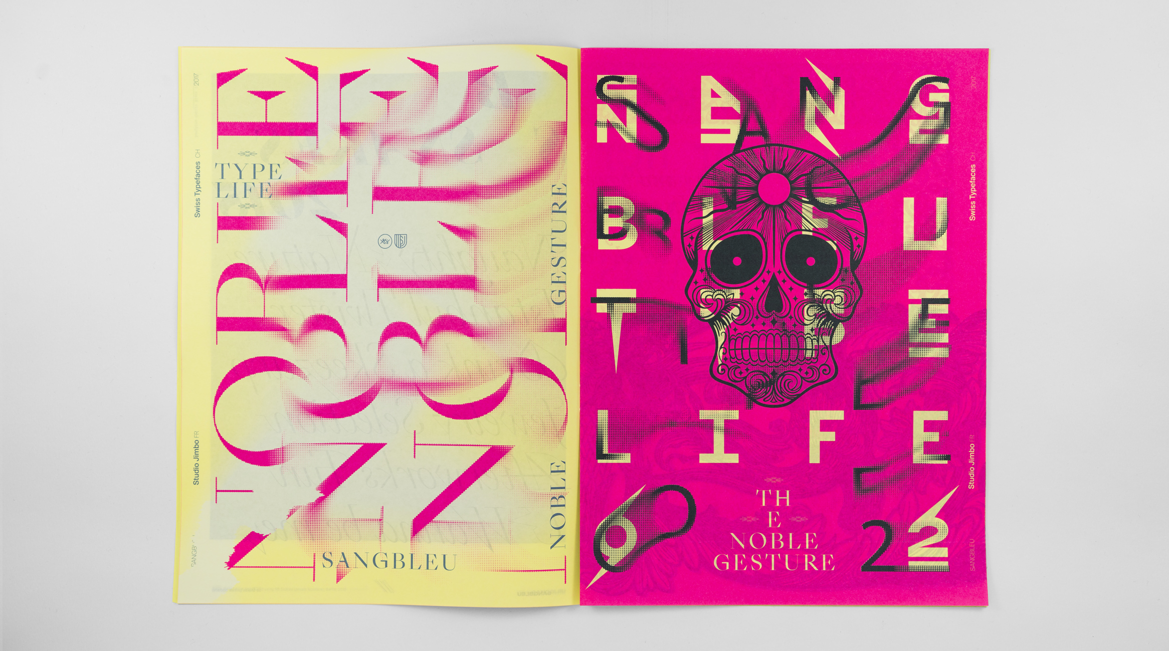 Each issue of Type Life features a guest artist. This time it’s Studio Jimbo from Paris. In their contribution, letterforms from the SangBleu and KRSNA typefaces dissolve in a blizzard of halftone dots, with a death’s head staring at you from the eye of the storm. This leads to an introduction of the all-new SangBleu typeface, released in October 2017 in five full-featured collections – Empire, Kingdom, Republic, Versailles, and Sunrise – each in a range of weights with matching italics, in Latin and Cyrillic, spanning 45 styles in total.