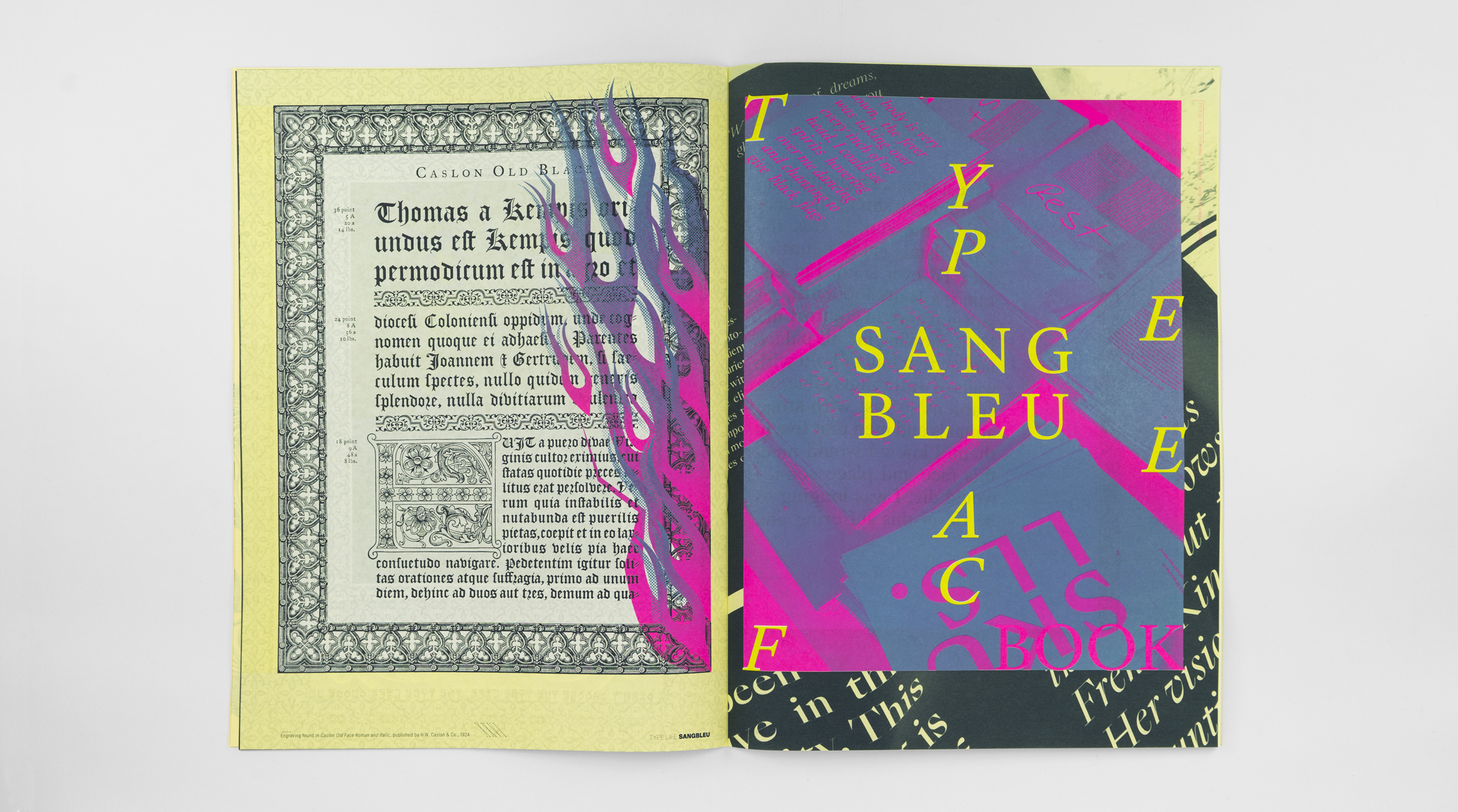At the center of issue 2 is Sang Bleu. That’s the name both of a typeface from Swiss Typefaces, and of an independent multi-disciplinary media platform and creative agency. The two were initiated together and share a common history. From the very first incarnation in 2007 to the new SangBleu typeface completed in 2017, the SangBleu typographic identity has built a legacy for itself. Many SangBleu fonts debuted in the Sang Bleu magazine, a publication about fashion, tattoo culture and more. Some of them later made their way into the Swiss Typefaces catalog of retail fonts, others remained private, like the runic-looking SangBleu Sex. Yet others were at one point available for licensing, but now are retired, like the supertight SangBleu G-String.