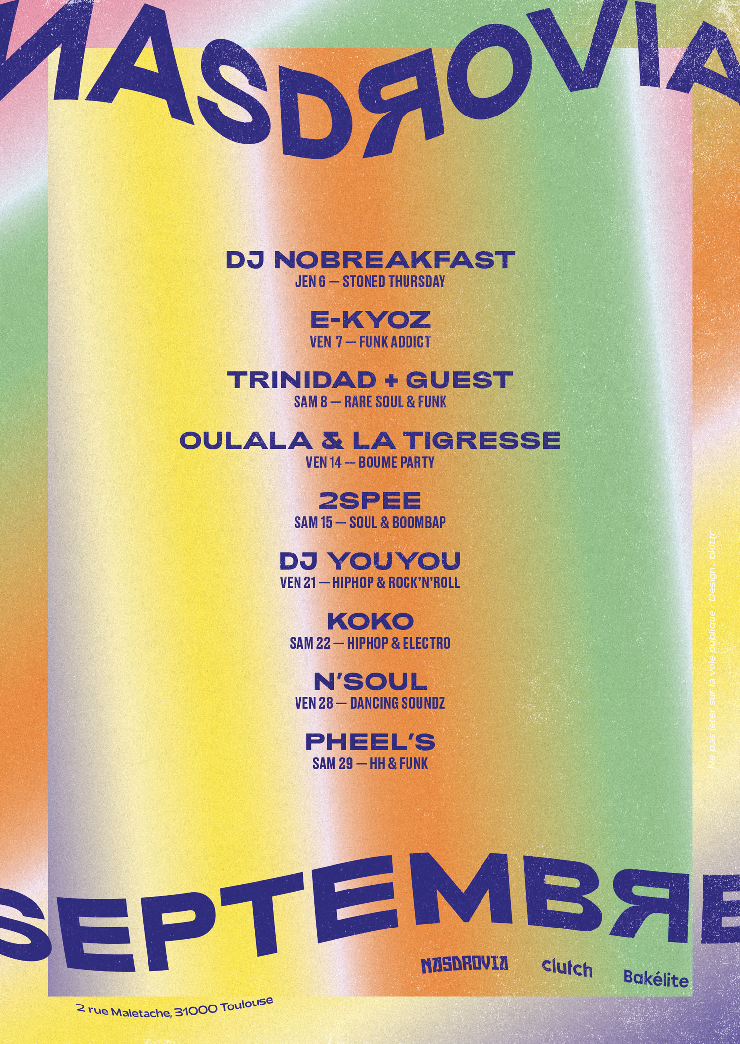 Nasdrovia Tolosa, Septembre 2018 Contributed by Antonin Maja on Sep 30th, 2018. Artwork published in September 2018. License: All Rights Reserved. Posters/flyers for the September program of Le Nasdrovia, a bar in Toulouse, France. License: All Rights Reserved. License: All Rights Reserved. License: All Rights Reserved. License: All Rights Reserved. Typefaces More about AdieuGet AdieuMore about Druk TextGet Druk Text Formats Posters/Flyers (5802) Topics Event (3239) Music (6396) Designers/Agencies Antonin Maja (3) Bakélite (1) Tagged withbars (151)typeface combinations (3979)all caps (7673)gradients (847)crosswords (23)distortion (365)lineups (294)mirrored glyphs (86)Russia (29)outlined type (1265)matrix of glyphs (72) Artwork location France (2873) Toulouse (70) In Setscool (Karo Konieczna) (871)Wide Style (Florian Hardwig) (145) Post a comment Name Email – will not be published Website Your response Submit Comment More Adieu in use Sapphire Ventures2023OHMY StudioContributed by OHMY Studio Beat Film Festival 20192019Ricardo d’AvilaContributed by Ricardo d'Avila Travelling Series, “The Sofia Issue”2018Miguel AnønimoContributed by miguel anønimo Sponsor More in Event “Oh, Softscapes” flyer2019Lauren Traugott-CampbellContributed by Lauren Traugott-Campbell Staff Pick L’oculus2016Florian ChevillardContributed by Bureau Brut Zentrum für verfolgte Künste2023Gutes im FalschenContributed by TypeType La Imagen Construida2024ESIETEContributed by ESIETE More in Posters/Flyers Little Rivers Festival2019Sasha KulikovContributed by Maria Doreuli The Craft movie poster and title sequence1996unknownNina Saxon Film DesignContributed by Patrick Concannon “Fly it.” Royal Air Force poster1975Photo(s) by The National Archives UK on Flickr. Blak Powerhouse2024Benjamin MilesContributed by Daniel McQueen (TDF) More Fonts In Use The Coasters – It Ain’t Sanitary album art1972unknownContributed by Florian Hardwig Staff Pick “Together!” ad for Colt 45 (1969)c. 1969unknownContributed by Neil Lewis Staff Pick Dieci: Biennale College Cinema 2012–222022Tomo TomoContributed by Luca Pitoni Staff Pick Blanket Statement, Yale School of Art2022Osvald LandmarkM.C. MadrigalContributed by WELTKERN® Typefaces Staff Pick