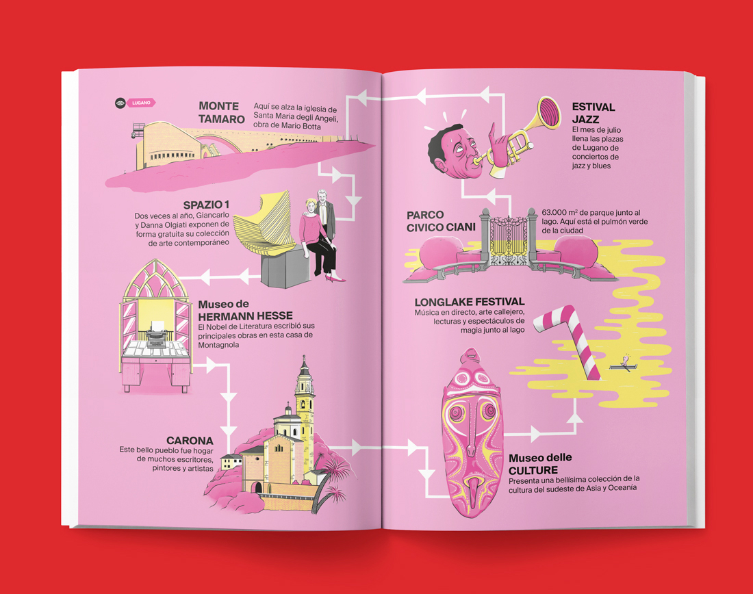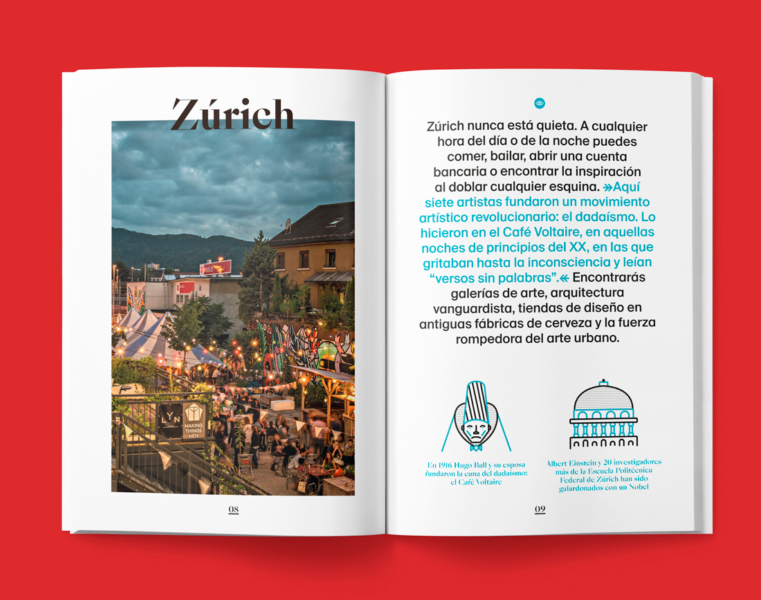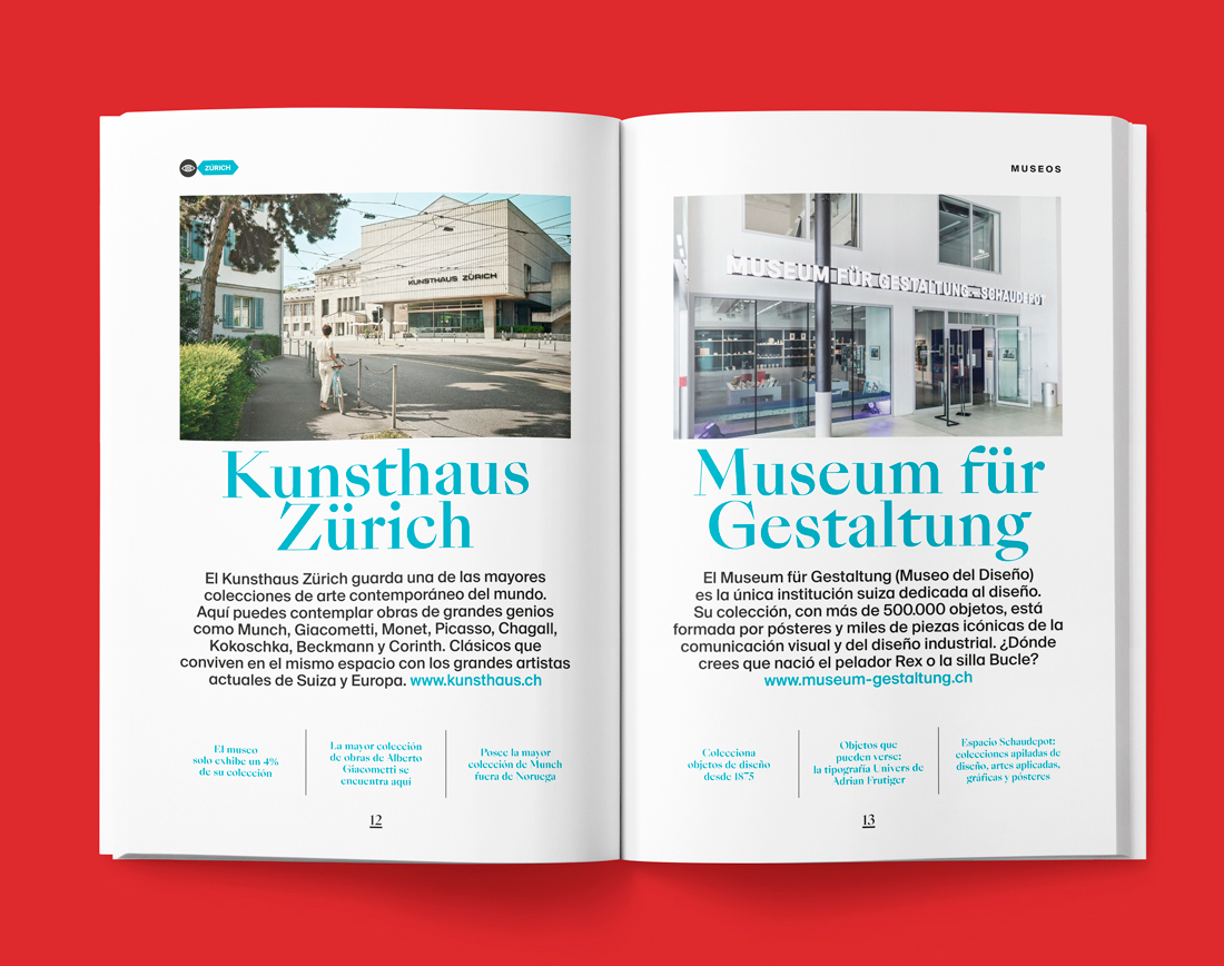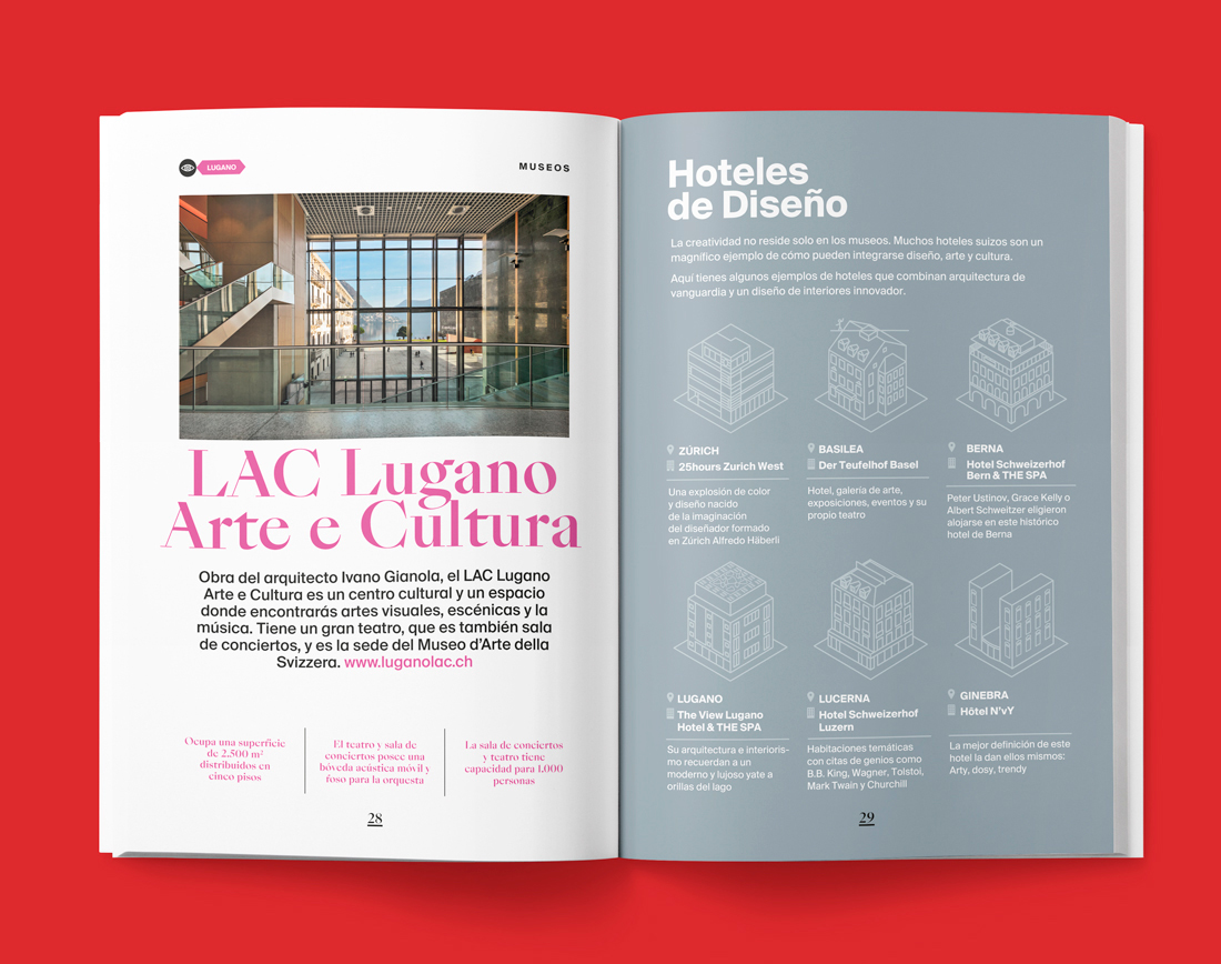 Switzerland Tourism approached us to create a guide for people interested in graphic design, art and culture. In addition to showing the museums and centers of cultural interest in many of its cities, this guide talks about the great works made by Swiss artists and those from all over the world who traveled to Switzerland to develop their works.