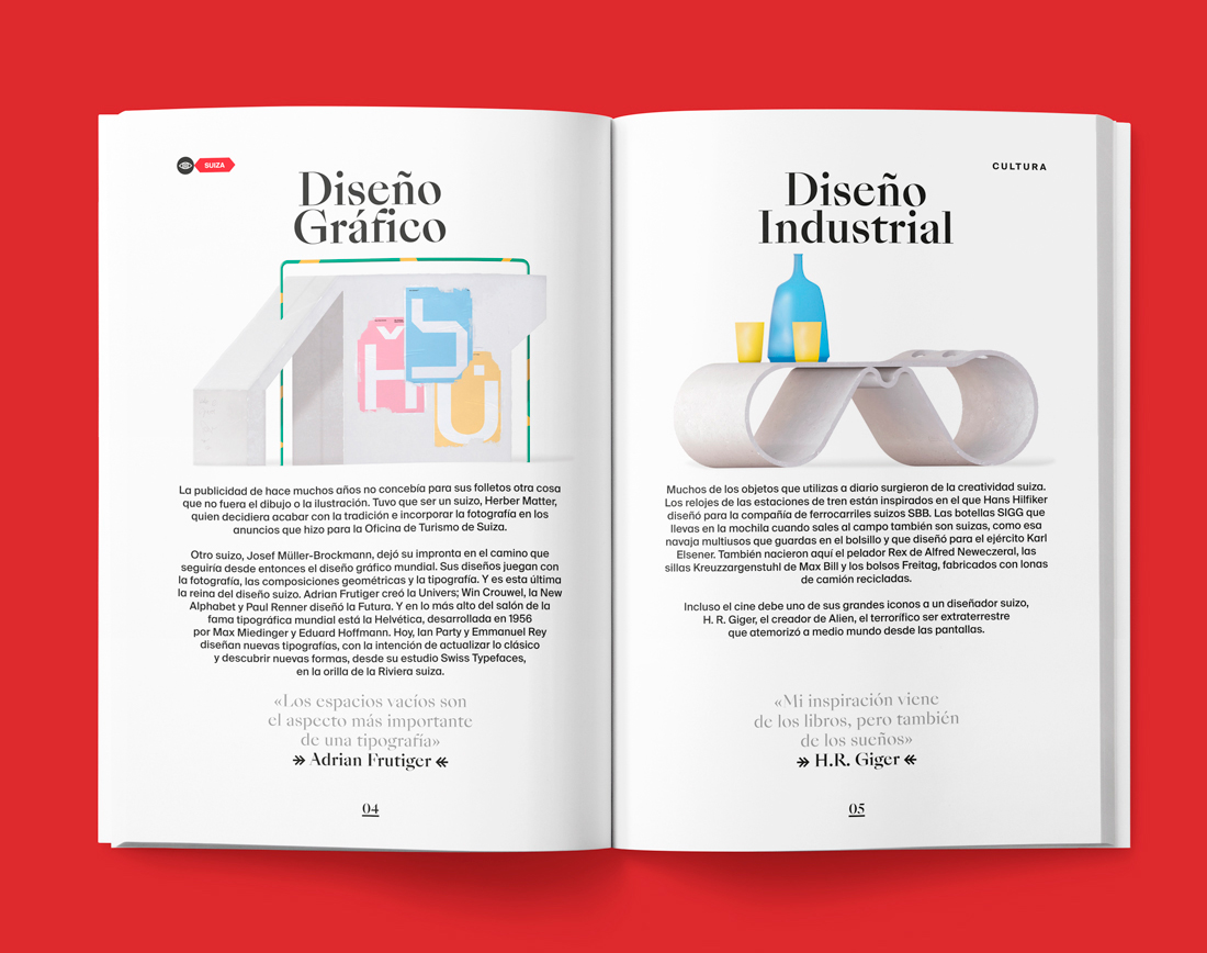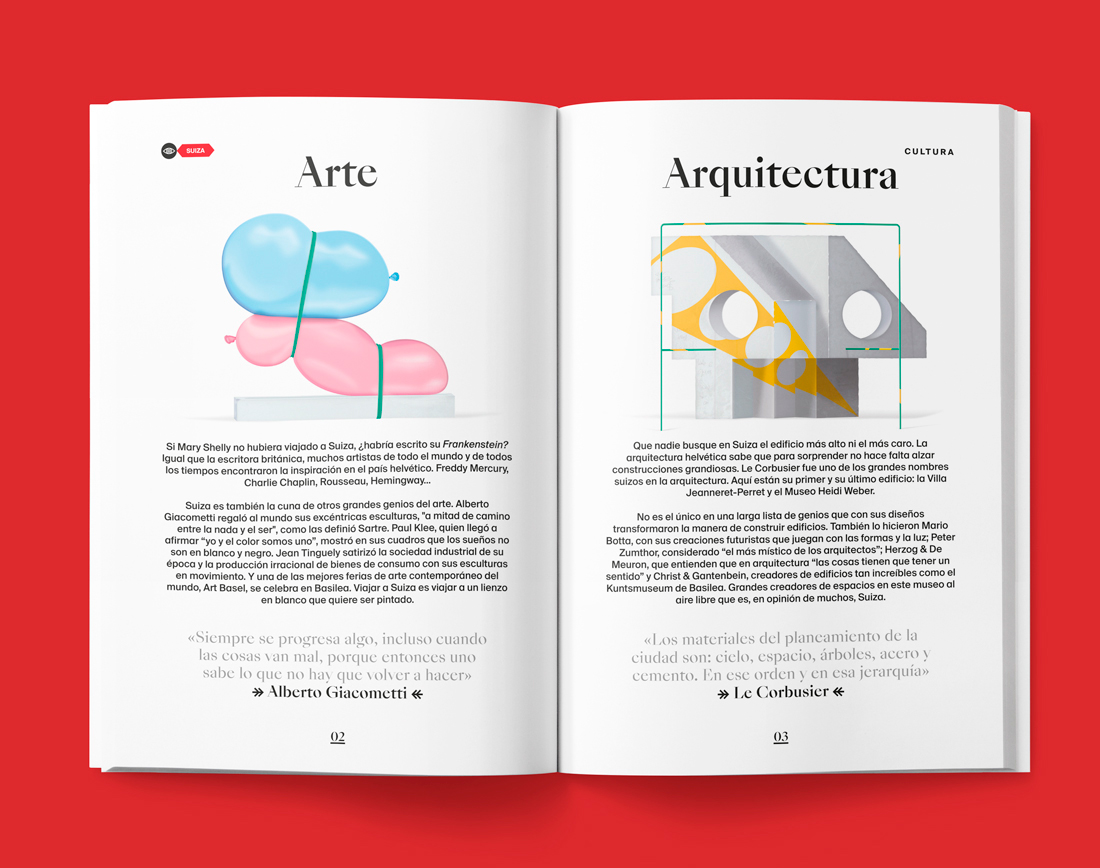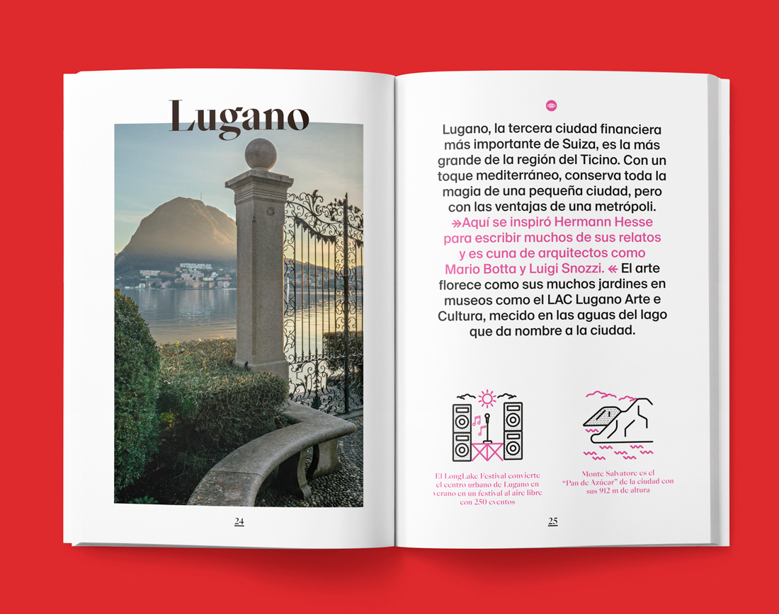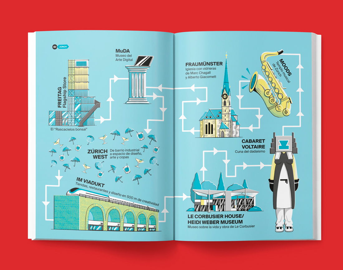 Switzerland Tourism approached us to create a guide for people interested in graphic design, art and culture. In addition to showing the museums and centers of cultural interest in many of its cities, this guide talks about the great works made by Swiss artists and those from all over the world who traveled to Switzerland to develop their works.