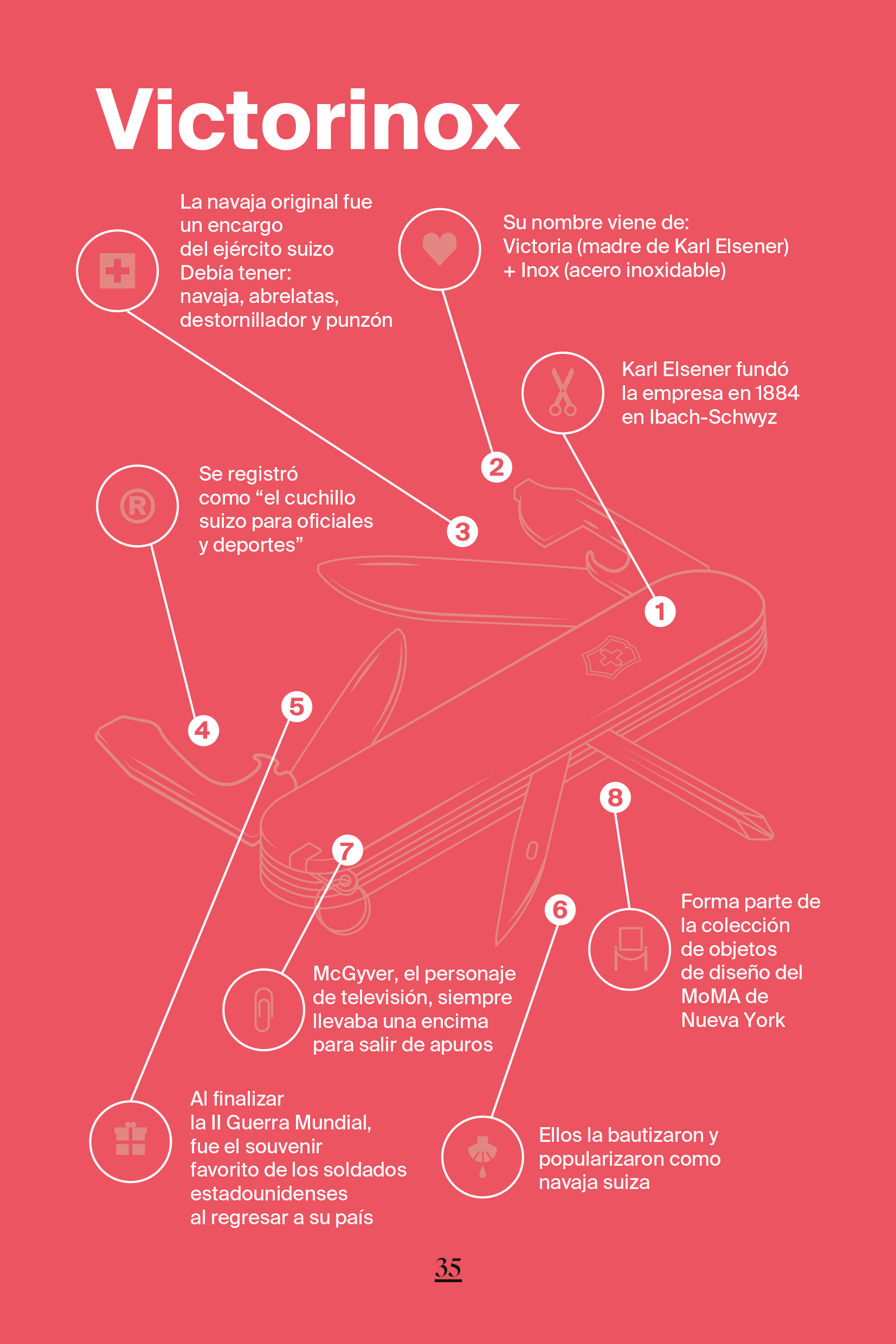 Infographics, illustrated maps and images present important contributions that Switzerland has given to the world in the fields of art, architecture and industrial and graphic design, such as the Swiss Army knife, the Swiss typography or the figure of Le Corbusier.