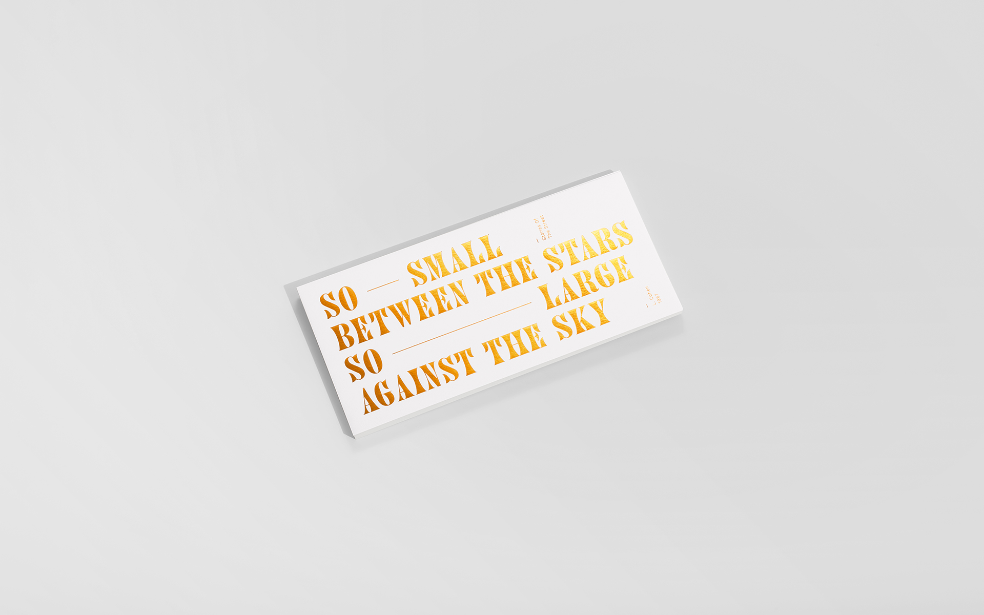 Fakepaper greetings cards Contributed by Fakepaper on Oct 13th, 2018. Artwork published in 2017. License: All Rights Reserved. So — small between the stars So ——— large against the sky Fakepaper’s greetings cards 2017 License: All Rights Reserved. License: All Rights Reserved. Typefaces More about JuniperGet Juniper Formats Ephemera (1238) Topics Graphic Design (3041) Designers/Agencies Fakepaper (21) Tagged withgreeting cards (80)metallic foil (366)orange (450)all caps (7787)hyphens and dashes (86)dash (1)iridescent (15) Artwork location France (2904) Paris (1357) In SetsCultural (John Randall) (5)cool (Karo Konieczna) (870)Type Designs by Women (Fonts In Use Staff) (1946)GCADD (Andrew B) (8)Stationary (Andrew B) (12)Designs by Women (Fonts In Use Staff) (3700)Favourites (Lucas Bevilaqua) (1297)Distinctive Display (Lucas Bevilaqua) (159)Abstract (Lucas Bevilaqua) (293) Post a comment Name Email – will not be published Website Your response Submit Comment More in Graphic Design Fiorucci Archivio website2017FiorucciContributed by Gareth Hague Sinking Stone – Cristiano Volkc. 2019Federico BarbonContributed by Federico Barbon Finnegans Wake by James Joyce (ISIA Urbino)2020Riccardo SavioliGiorgia GiacominiContributed by Riccardo Savioli Sponsor More in Ephemera Rencontres Chorégraphiques de Seine-Saint-Denis 20192019GUNMADMikanContributed by Or Type Holloway’s Travelling Theatrec. 1898William NorthContributed by Greg Yerbury Staff Pick Focus Ireland fundraiserc. 2020Clare Lynch DesignContributed by Clare Lynch Mary Cassatt at Work, Philadelphia Museum of Art2024unknownContributed by TypeType More Fonts In Use ES Magazine2017Rasha KahilDavid LaneContributed by Luke Freeman Staff Pick Arts Broadcasting Studio at Anteism2021Juliette DuhéContributed by Juliette Duhé Staff Pick Advertising Direction 3: Photography1962Arthur HawkinsPhoto(s) by Bart Solenthaler on Flickr. Staff Pick 24 Stunden in Dresden-Loschwitz2014EllijotElisabeth WeberContributed by Elisabeth Weber Staff Pick Albers in Command2014Nitzan HermonContributed by Indra Kupferschmid Staff Pick “Savage Love (Laxed – Siren Beat)” [BTS Remix] single cover and lyric video2020Annie StollCristóbal SaezContributed by Annie Stoll Staff Pick Kes French movie posterc. 1970Jouineau BourdugeContributed by Florian Hardwig Staff Pick Lollapalooza Berlin 20152014unknownContributed by Florian Hardwig Staff Pick