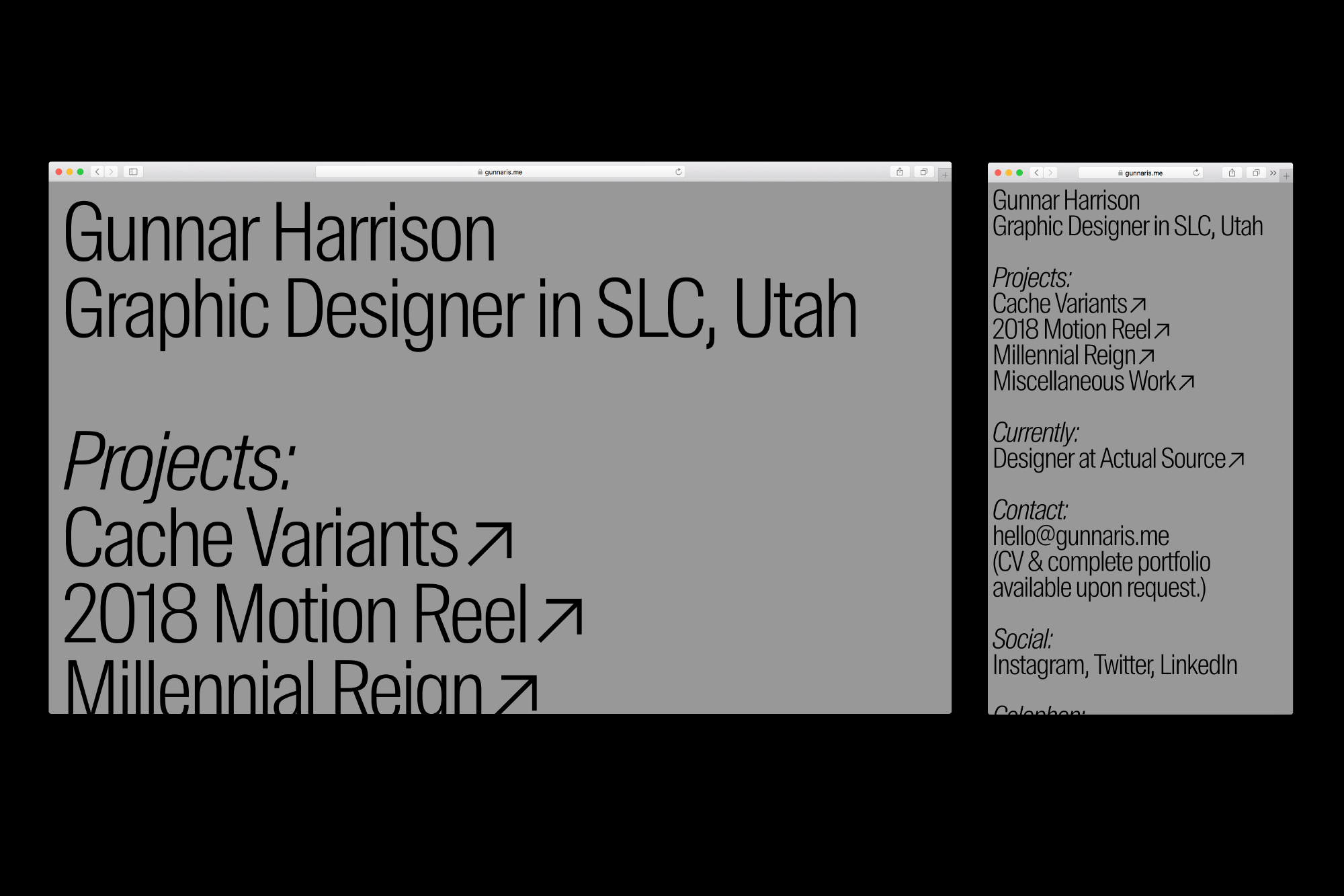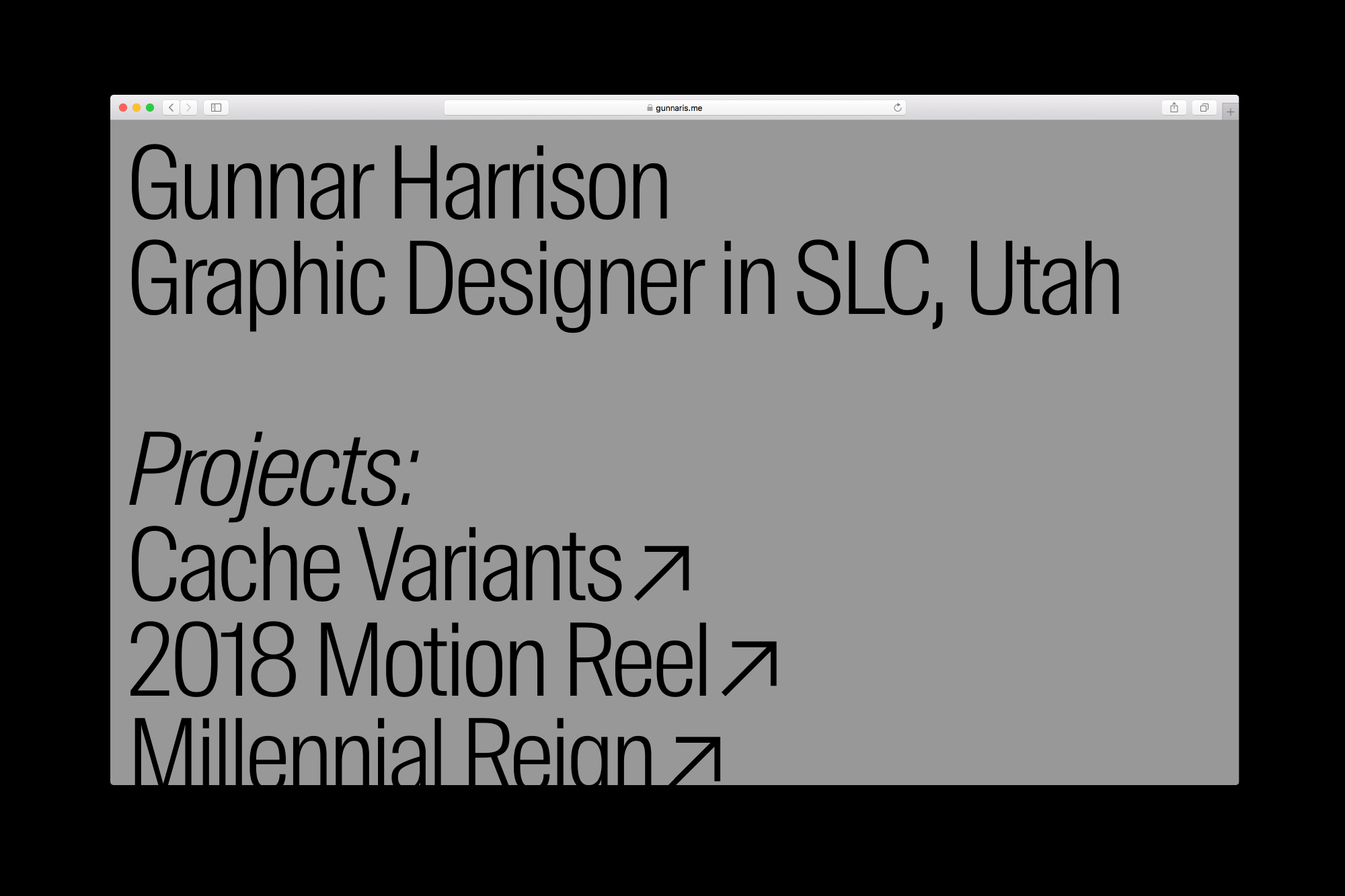 Gunnar Harrison portfolio Contributed by Gunnar Harrison on Oct 17th, 2018. Artwork published in September 2018. Source: gunnaris.me License: All Rights Reserved. A simple portfolio website that takes advantage of screen width with Suisse Int’l Condensed and Suisse Int’l. Source: gunnaris.me License: All Rights Reserved. Source: gunnaris.me License: All Rights Reserved. Source: gunnaris.me License: All Rights Reserved. Typefaces More about Suisse Int’l CondensedGet Suisse Int’l CondensedMore about Suisse Int’lGet Suisse Int’l Formats Web (5609) Topics Graphic Design (3005) Designers/Agencies Gunnar Harrison (1) Tagged withminimalist (529)portfolios (771)simple (60)mobile (594)websites (3554)arrows (762)gray (156)self promotion (323)condensed (277)multiple widths (560) Artwork location United States (9905) Salt Lake City (28) In Setscool (Karo Konieczna) (871)pf (Karo Konieczna) (61)soulu (Karo Konieczna) (35)Caloi (Bernardo Sande) (4)Just Type (jipjam) (20)PORTFOLIO (Angelica Oliveros) (17)Judy Portfolio (Moshi Mochi) (47) Post a comment Name Email – will not be published Website Your response Submit Comment More Suisse Int’l Condensed in use Inform Architecture2022Dimitris LelakisMaria TsilomitrouYun KuoContributed by Dimitris Lelakis Type Life #3c. 2018Swiss TypefacesContributed by Swiss Typefaces Nayeon – Na album art and merch2024JYP EntertainmentPRESS ROOMContributed by Swiss Typefaces Sponsor More in Graphic Design Die verlorenen Welten des Zdenek Burian by Judith Schalansky (ed.)2013Judith SchalanskyContributed by Florian Hardwig Staff Pick Supreme Members Clubc. 2018Luke DodridgeContributed by Luke Dodridge 20/20 Calendar2020Polar, Ltda.Contributed by Polar, Ltda. Typo Cultura Árabe postersc. 2015Pascal Zoghbi29LettersContributed by 29LT Type Design Company More in Web Kugel und Niere2025Studio VehContributed by NaN Herzblut & Bock website and videosc. 2024Herzblut & BockContributed by Schrifteria Foundry Bremer Philharmonikerc. 2019oblik identity designContributed by Production Type Christopher & Patrick wedding invitation2019Daniel IoannouContributed by Daniel Ioannou More Fonts In Use Houstonia Magazine Feature2013Chris SkilesContributed by Chris Skiles Staff Pick Form magazine (2021–2023)2021Autostrada StudiosContributed by Outline Online Staff Pick Crois pas qu’on dort campaign and titles2025AletheiaWe Are PiCC StudioContributed by Aletheia Staff Pick HKU Architecture Degree Show 20212021atelier avocadoAnthony LamContributed by Anthony Lam Staff Pick