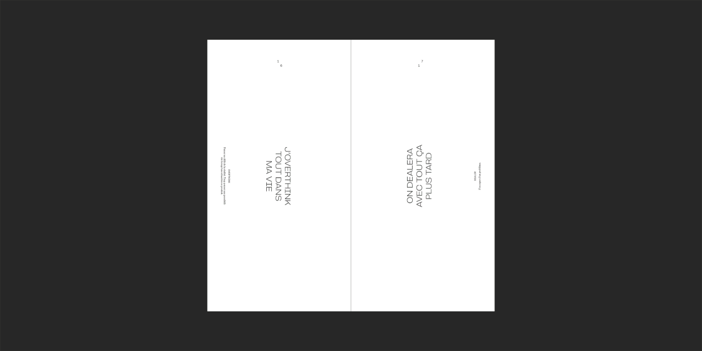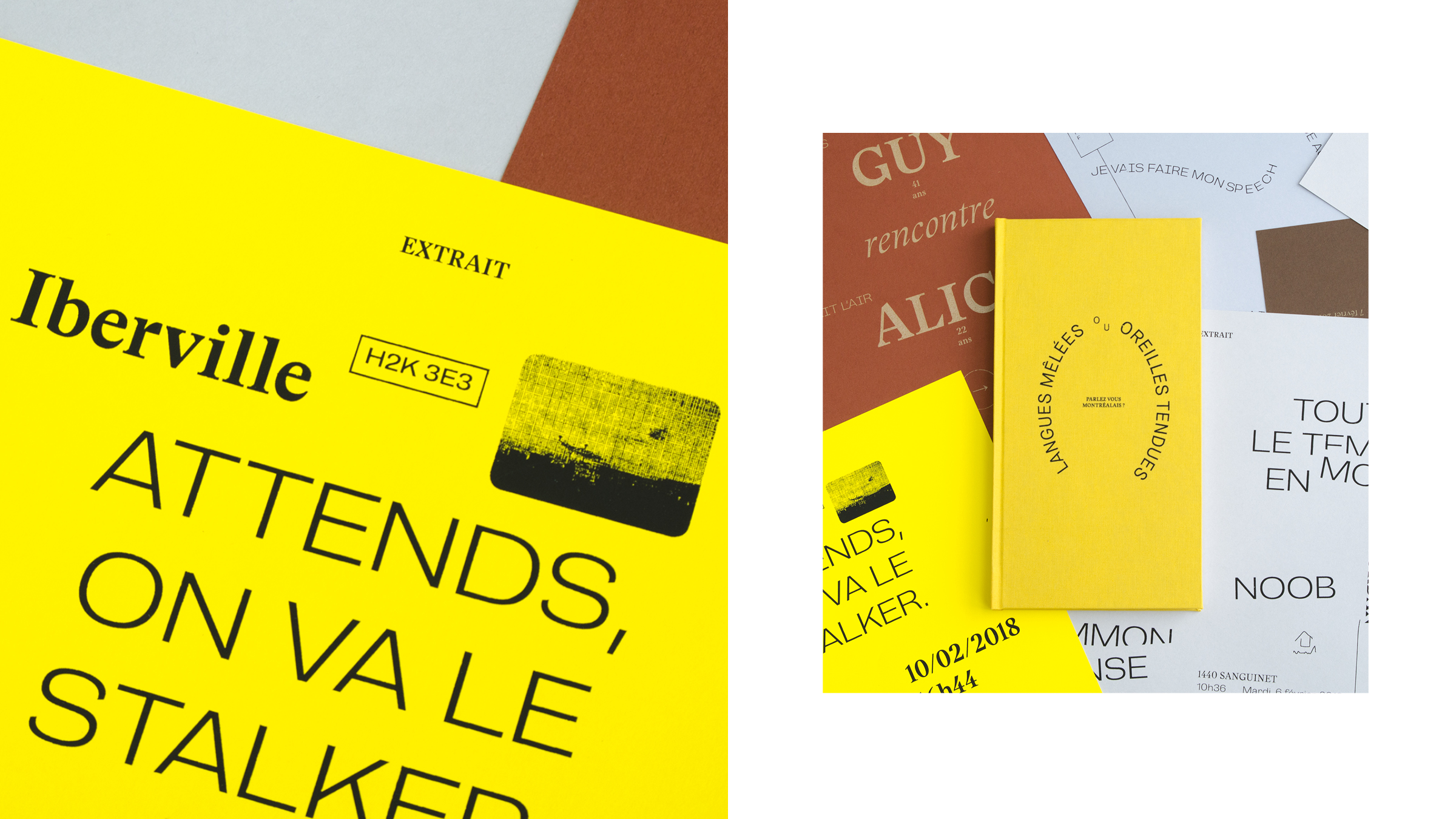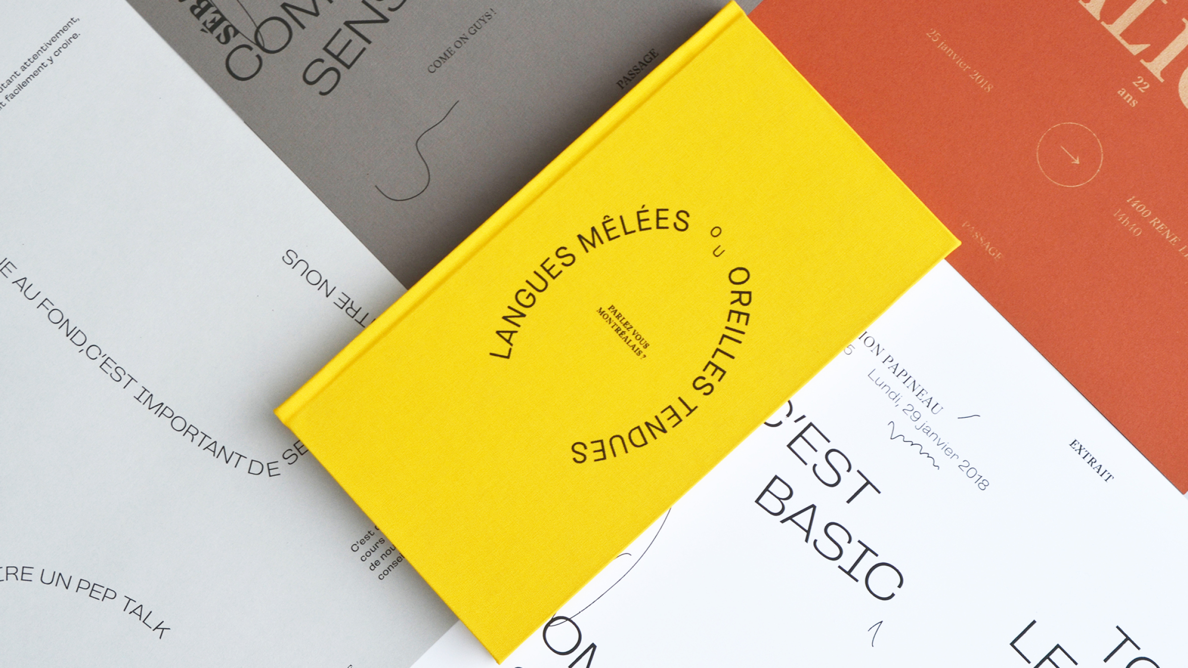 Langues mêlées ou oreilles tendues: Parlez Vous Montréalais? is a typographical book that plays on the idea of discussions, dialogues between Montrealers. This book and posters, a final project for the UQAM, present a census of echoes in the Montréal scene. It is a part of the popular language, a celebration of our languages mixed with all ears tense.