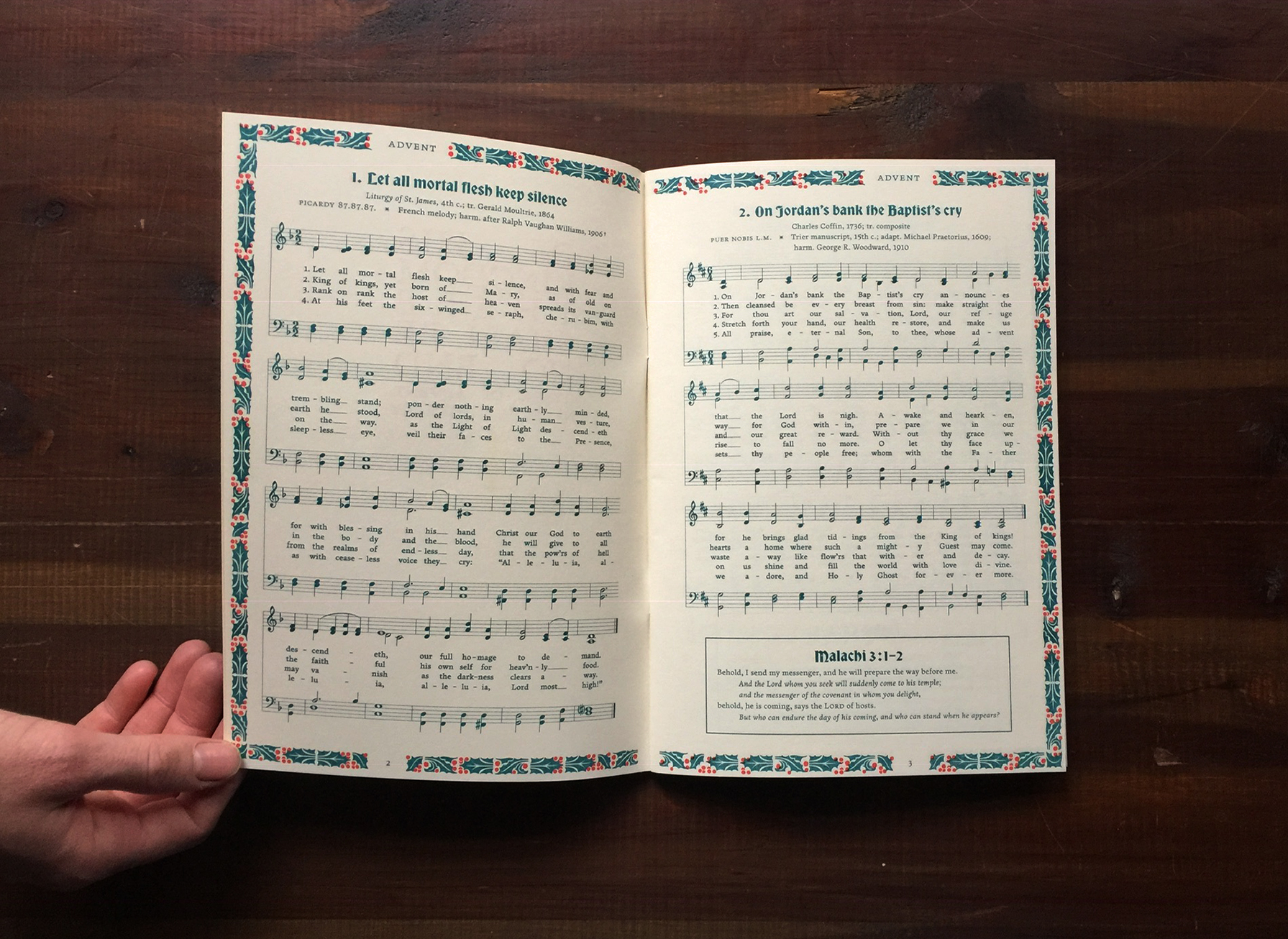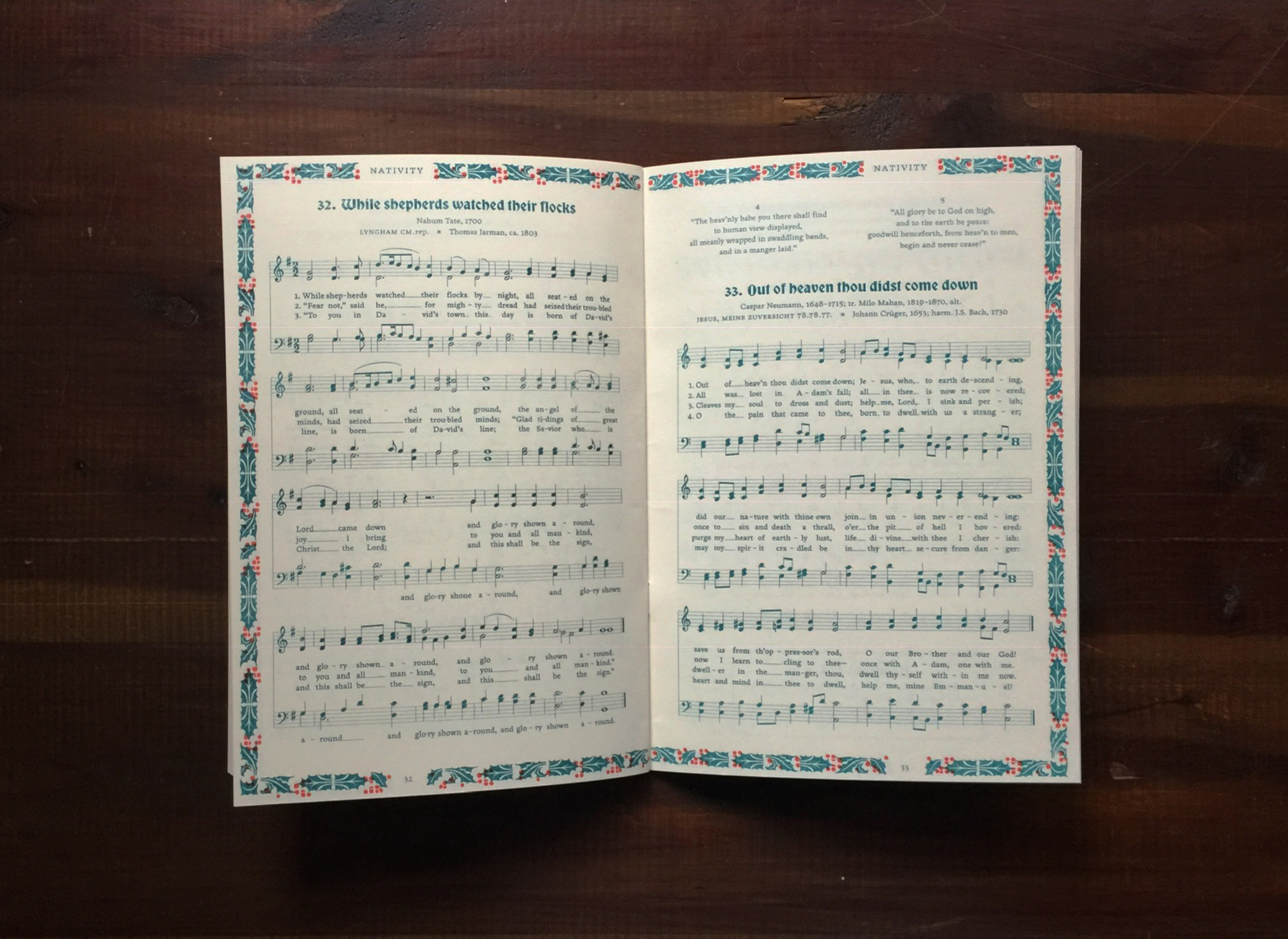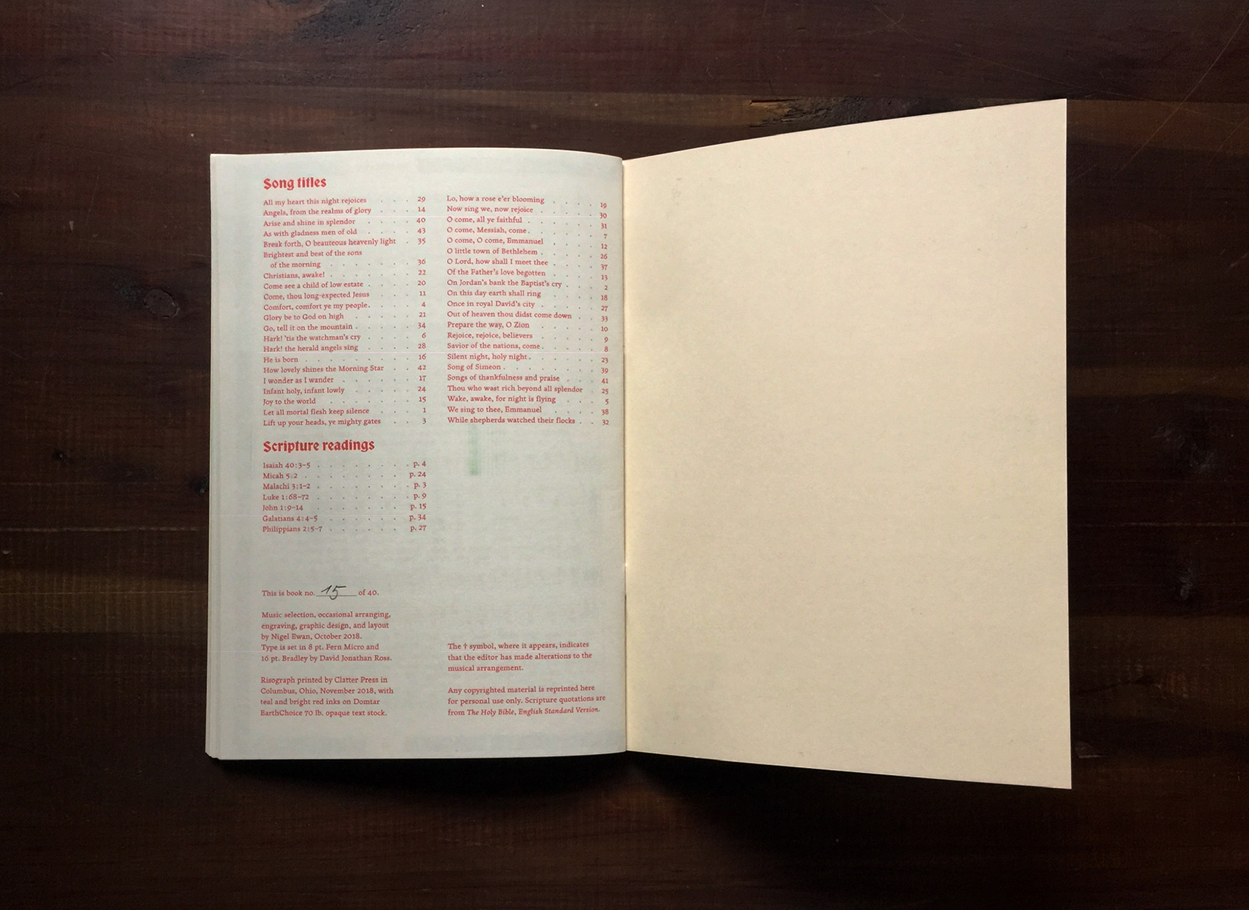 This 44-page mini-hymnal for the Christmas season is equal parts practical songbook and objet d’art. As this project was being conceived and designed, David Jonathan Ross’ Font of the Month Club delivered two typefaces (Bradley and Fern Micro) which perfectly fit the incunable/private press movement energy of the piece. Providential!