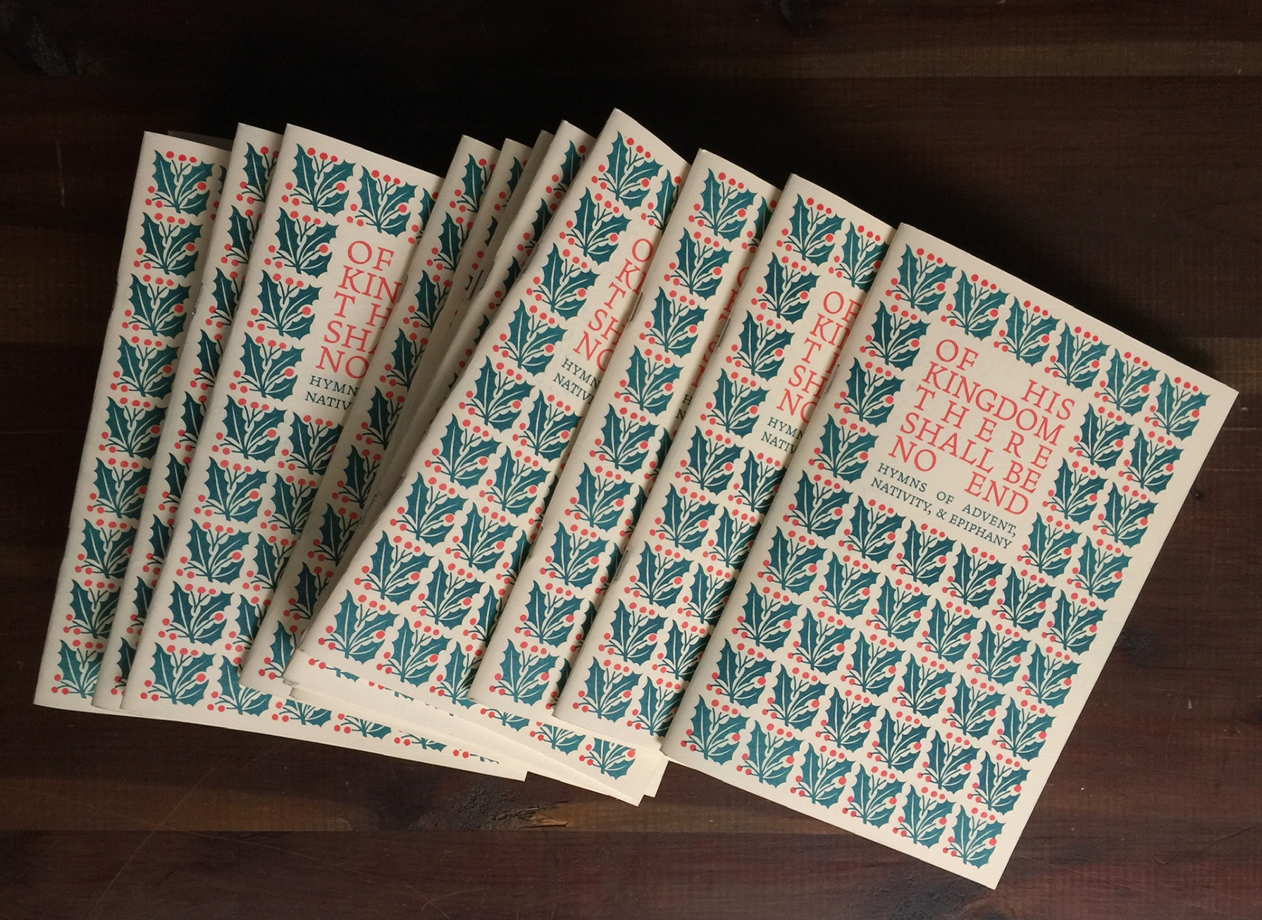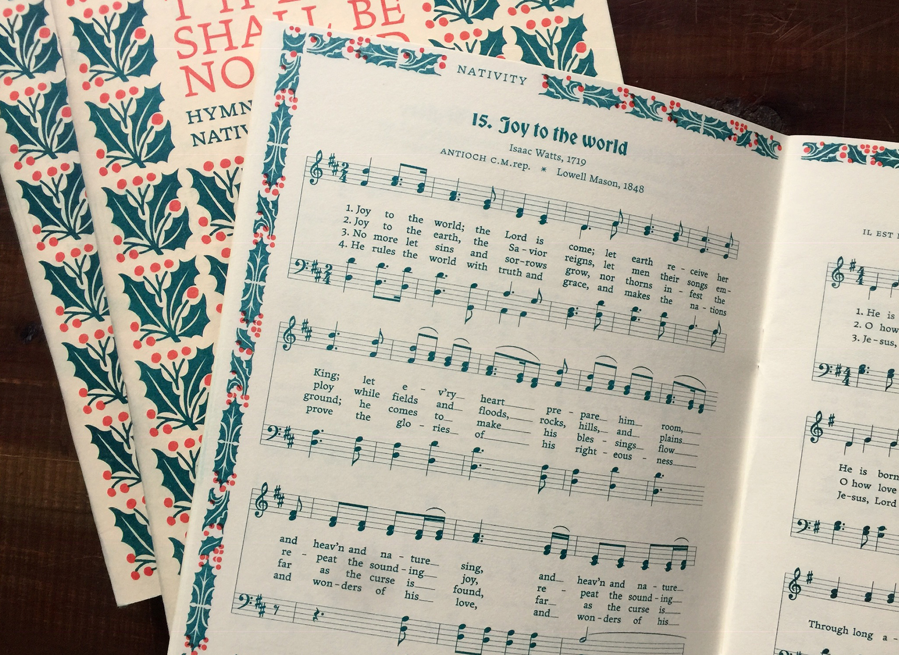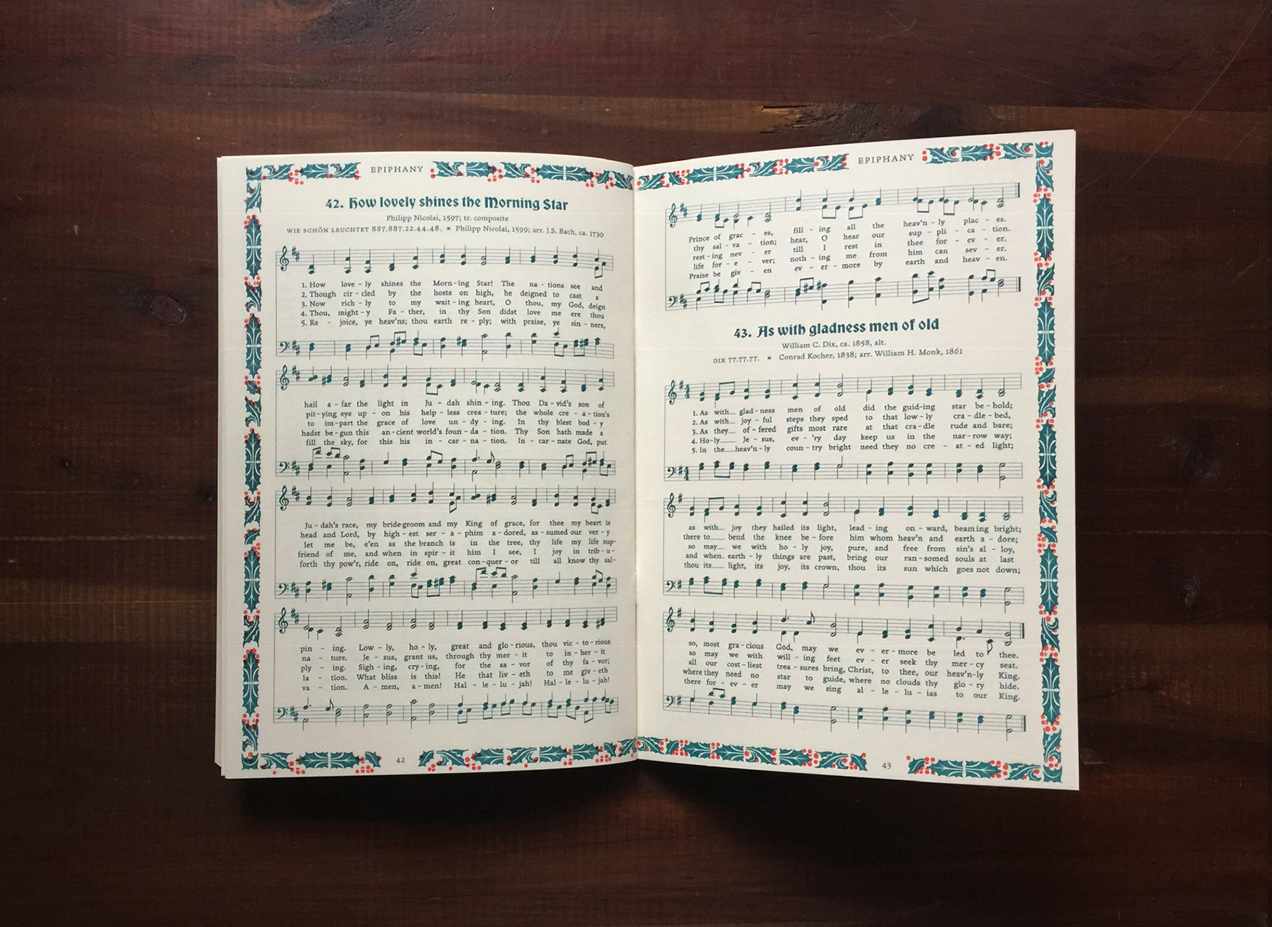This 44-page mini-hymnal for the Christmas season is equal parts practical songbook and objet d’art. As this project was being conceived and designed, David Jonathan Ross’ Font of the Month Club delivered two typefaces (Bradley and Fern Micro) which perfectly fit the incunable/private press movement energy of the piece. Providential!