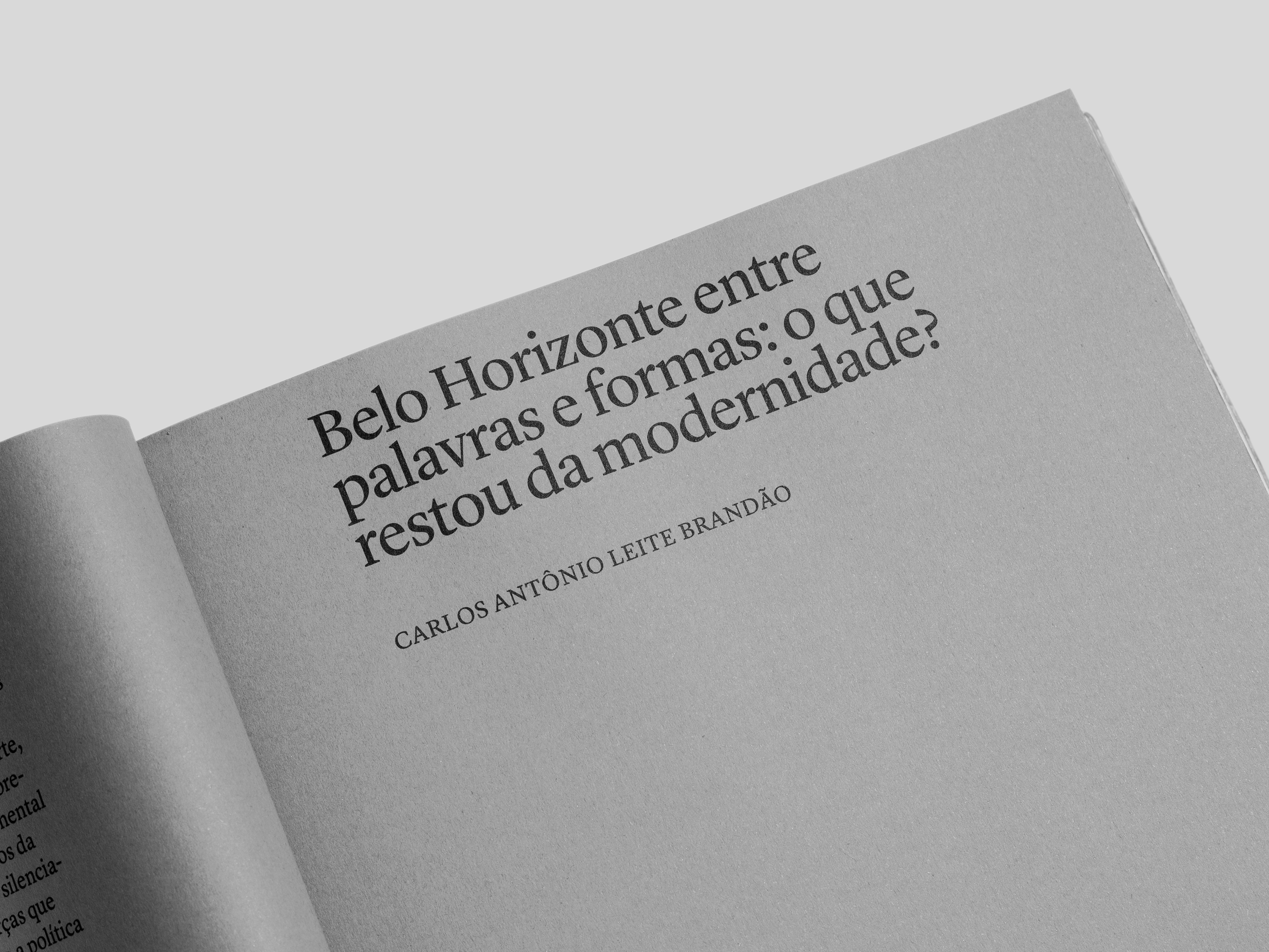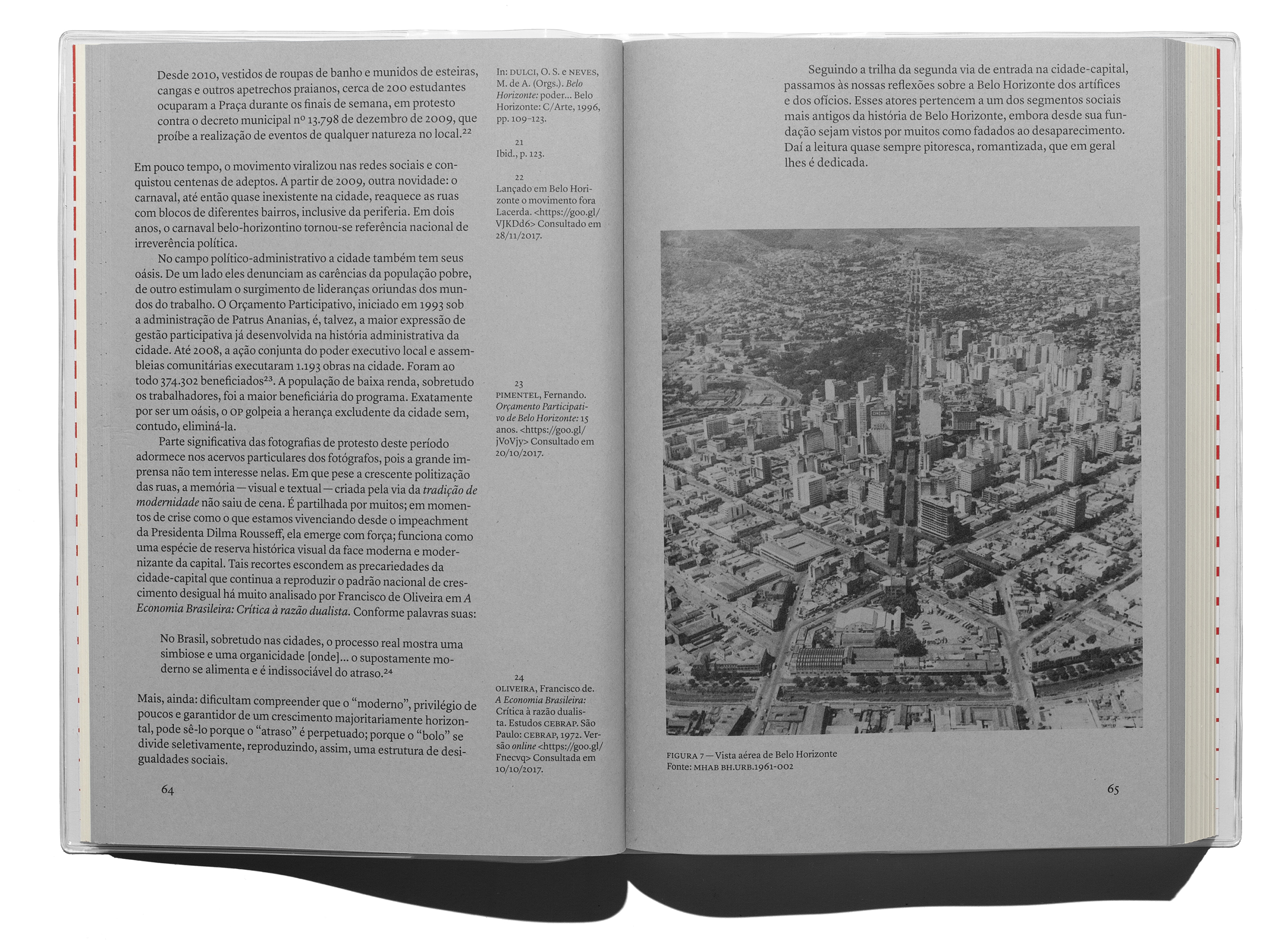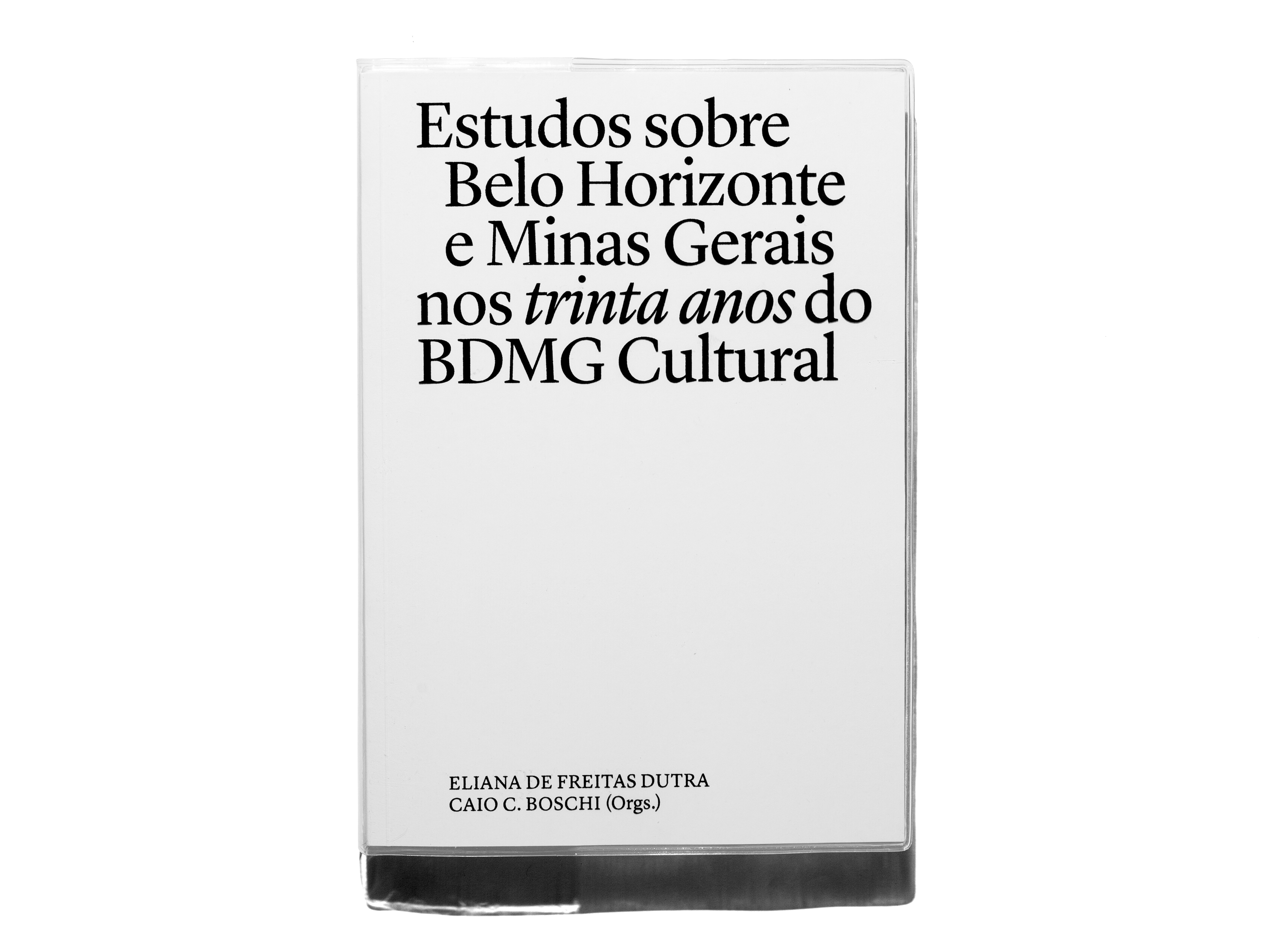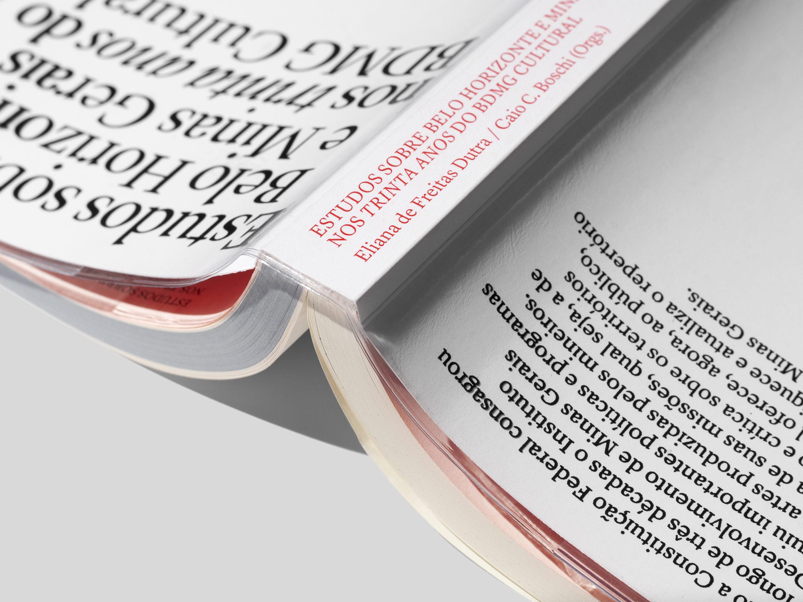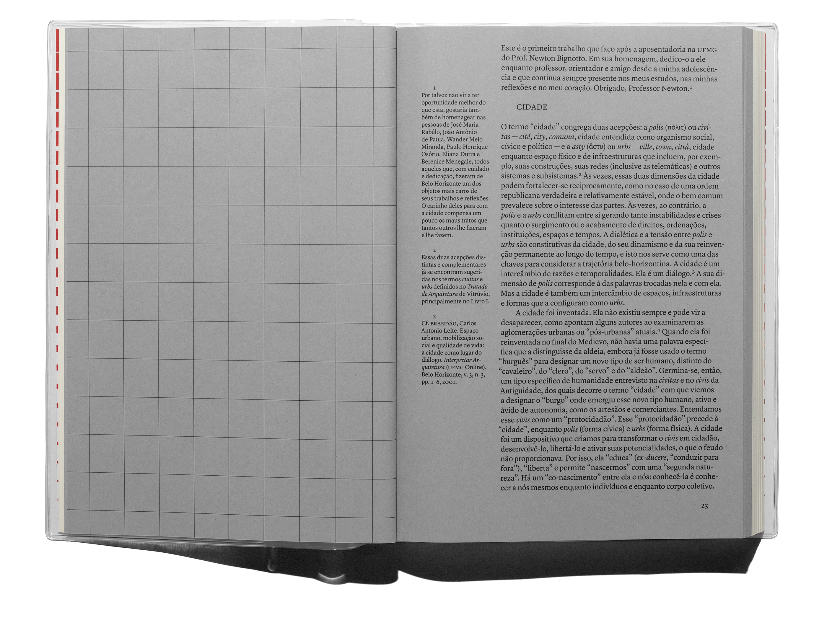 In the context of the BDMG Cultural Institute’s 30th anniversary, this book compiles studies about a diversity of subjects into two sections: the first revolving around the city of Belo Horizonte, printed on gray paper stock; and the second around the state of Minas Gerais, printed on yellowish paper. While each article is introduced by a different kind of ruled paper, content originally written as footnotes was instead treated as sidenotes, making a subtle allusion to marginalia. A plastic dust jacket commonly used on notebooks underlines the book’s nature and protects the object produced to be freely distributed.