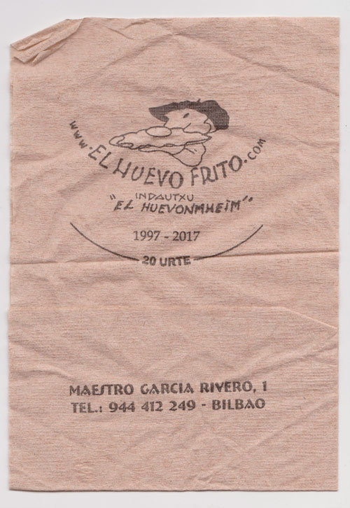 El Huevo Frito napkin Contributed by Iker giveevig on Dec 8th, 2018. Artwork published in 2007. License: All Rights Reserved. El Huevo Frito (“The fried egg”) is a bar in the Indautxu neighbourhood of Bilbao, Spain. This napkin was printed to celebrate its 20th anniversary in 2007. Richard Lipton’s Bremen Bold is used for the address and the telephone number. Typefaces More about BremenGet Bremen Formats Ephemera (1220) Topics Food/Beverage (3062) Tagged withnapkins (23)bars (150)anniversaries (359)eggs (27)job work (210) Artwork location Spain (1053) Bilbao (24) In SetsBonito (Dylan Hussey) (63) Post a comment Name Email – will not be published Website Your response Submit Comment More in Food/Beverage FRISS kombucha2022Studio MonozygoteContributed by Eliott Grunewald Tropicana campaign (2013)2013DDBGustavo CordovaContributed by Dave Rowland Crêperie La Galette, Dresdenc. 2013Contributed by Indra Kupferschmid Sponsor More in Ephemera The Mozart, Salzburgc. 2019Bruch—Idee&FormContributed by Kurt Glänzer Staff Pick Senyor Estudi identity2019Senyor EstudiDaniel GuixContributed by Lluís Serra #lifeasagraphicdesigner campaign2021Scarton StingelinContributed by Kontour Ticketmaster Ticket Redesign Proposal2013Matthew LewContributed by Stephen Coles Staff Pick More Fonts In Use Tobias Frere-Jones website2014Oak StudiosContributed by Caren Litherland Staff Pick RoyalCorec. 2014The RodinaOffice of Hard WorkContributed by Swiss Typefaces Staff Pick Up-side Down2022Zaynab KriouechContributed by Zaynab Kriouech Staff Pick Yeoboseyo Namaste poster2019Shivani ParasnisContributed by Shivani Parasnis Staff Pick Bien Urbain 20232023Studio Champ LibreContributed by studio champ libre Staff Pick Quarter Gin identity and websitec. 2021Duzi StudioContributed by Jamie Otelsberg (OH no Type Co.) Staff Pick Fantastique Gustave Doré by Alix Paré & Valérie Sueur-Hermel2021Bureau BergerBenoit BergerContributed by Benoit Berger Staff Pick First Street Foundation2024View SourceContributed by Rutherford Craze Staff Pick