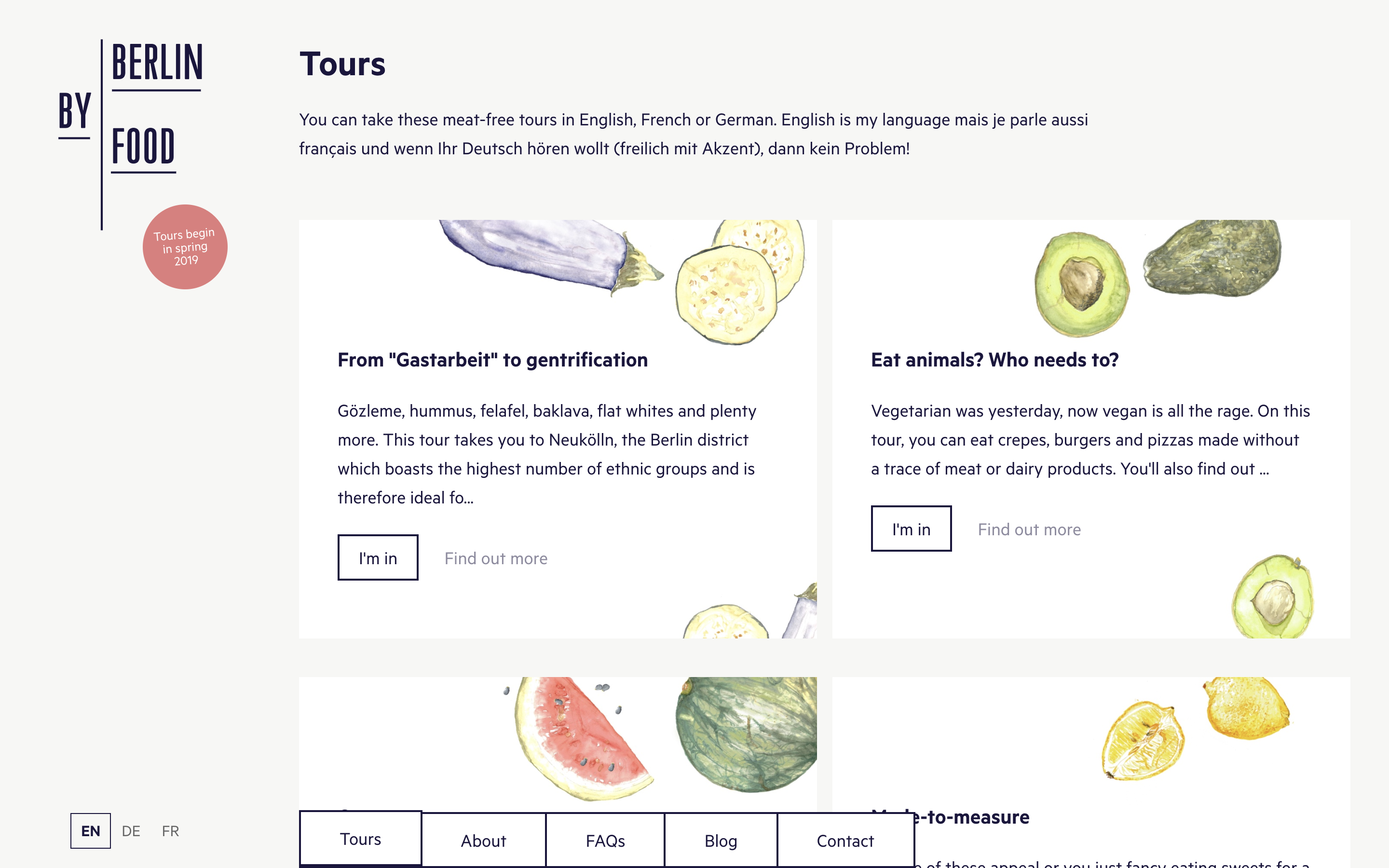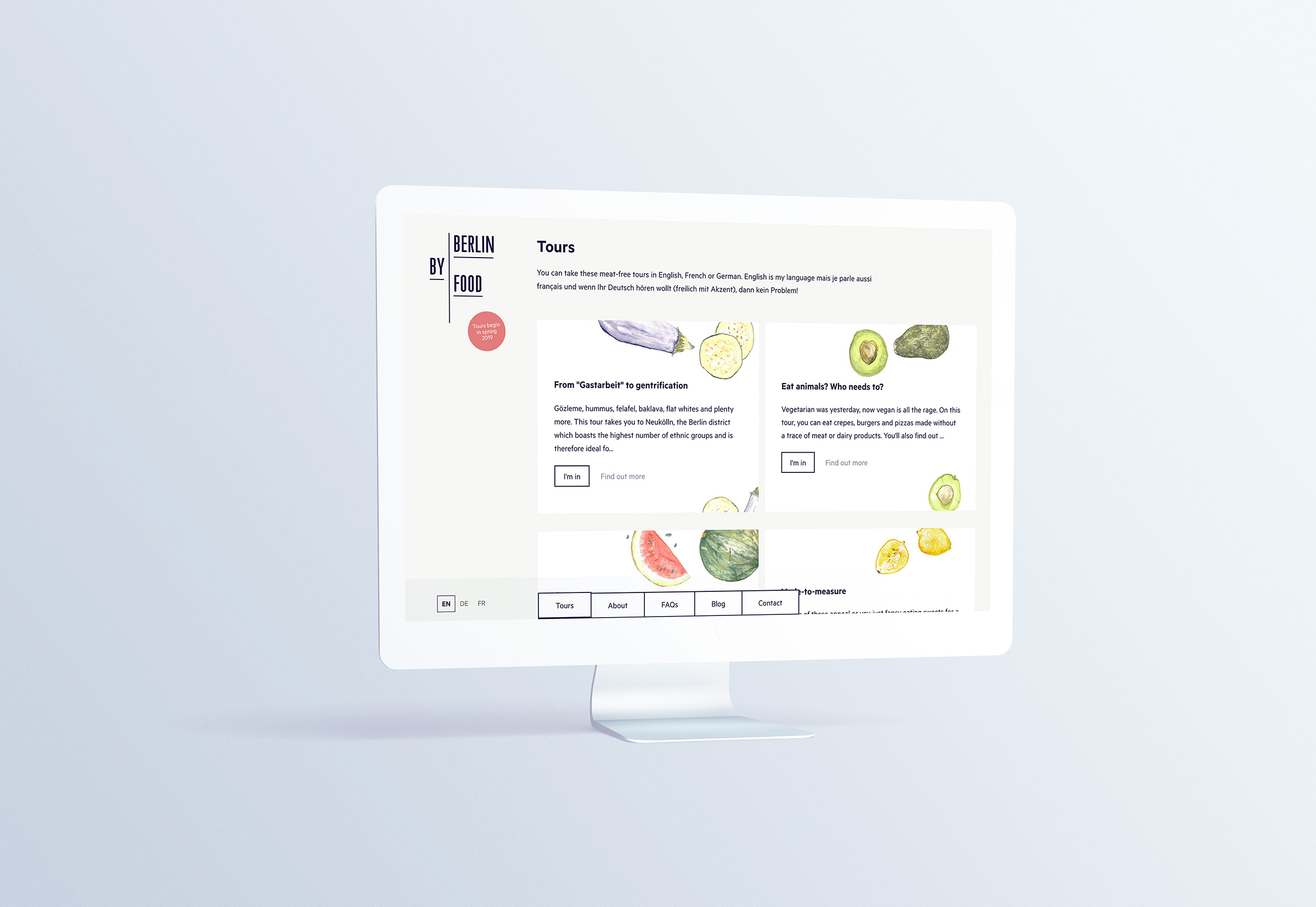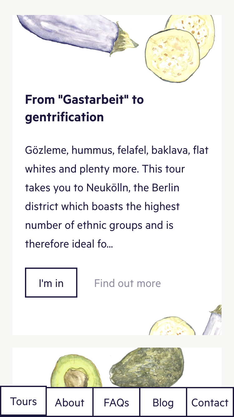 The website’s text is set in Metric (Klim Type Foundry), a typeface inspired by Berlin street sign typography. The logo, as well as the lined-white-box visual language, also refer to street signage and wayfinding. Intertwined in this is a colourful set of watercolour illustration as well as rich photography, highlighting the diverse ingredients found in Berlin, originating from different cultures, from east to west.