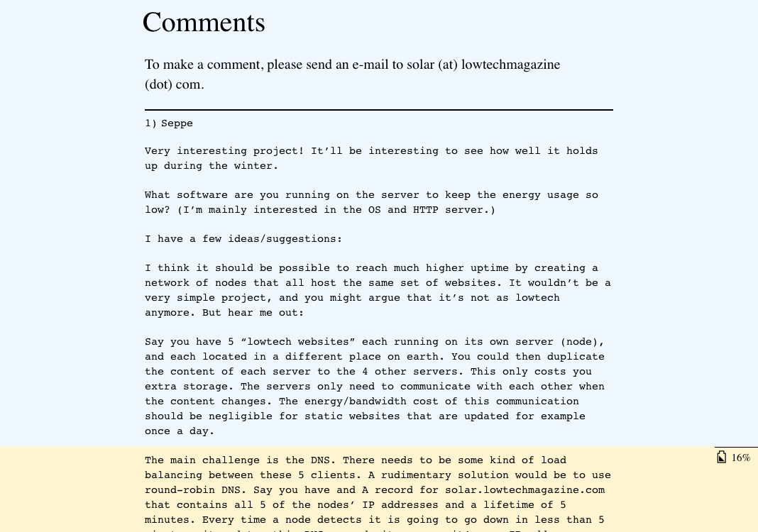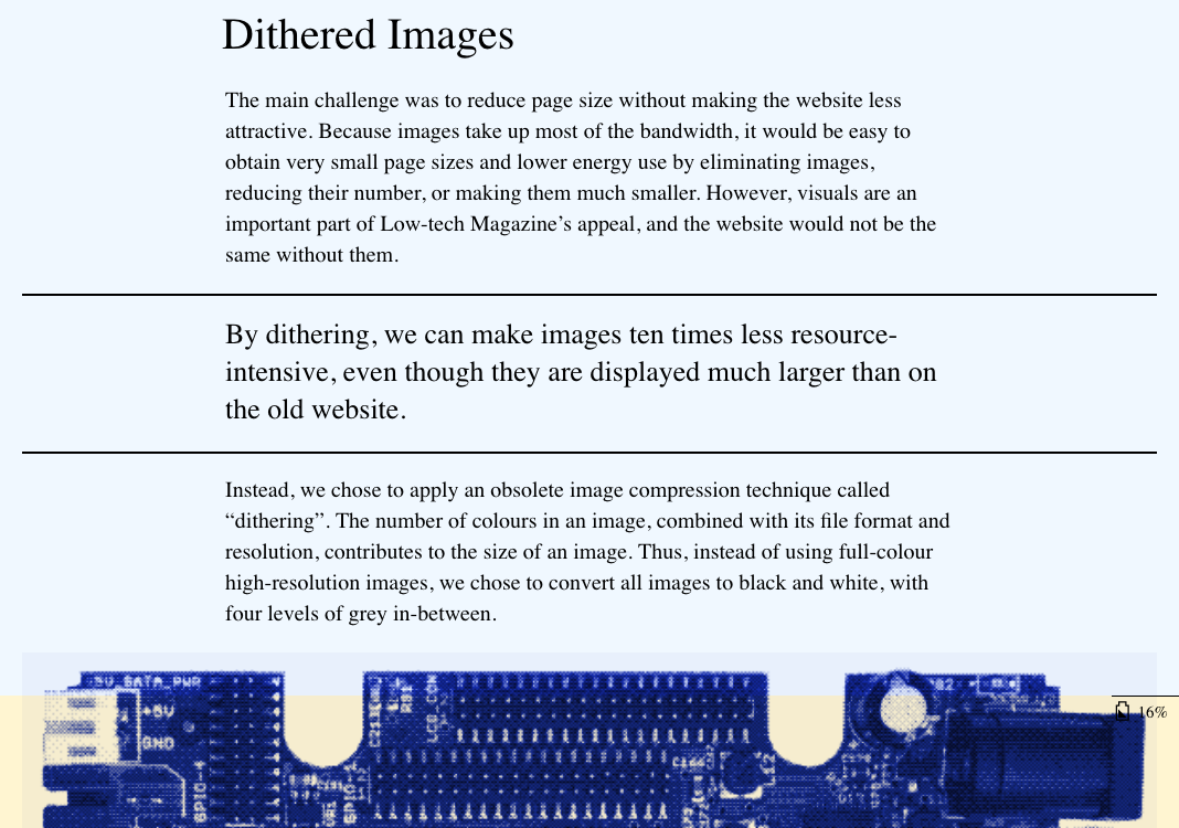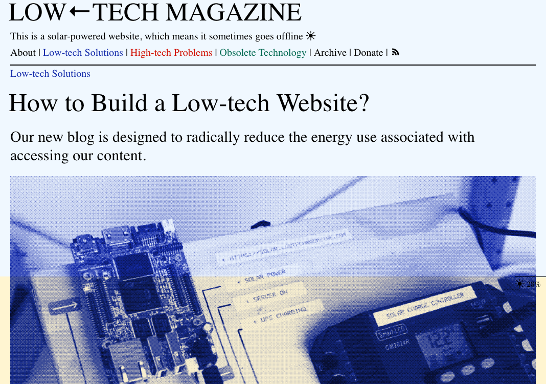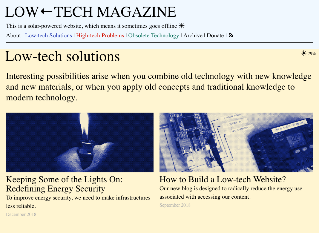 Low-tech Magazine was born in 2007 and has seen minimal changes ever since. Because a website redesign was long overdue — and because we try to practice what we preach — we decided to build a low-tech, self-hosted, and solar-powered version of Low-tech Magazine. The new blog is designed to radically reduce the energy use associated with accessing our content. — Low-tech Magazine