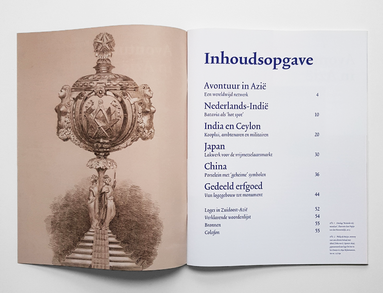 An assignment with a touch of mystery… Avontuur in Azië (“Adventure in Asia”) is an exhibition catalogue/magazine about freemasonry as a worldwide social network since 1734. The content has many layers: images, captions and different types of texts are presented as well as possible, with a fresh look and a pleasant hierarchy. Each chapter has its own color and a square can be discovered on each spread.