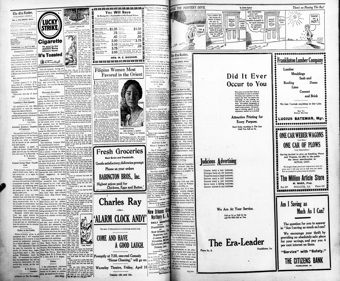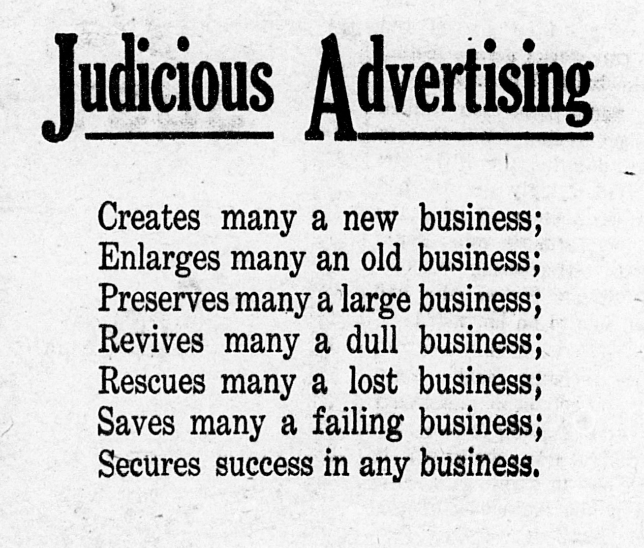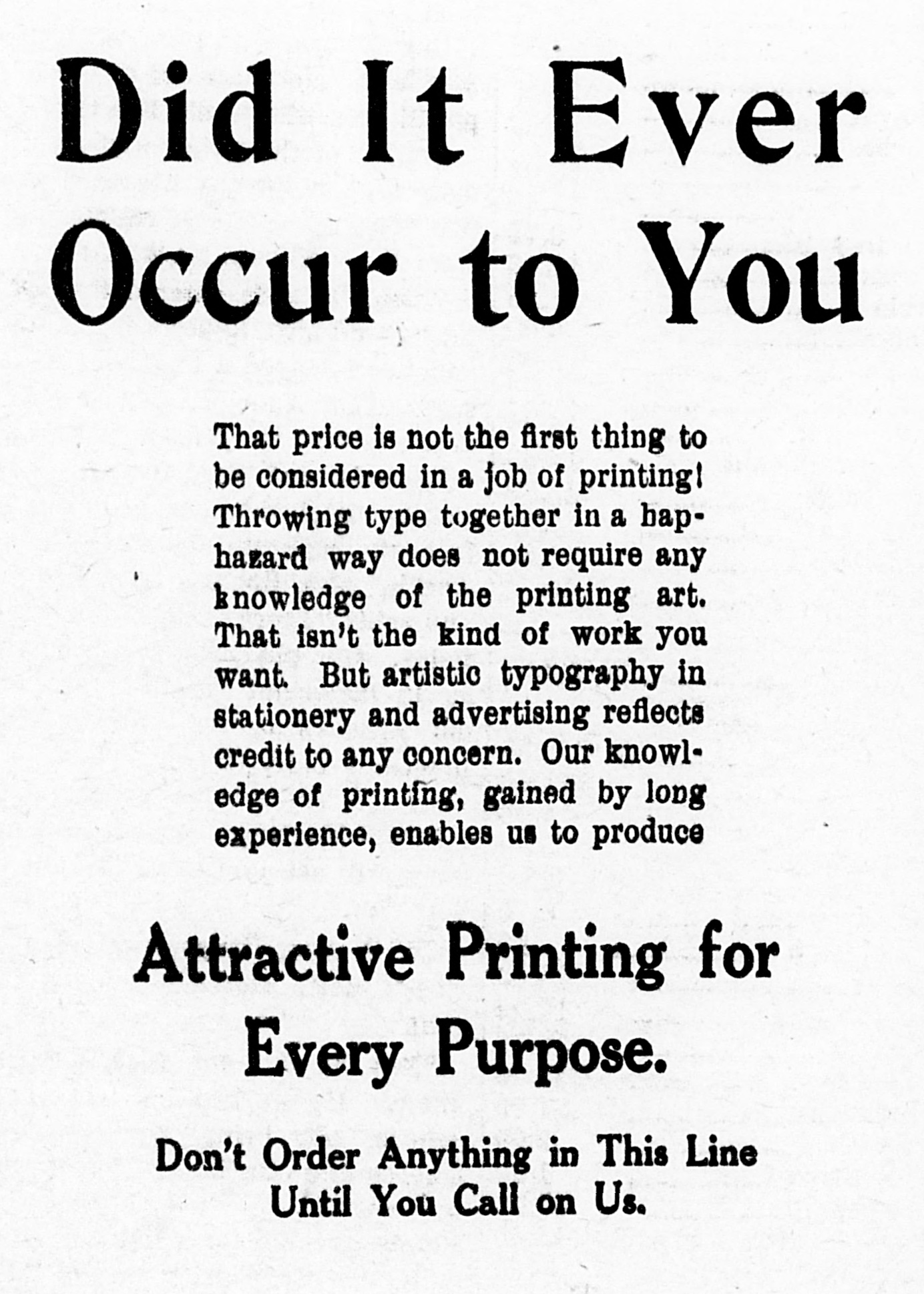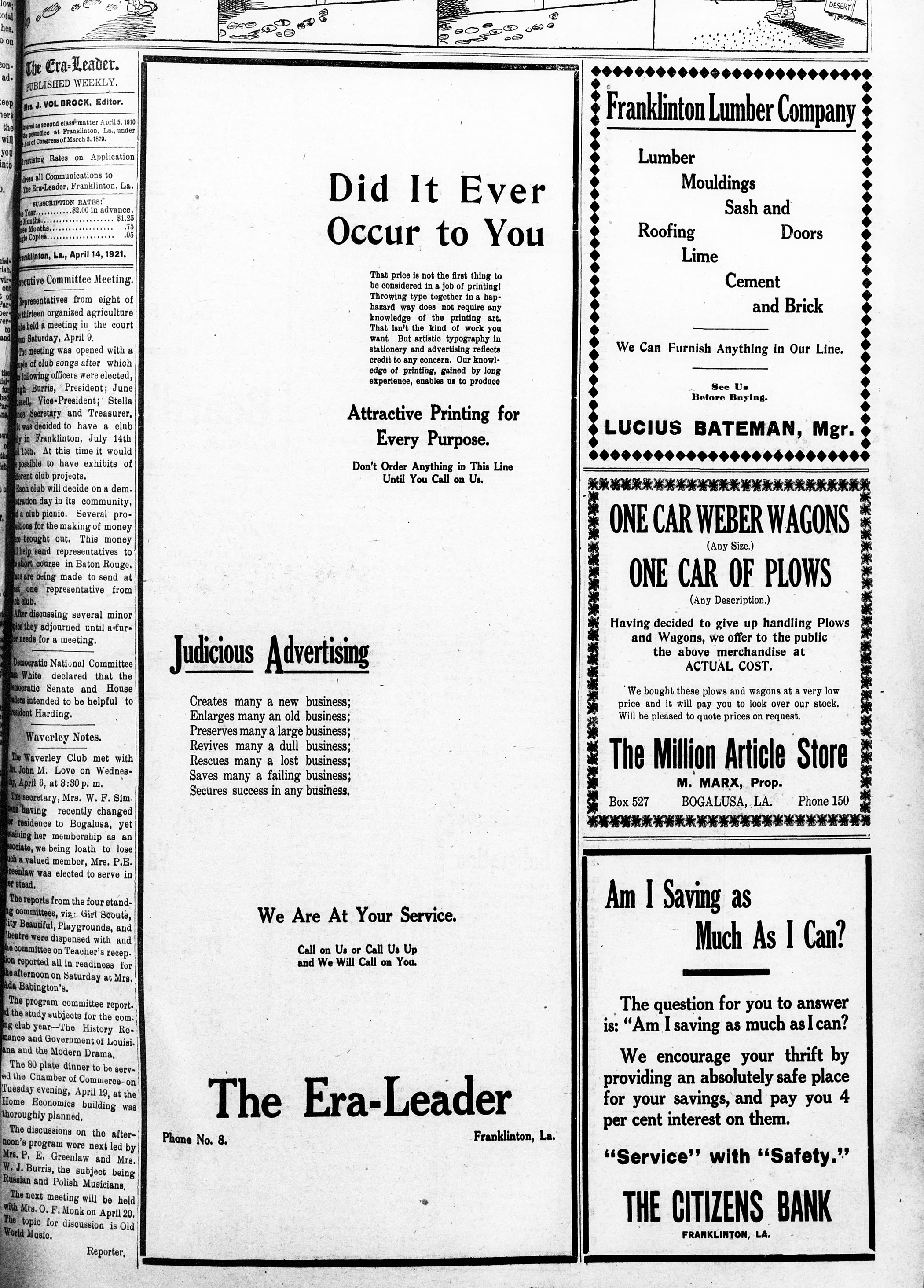 This ad from The Era-Leader of Franklintown, Louisiana features an unusually modern layout for 1921. While the engaging use of negative space and asymmetrical layouts became quite common 20–30 years later, it was quite rare to find such generous emptiness in the dense newspaper pages of the time. It has quite a powerful effect.