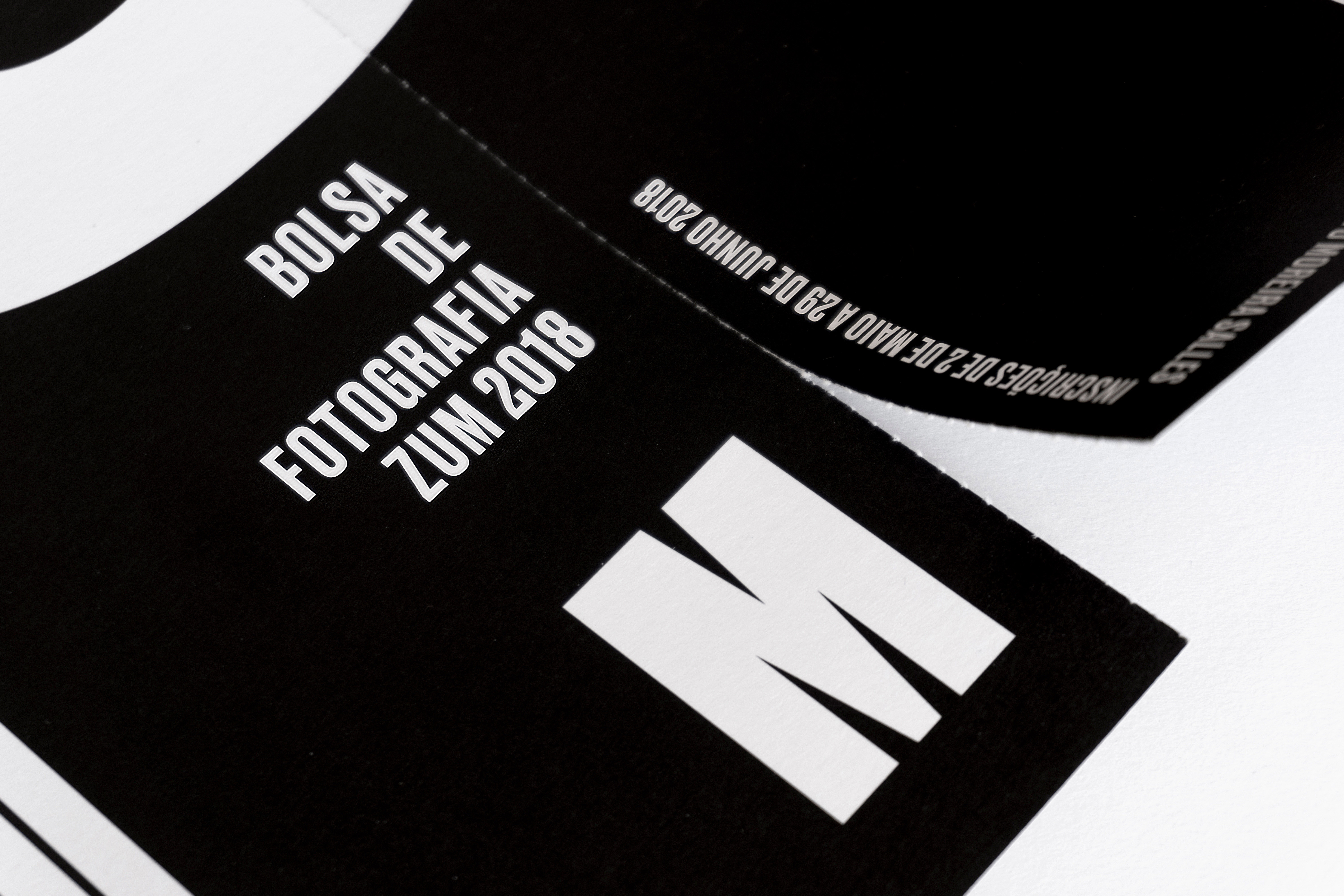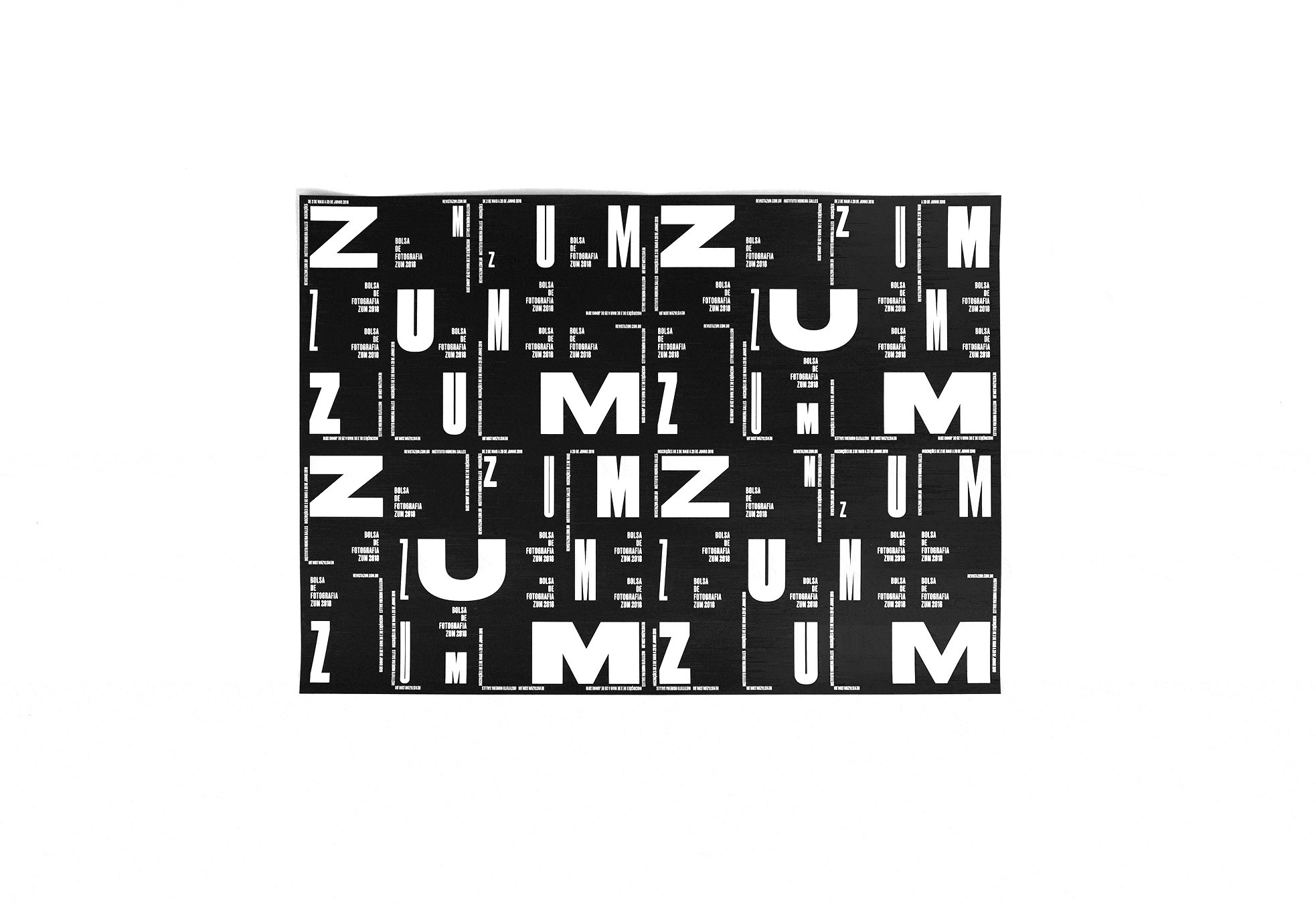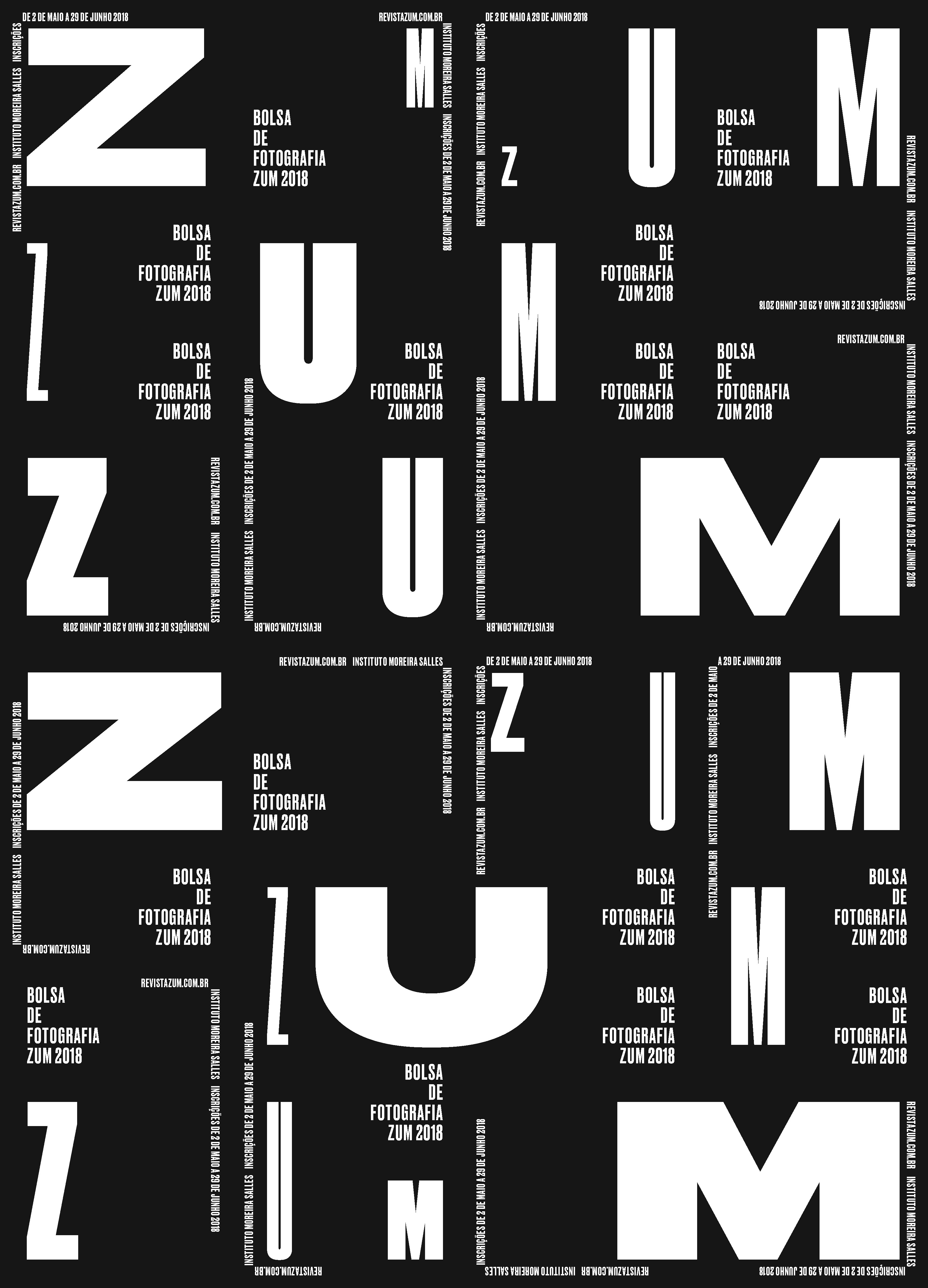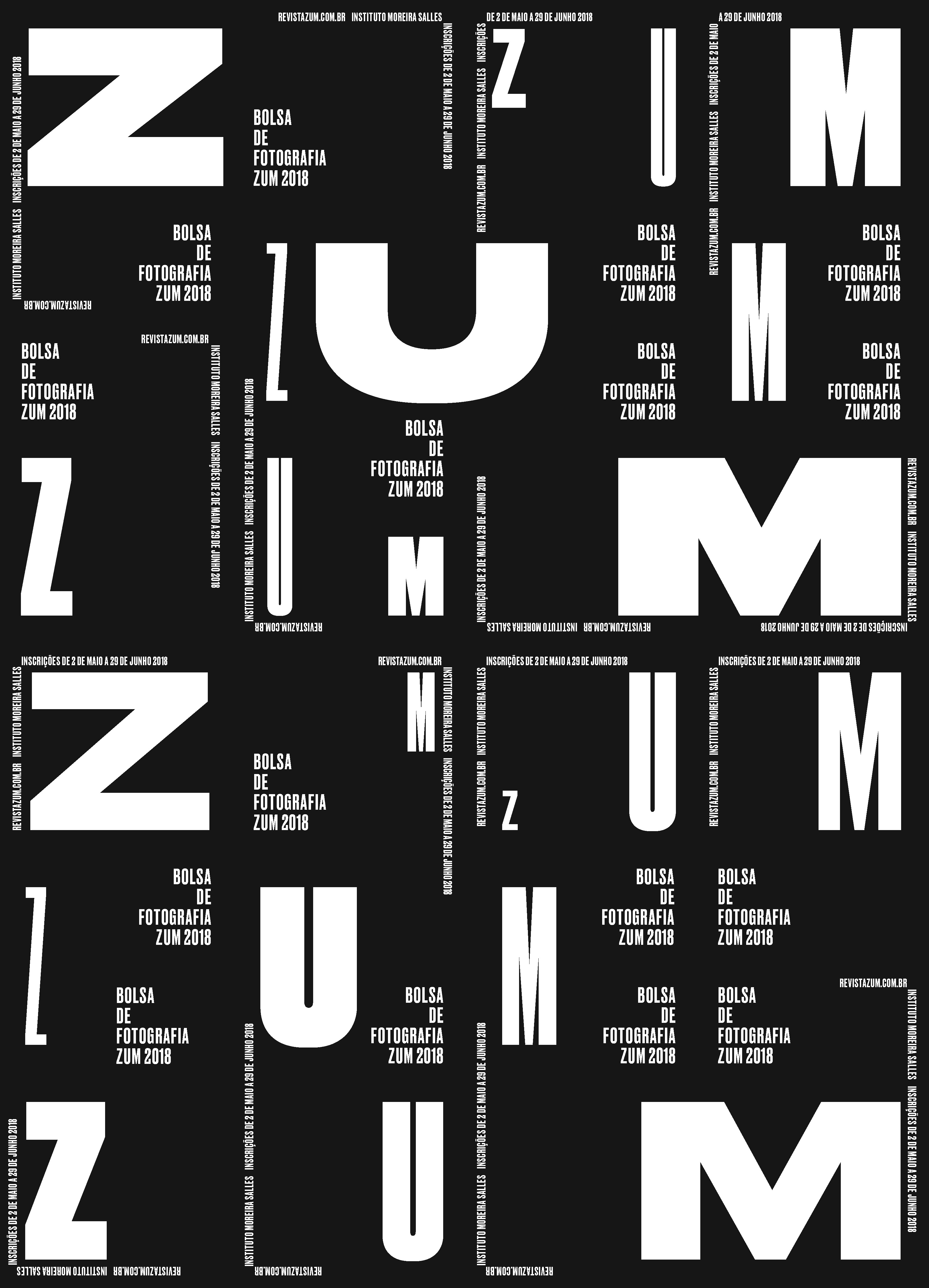 For the promotion of the ZUM 2018 Photography Grant, supported by the Brazilian contemporary photography magazine of the Instituto Moreira Salles, a large typographic poster was created with texts at different sizes, all set in Druk. On the original 88×61 cm (35″×24″) poster, a grid of perforated lines allows the derivation of pieces in various formats, from smaller posters to postcards. In each module, the information is repeated in different arrangements, so that all pieces, regardless of size or format, carry the same content as the others. The concept was a typographic scale play with the name of the photography magazine zum [already a Portuguese word-play with the English word zoom] and it was also used in digital communication, such as social media posts and even a cinema vignette.