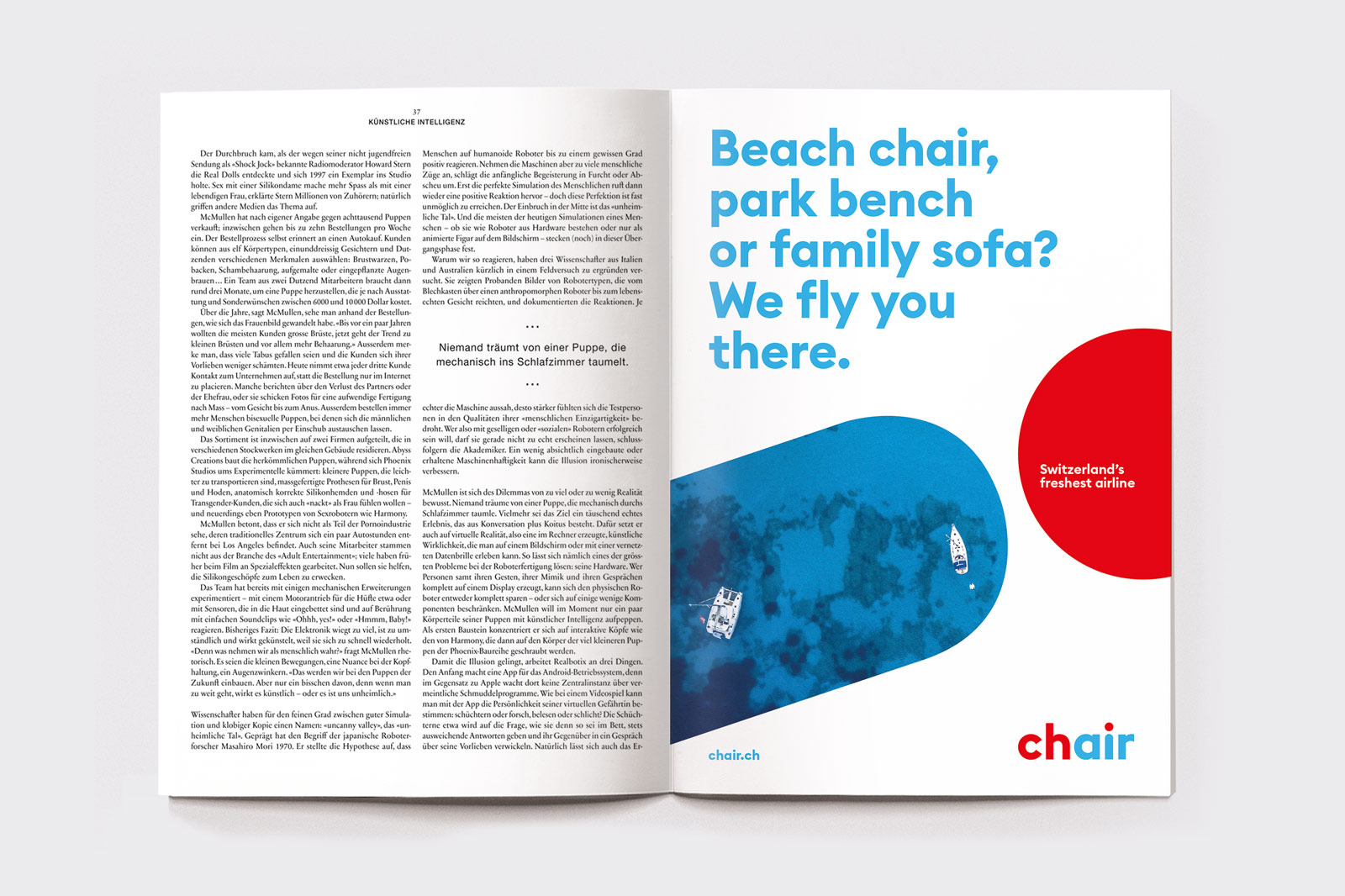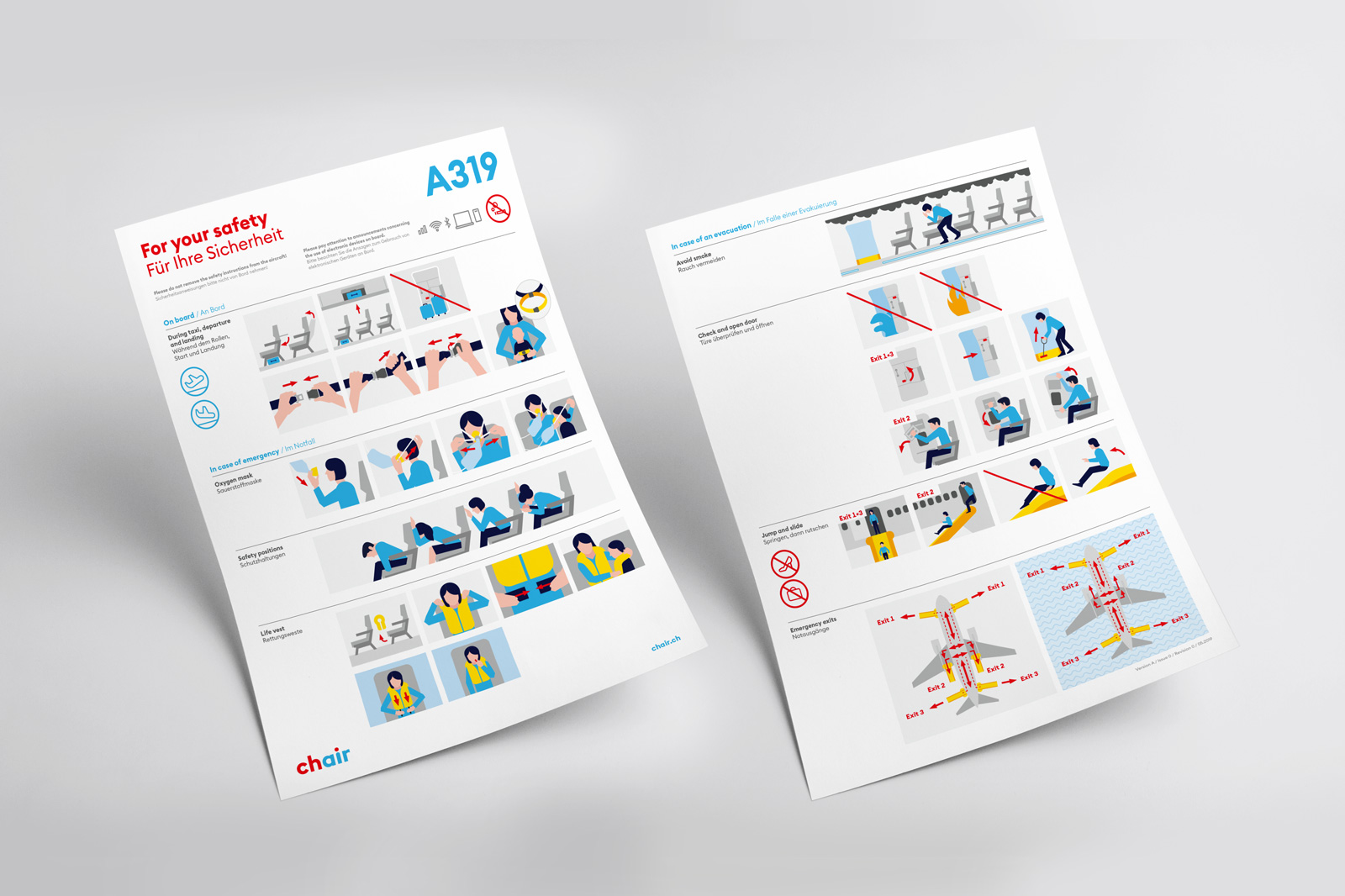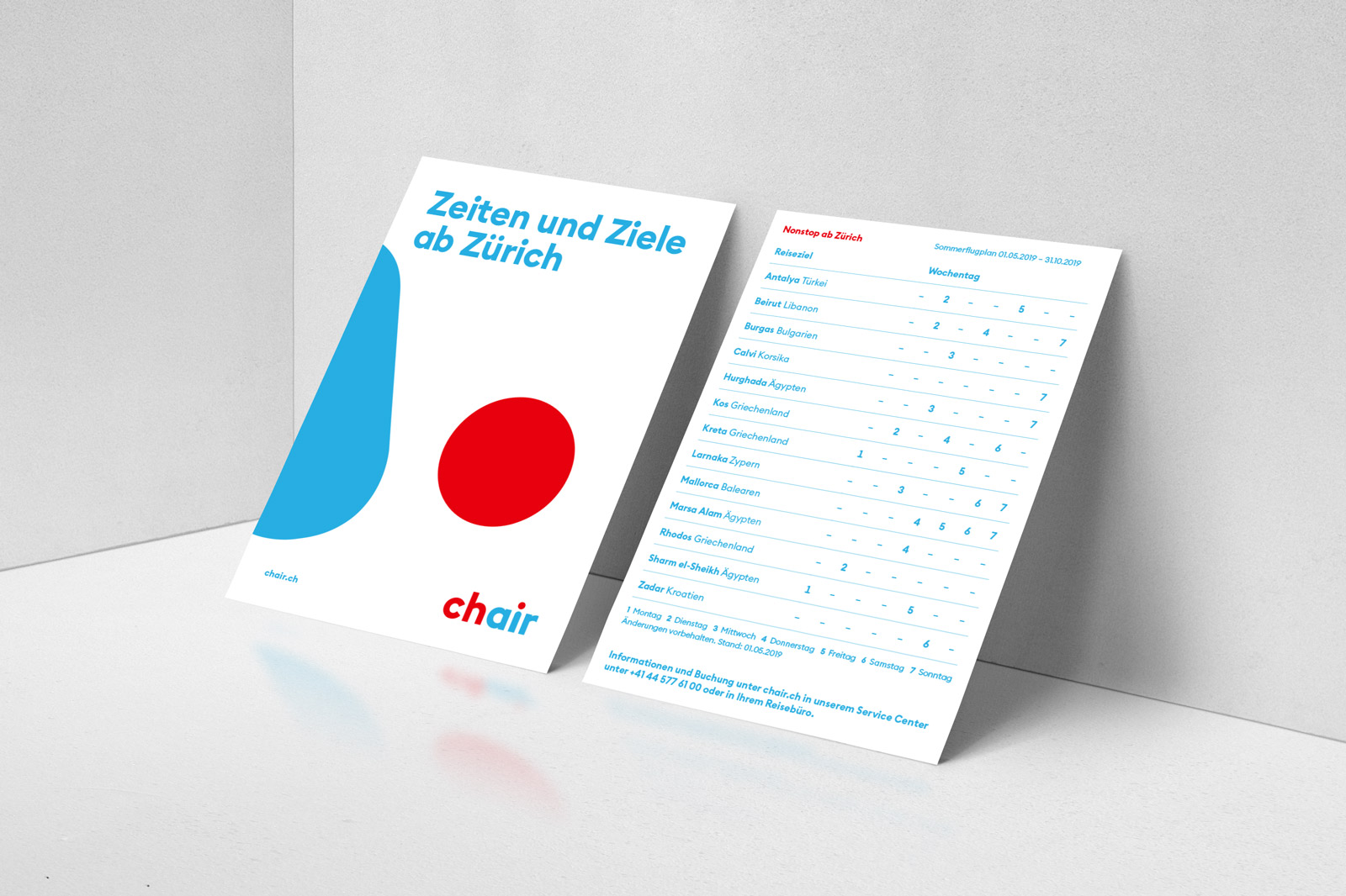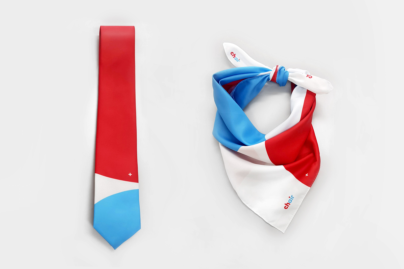 Zurich-based branding agency Branders took care of the new identity, from naming to visual communication. The new name is the first thing that strikes: Chair. It’s fun and quirky in an industry where company names are usually very serious. Chair stands for the actual seat that customers book for their flight, but it’s also a play on words as CH is the two-letter country code of Switzerland (standing for the Latin name Confoederatio Helvetica) and Air represents the airline. This is enhanced by the dynamic color scheme, a peppy red and a bright blue, used in the wordmark.