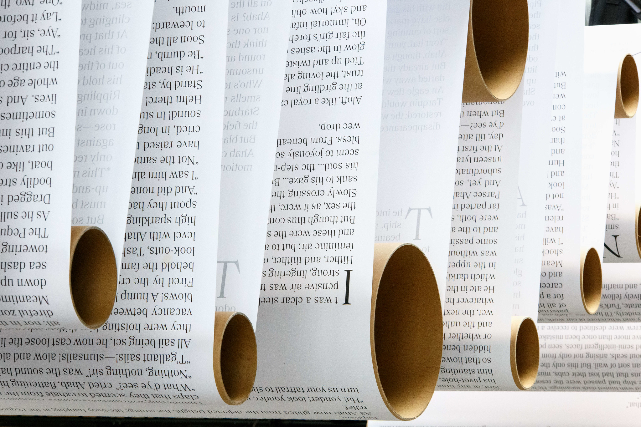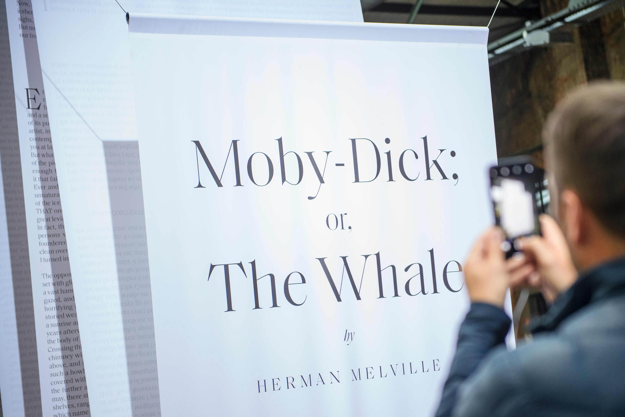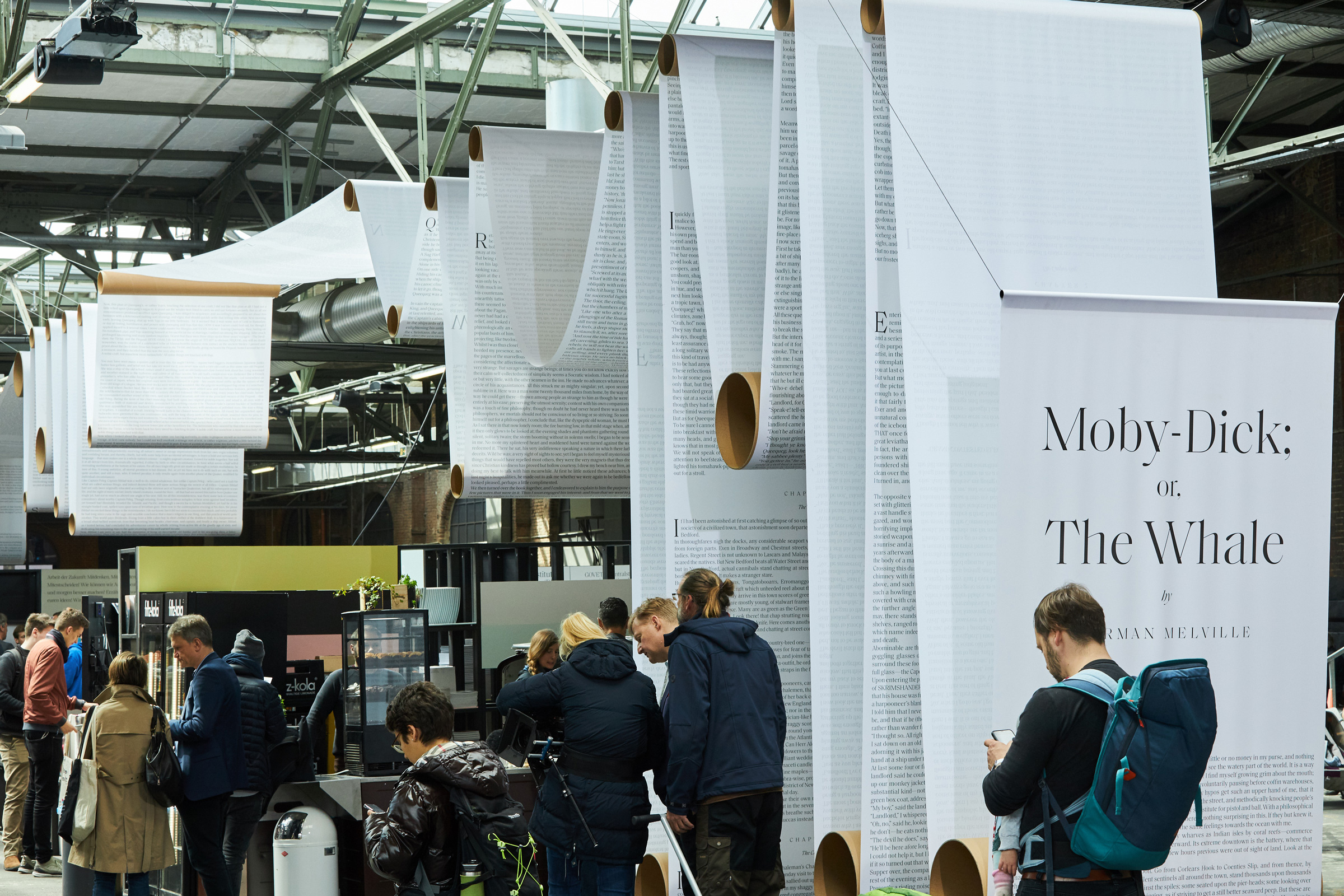 At the heart of the re:publica19 venue at Station Berlin was an installation with a 450 m long paper web. It held the complete text of Moby Dick, “a book which few have read but many think they know what it is about”, according to fertig design.