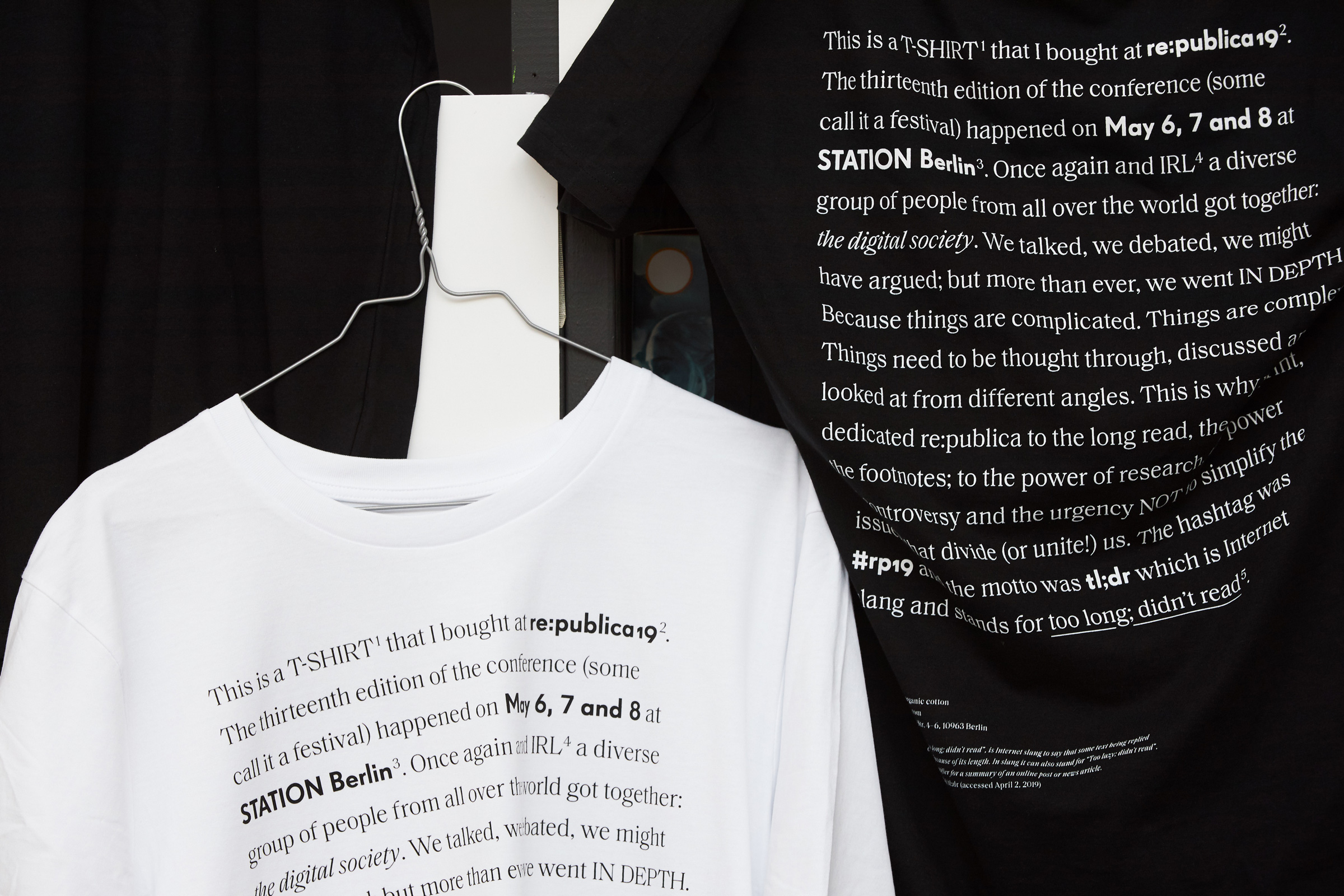 The type-centric identity was designed by Berlin-based studio fertig design. In a tongue-in-cheek reference to the theme, many of the items like T‑shirts, lanyards, or tote bags featured longish self-referential description texts. Norman Palm of fertig design comments on the type choices: