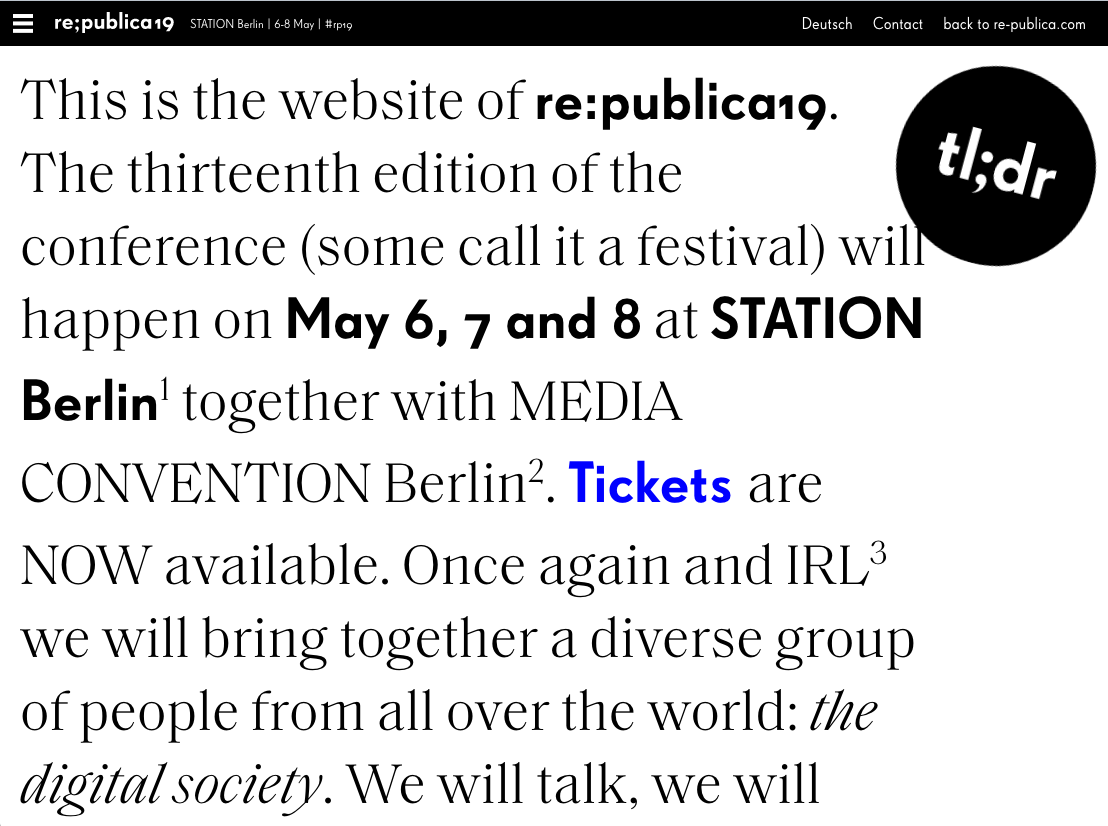 Saol and FF Super Grotesk are the typefaces used for re:publica19. The thirteenth edition of Europe’s biggest conference for the digital society took place in May. This year’s theme was tl;dr – too long; didn’t read.