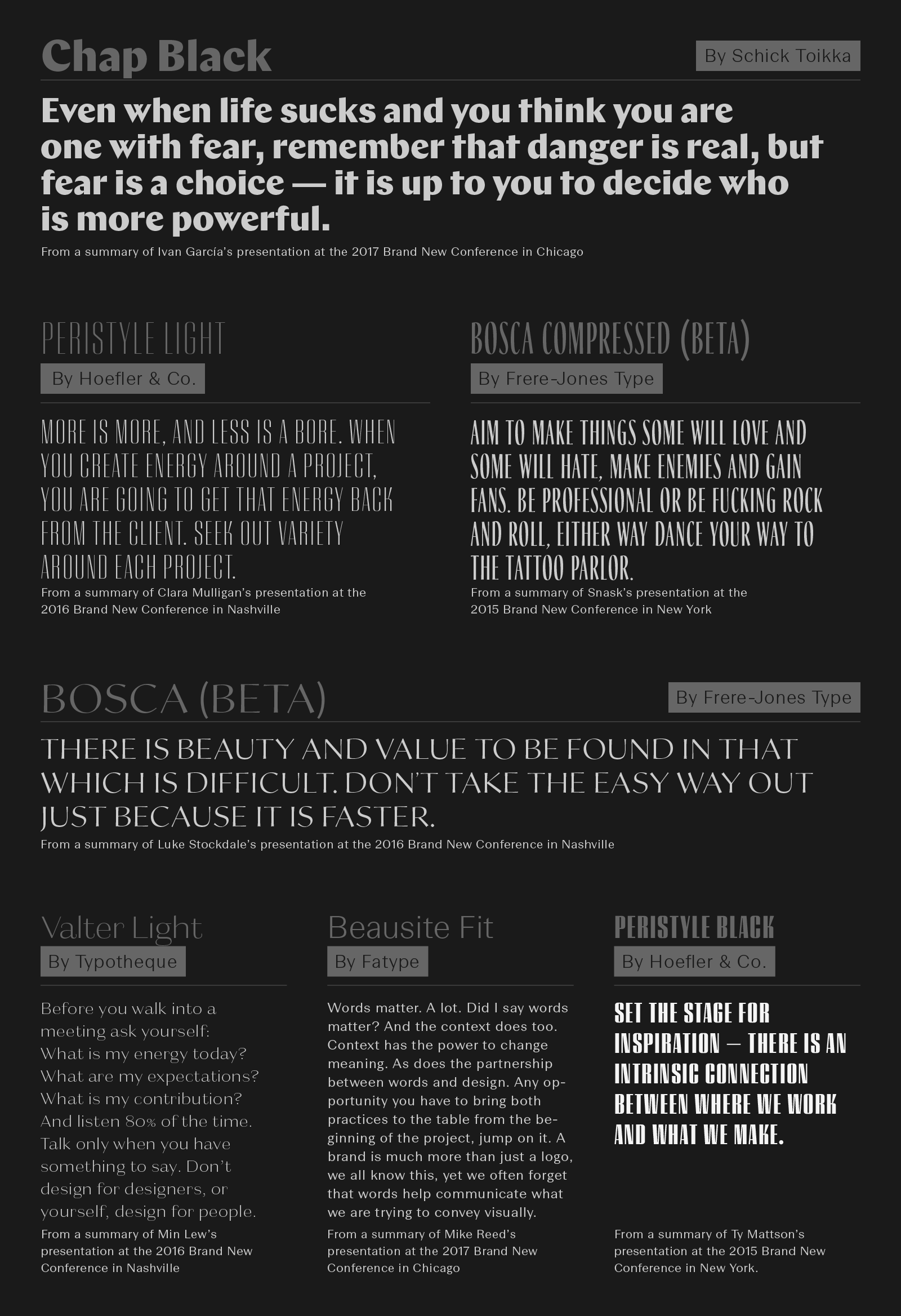 One style that we thought we could expand on is the high-contrast sans serif with its calligraphic/chiseled structure. As a way to further channel the cacophony that New York can be we decided that instead of choosing just one font or type family we would use a bunch of high-contrast sans serifs together. We chose Chap (Black to be specific) from Schick Toikka as the primary font and we added Hoefler & Co.’s Peristyle, Typotheque’s Valter, Fatype’s Beausite, and Frere-Jones Type’s Bosca and Bosca Compressed — that are not yet available but we got to take out for a trial spin.
