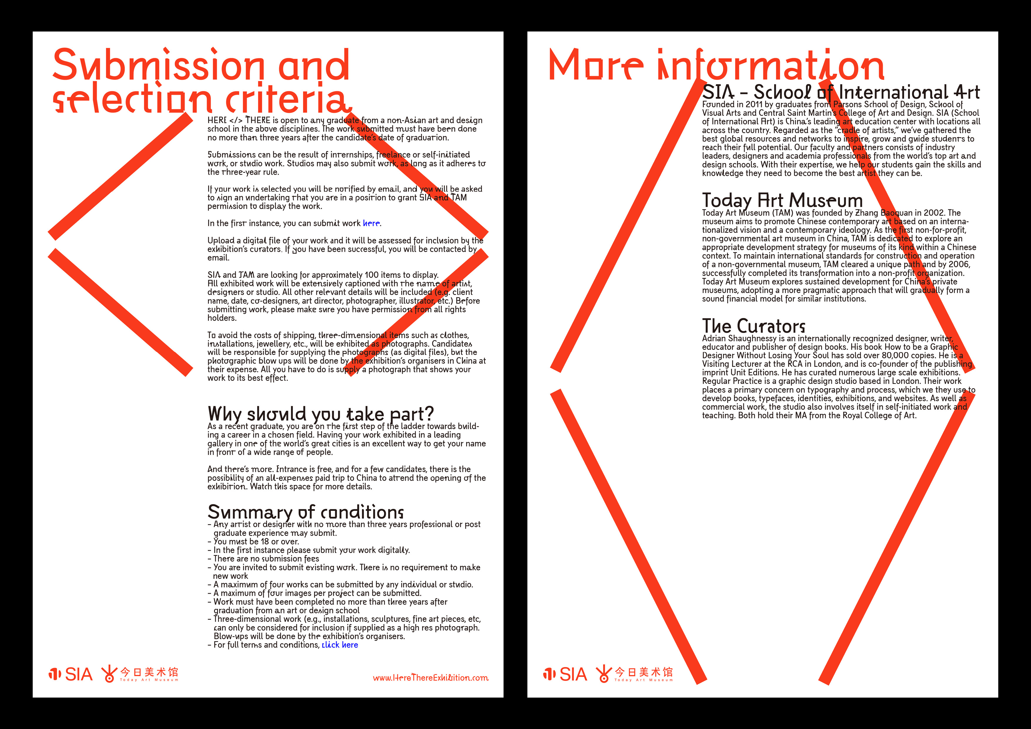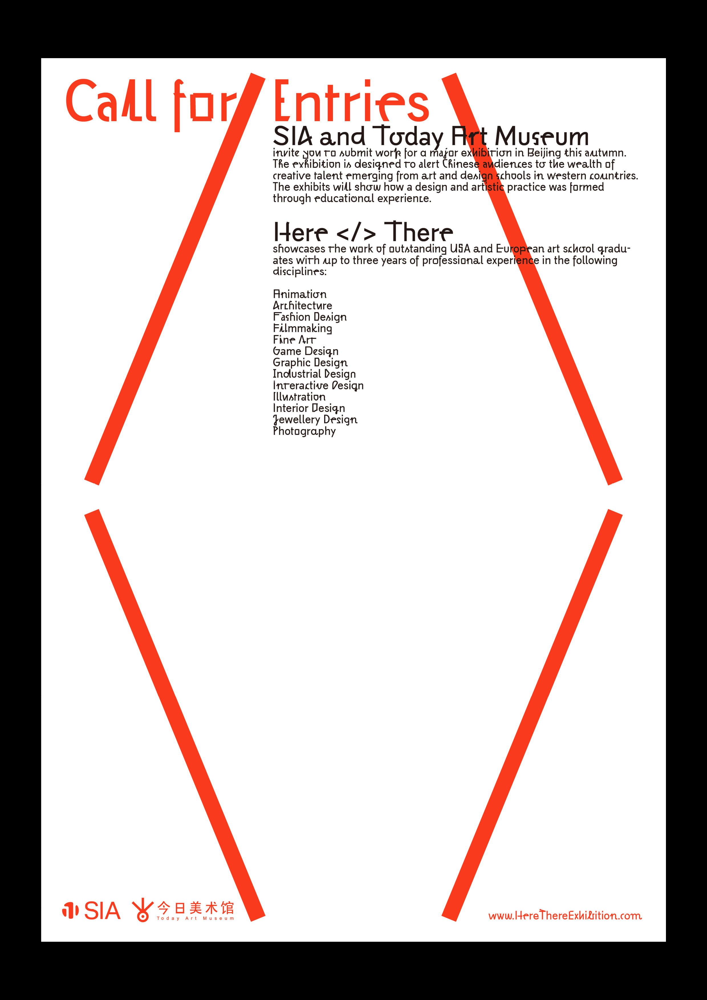 Here>There is an exhibition featuring recent design and art graduates-come-professionals, who have attended and graduated from design and art institutions in the USA and Europe. It was curated by Adrian Shaughnessy and Regular Practice. Organized in collaboration with SIA – School of International Art, it is held at the Today Art Museum in Beijing, the first private museum for contemporary art in China.