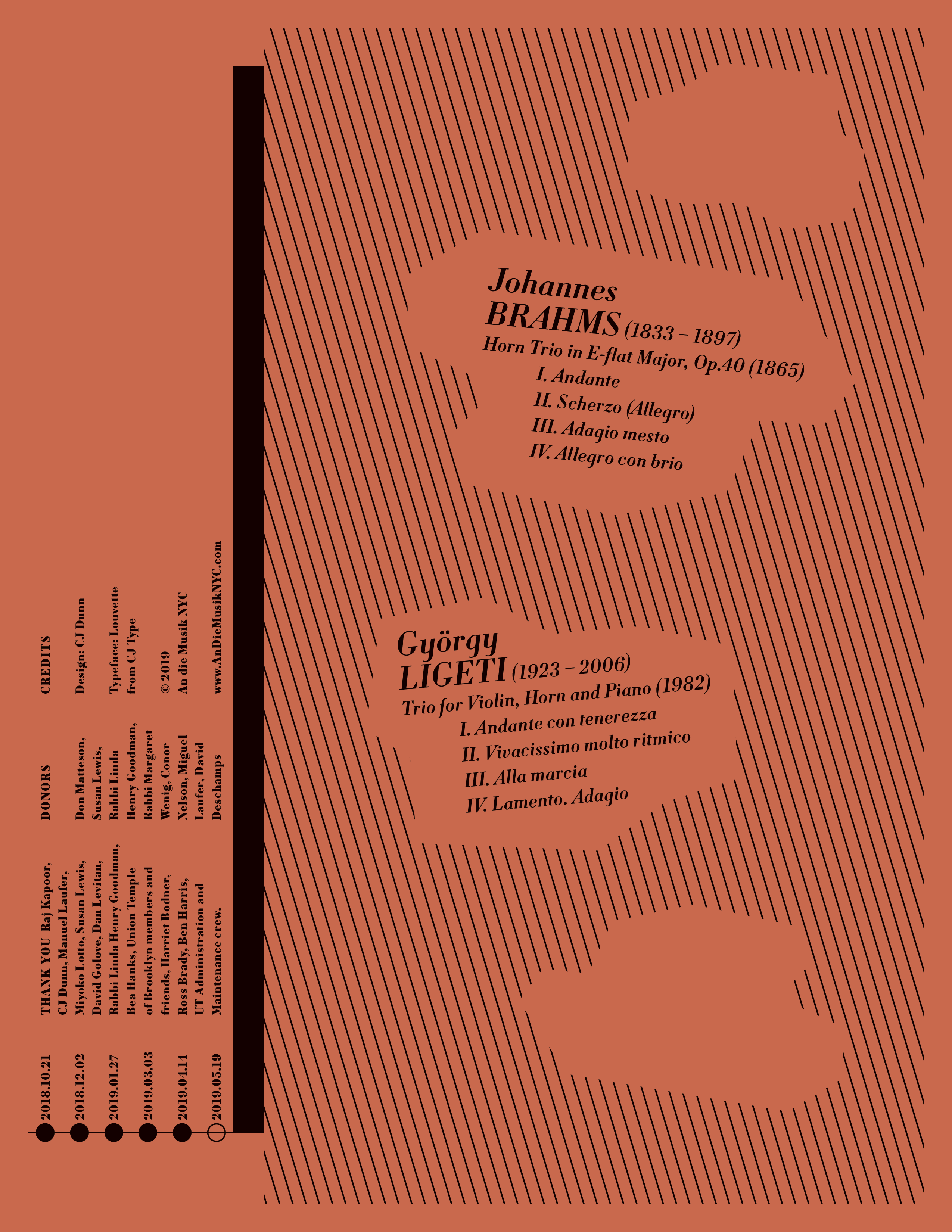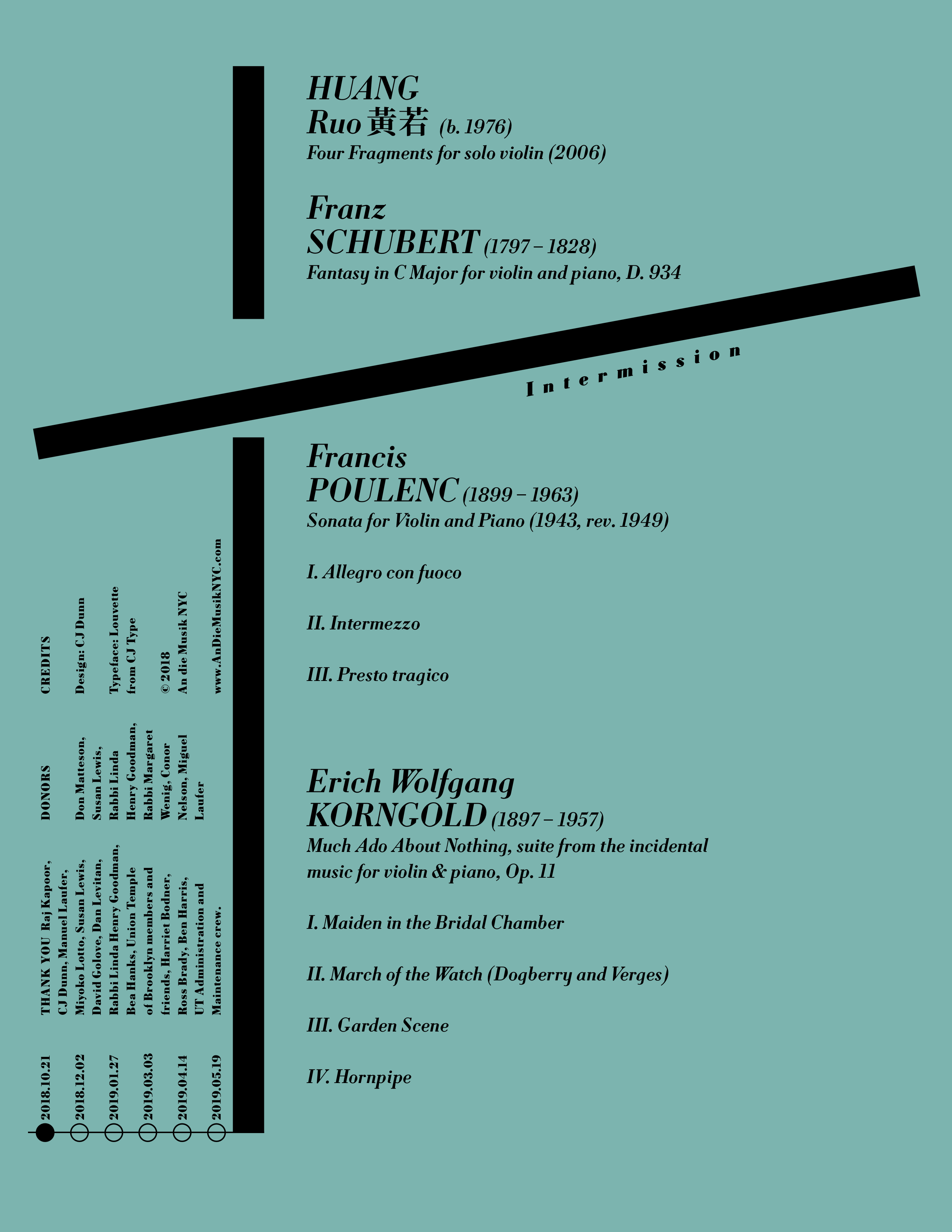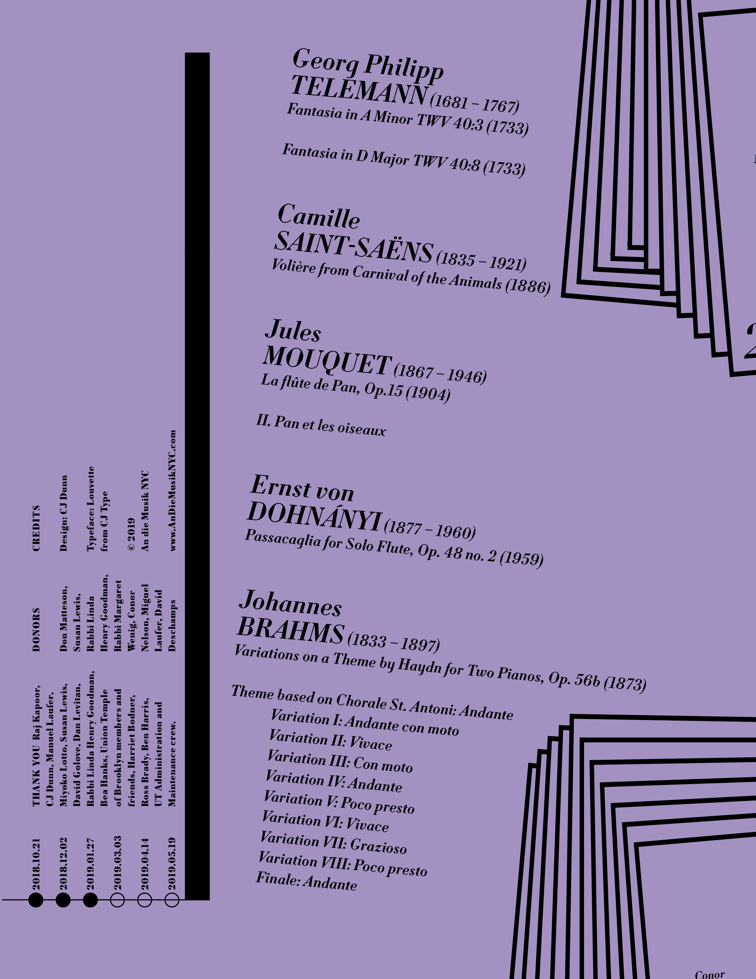 The 2018–2019 season makes use of Louvette’s optical sizes and weights, with the Italic Banner and Display used for the composer names and dates, down to the Text styles used for performer names, bios, and supplemental information. The concert program use of Louvette Deck for composer name, with song titles and movements set in Louvette Text. The opening concert poster, which features works by Huang Ruo, makes use of Source Han Serif for Huang’s name in Chinese, scaled to a smaller point size to harmonize with Louvette.