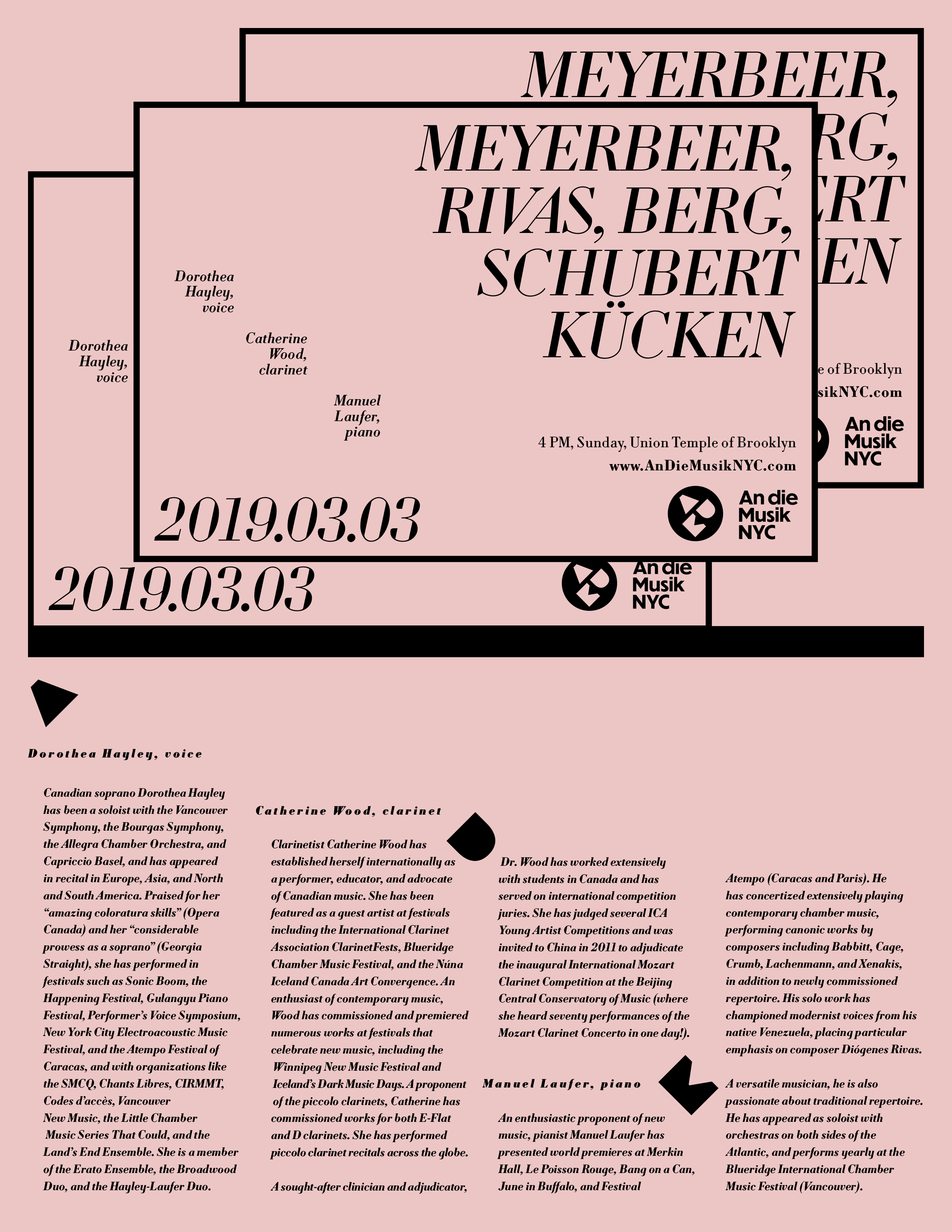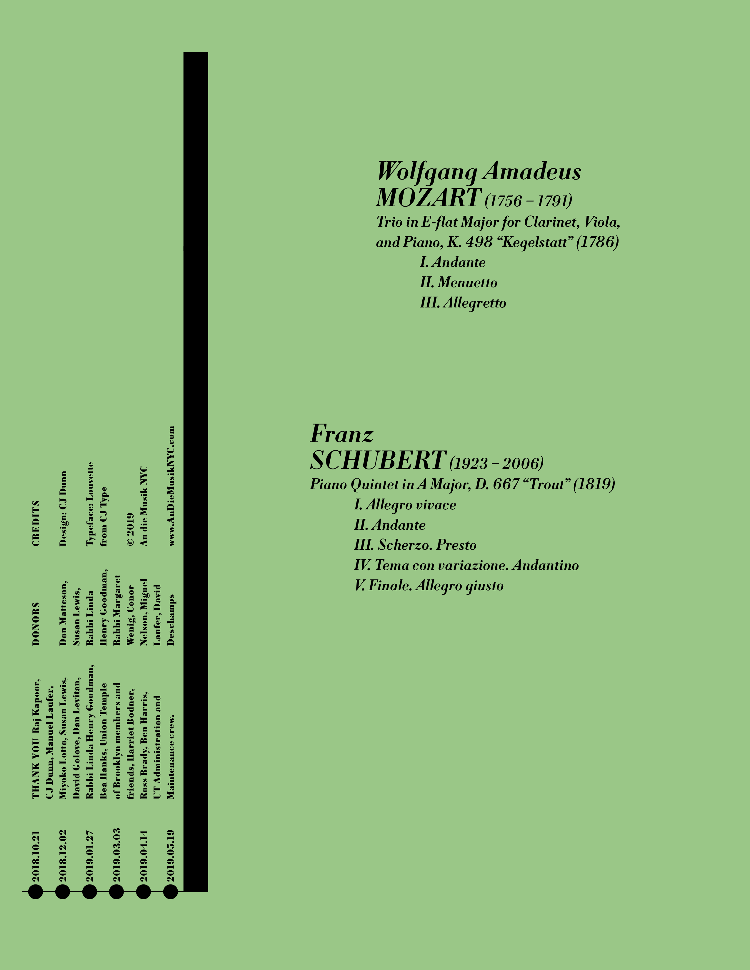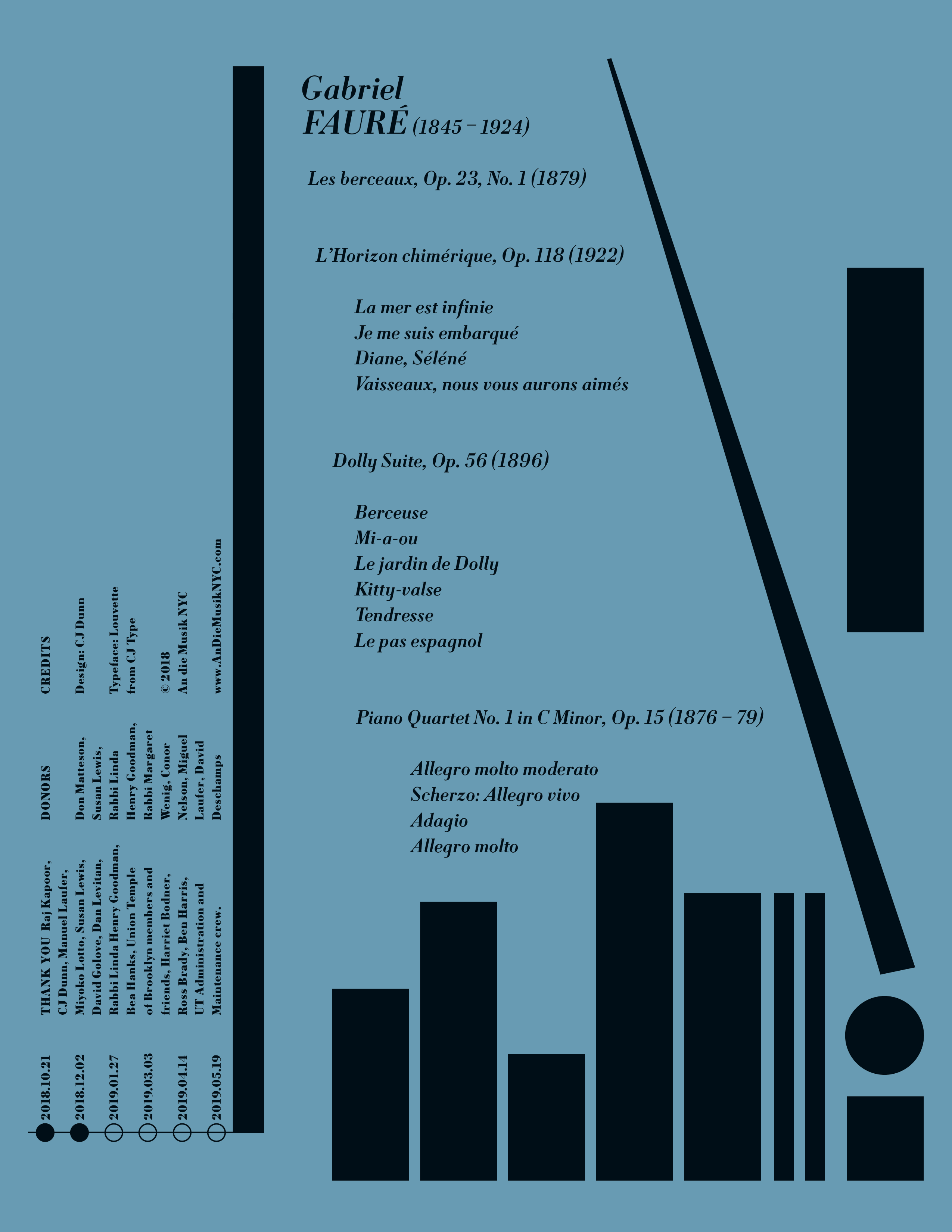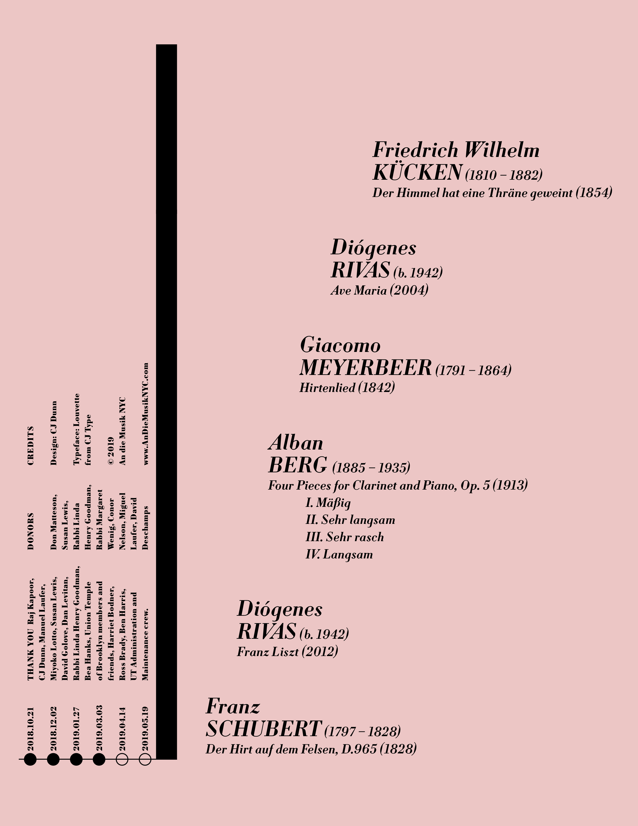 The 2018–2019 season makes use of Louvette’s optical sizes and weights, with the Italic Banner and Display used for the composer names and dates, down to the Text styles used for performer names, bios, and supplemental information. The concert program use of Louvette Deck for composer name, with song titles and movements set in Louvette Text. The opening concert poster, which features works by Huang Ruo, makes use of Source Han Serif for Huang’s name in Chinese, scaled to a smaller point size to harmonize with Louvette.
