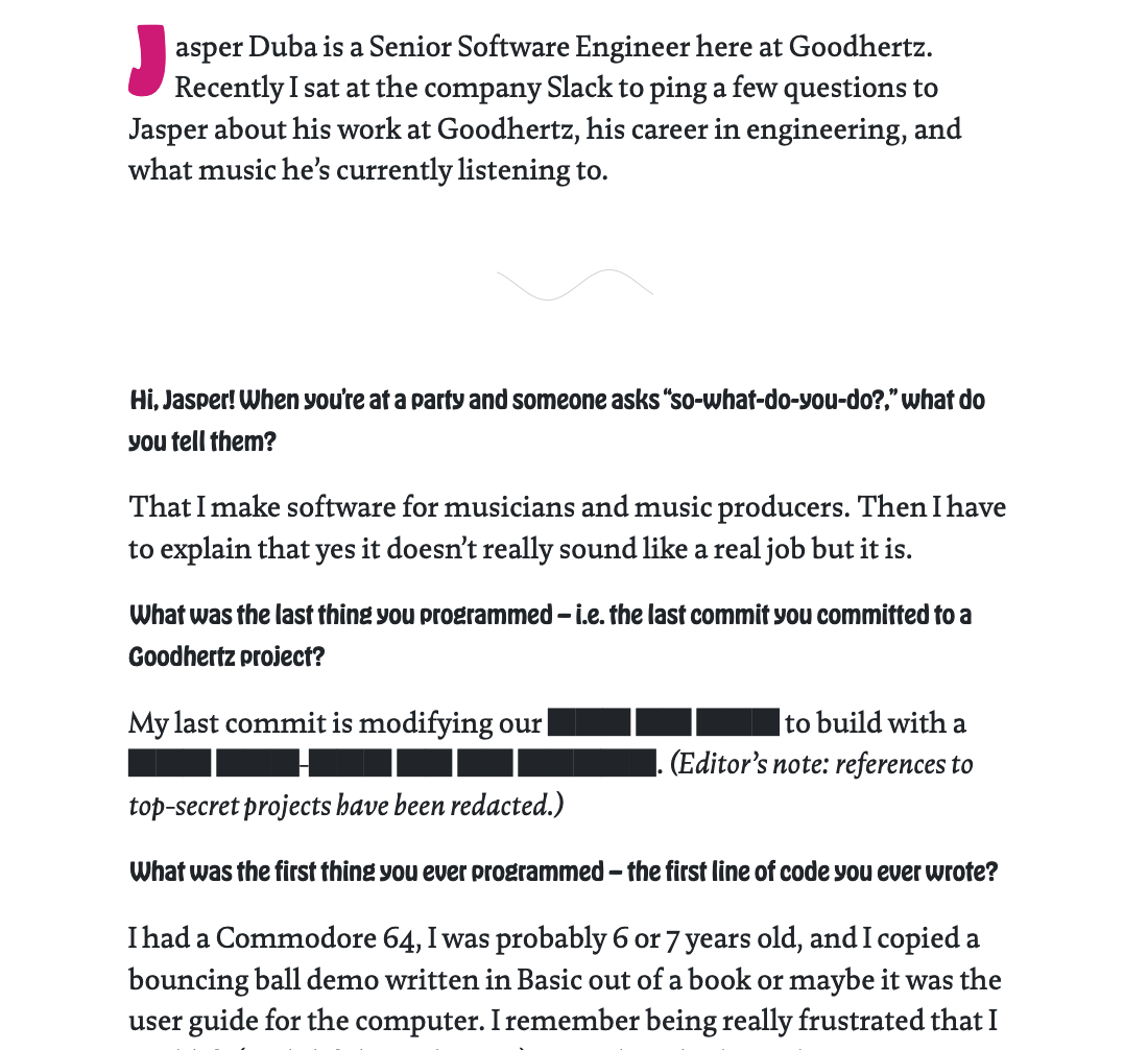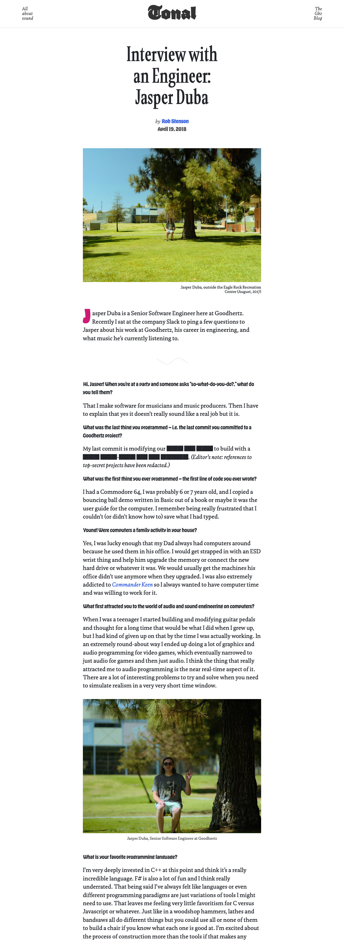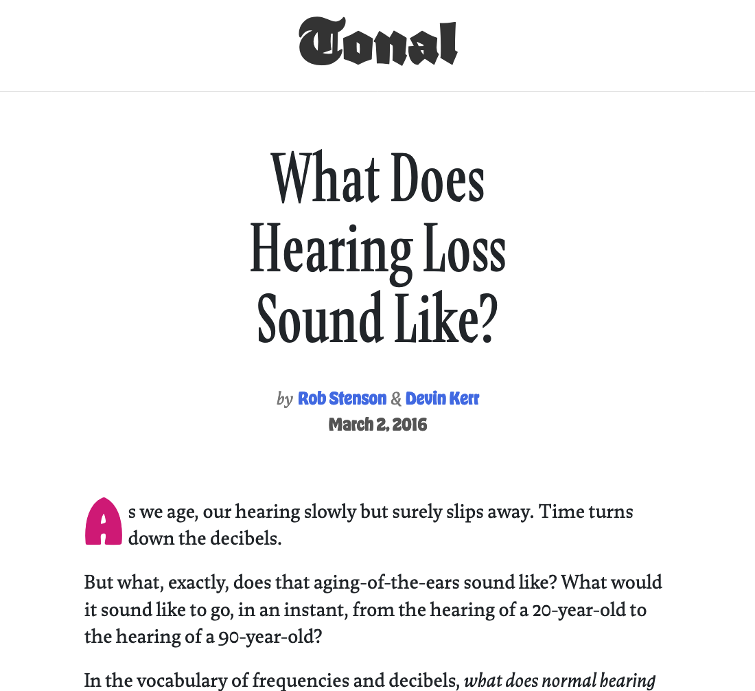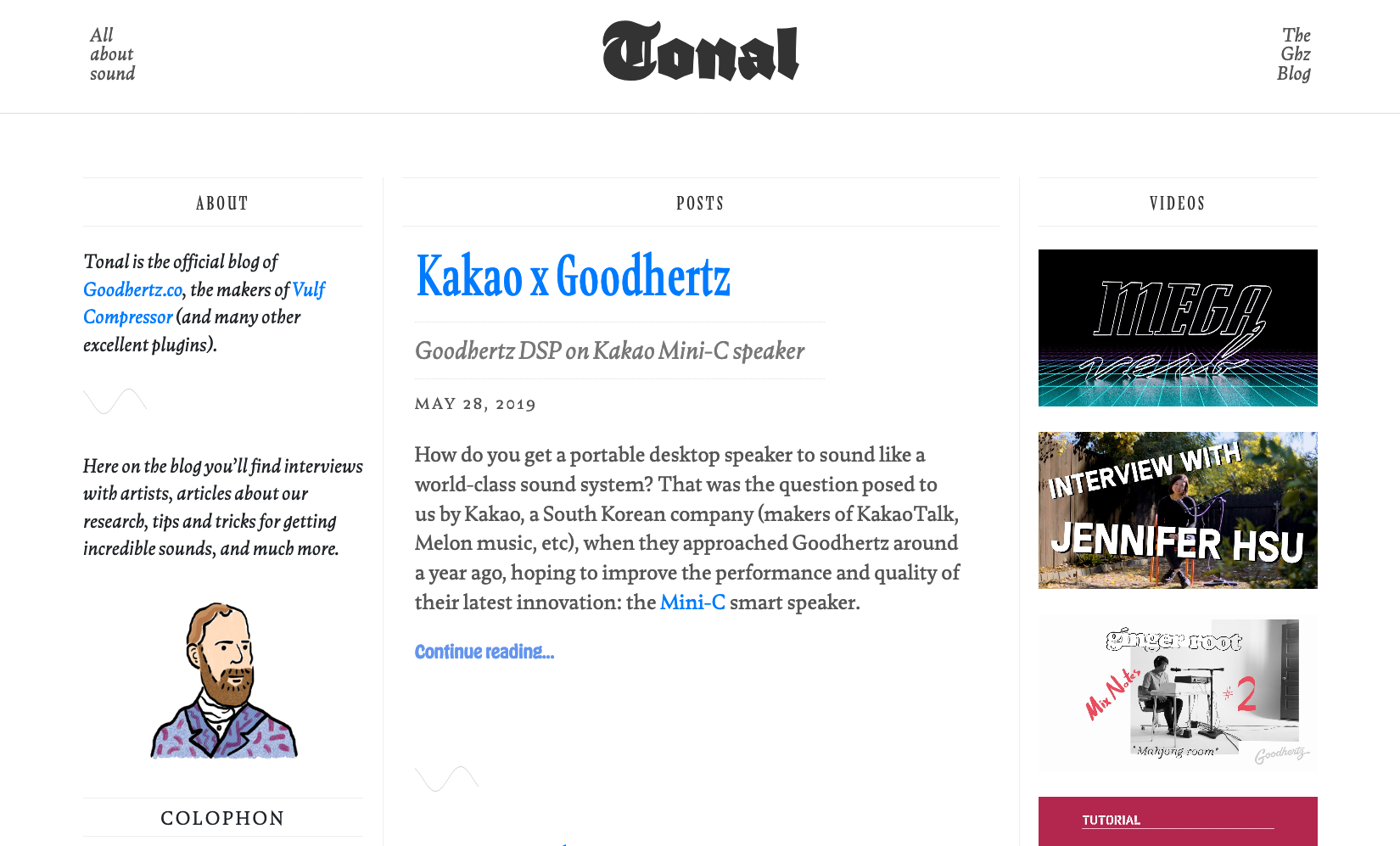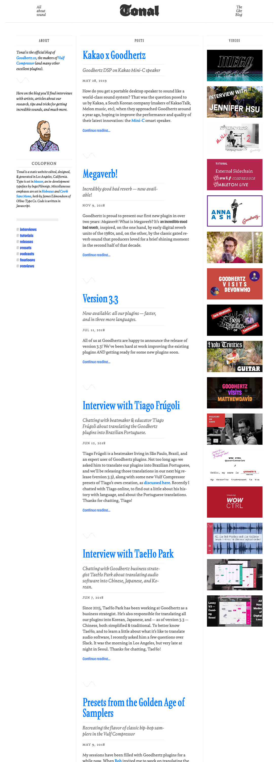 Tonal is the blog of Goodhertz, makers of audio plugins such as “Megaverb” that was introduced with a video previously shown on Fonts In Use. Another Goodhertz product is the “Vulf Compressor”, named after the band Vulfpeck – which in turn was the namesake of OH no Type Co’s Vulf Mono.