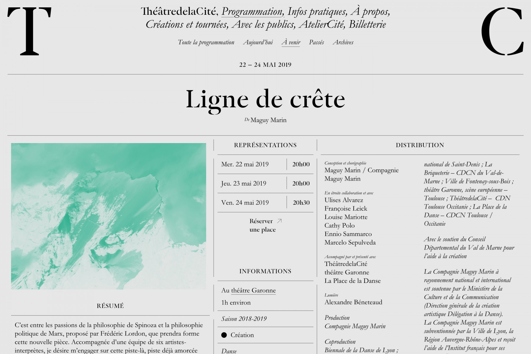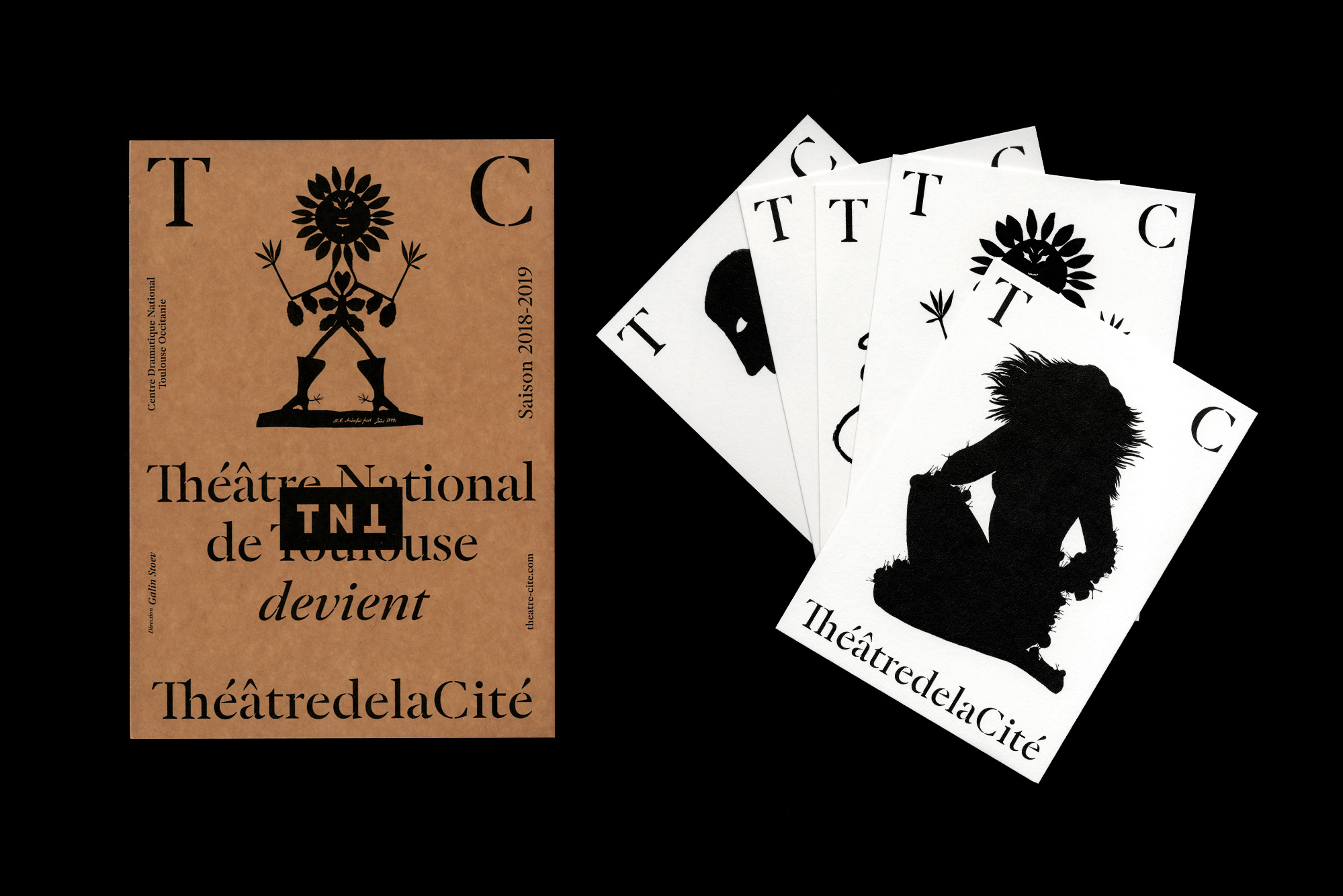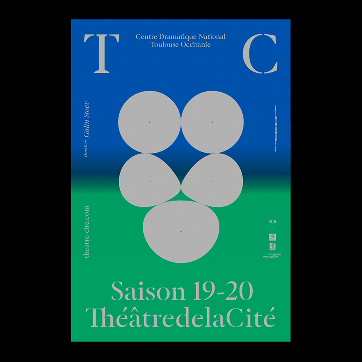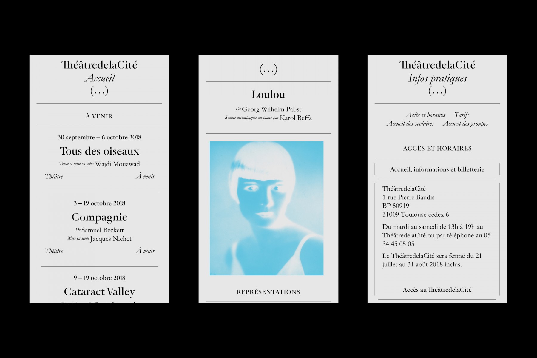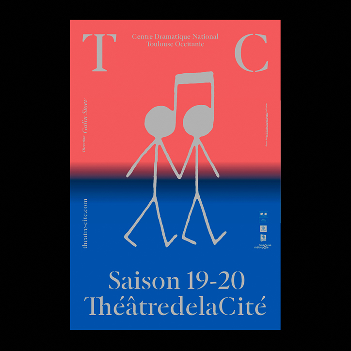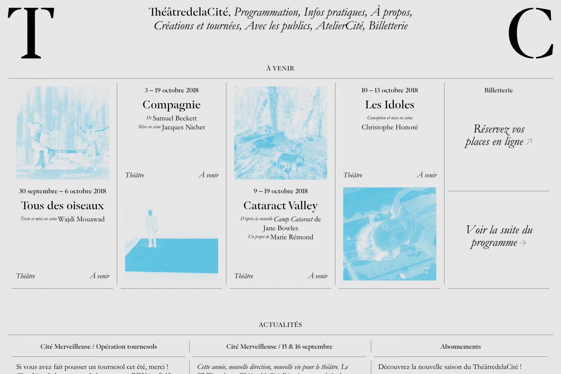 ThéâtredelaCité is a French national drama centre located in Toulouse. Identity, posters and leaflets by Pierre Vanni. Both posters and the website (design by Paul Gacon) use a two-color scheme. For the posters, the palette may vary for every new design; the website changes its secondary color – used for images – on (re)loading the page. Klod Regular and Italic are used throughout. On the website, most non-headline typography uses MT Garamond.