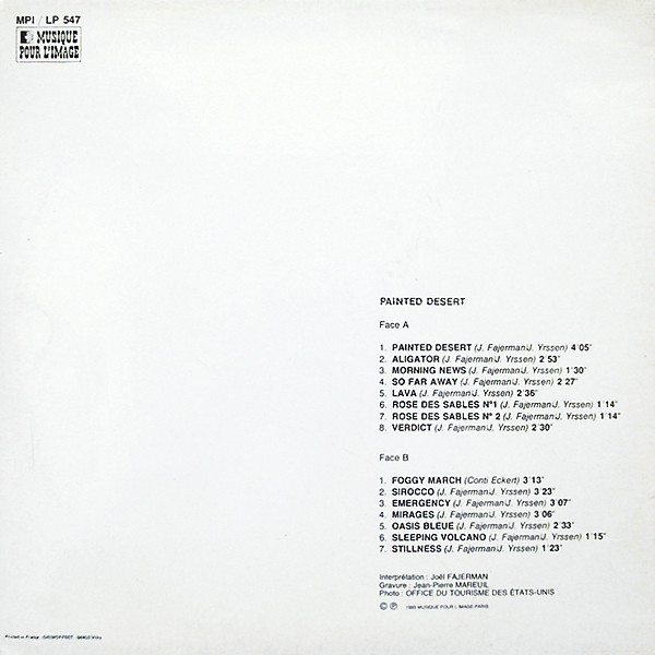 Painted Desert is an LP by the French electronic composer Joël Fajerman. It was produced by Musique pour l’Image in 1980. The title is set in caps from Shatter. The small print on the back is in Helvetica.