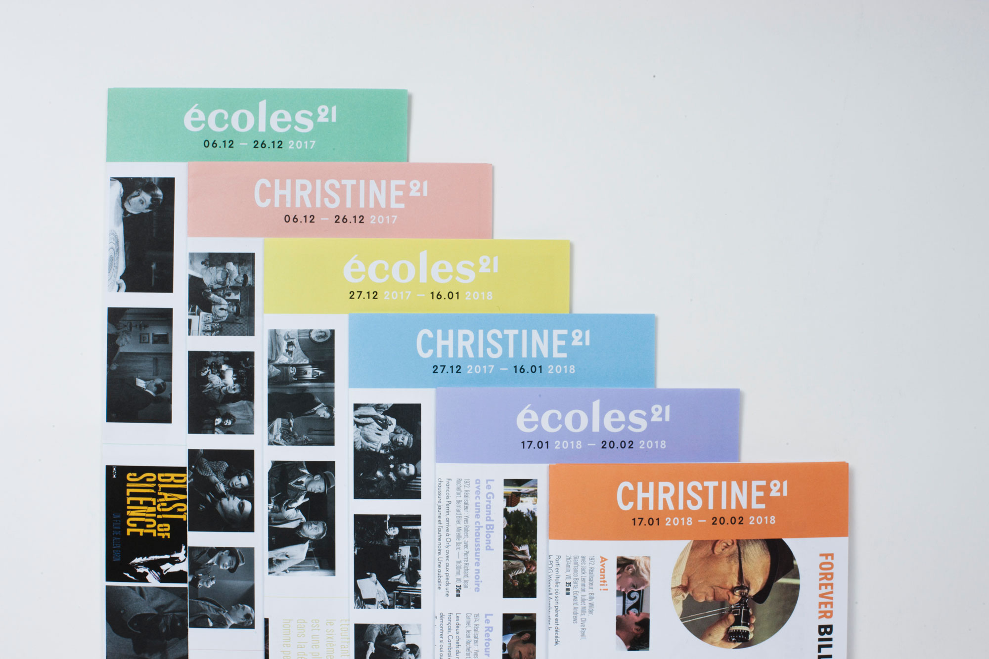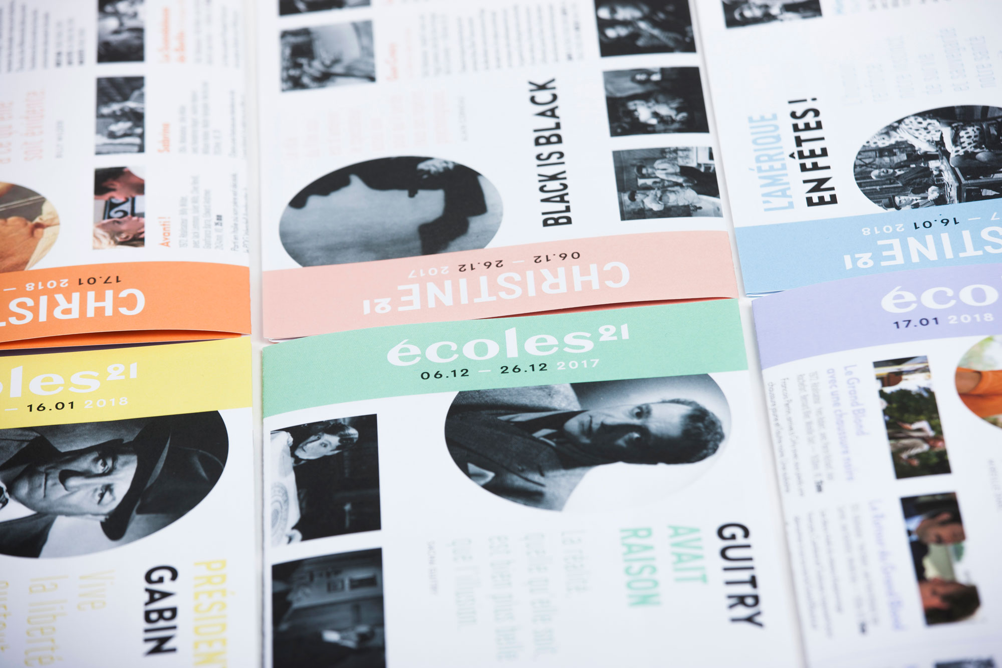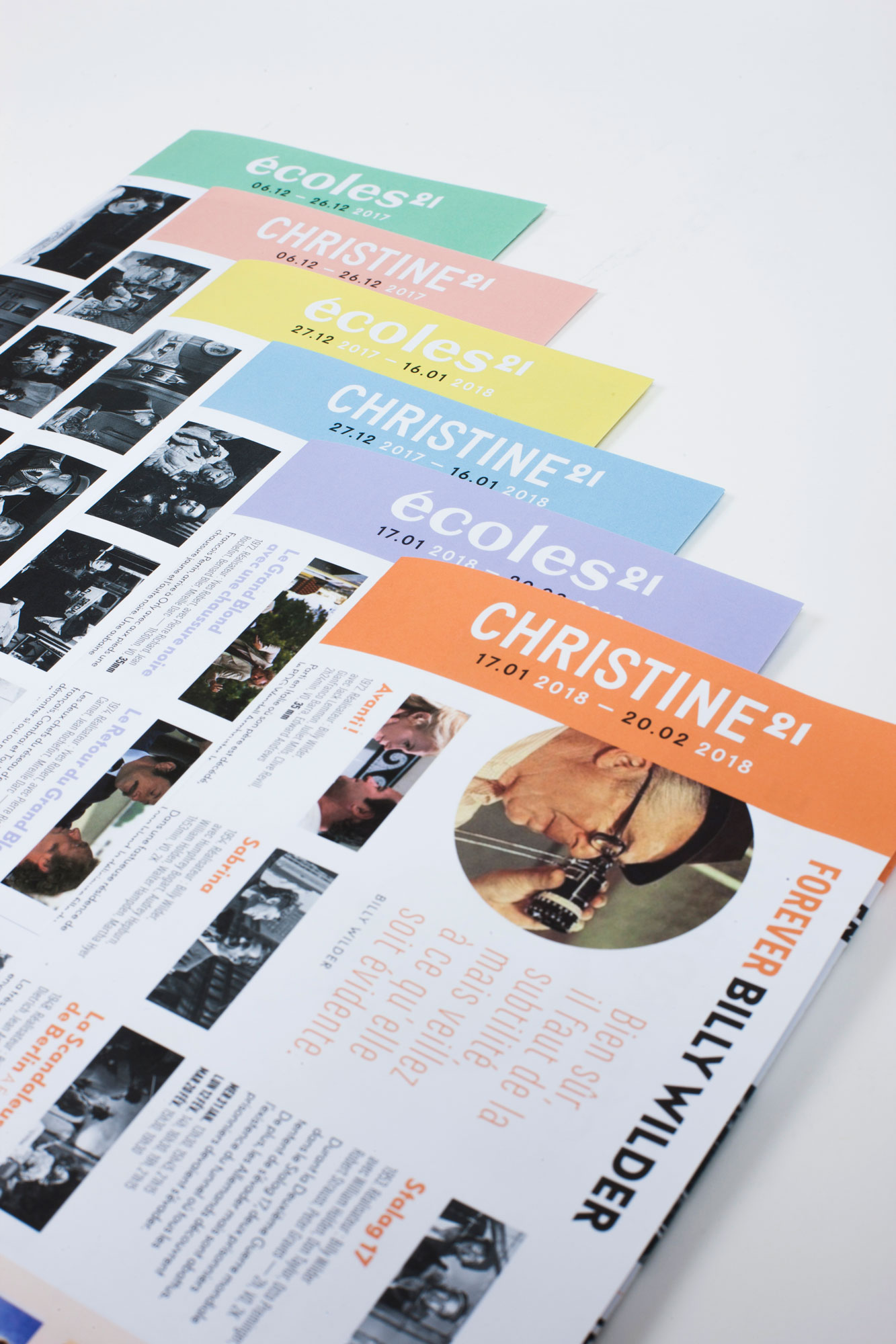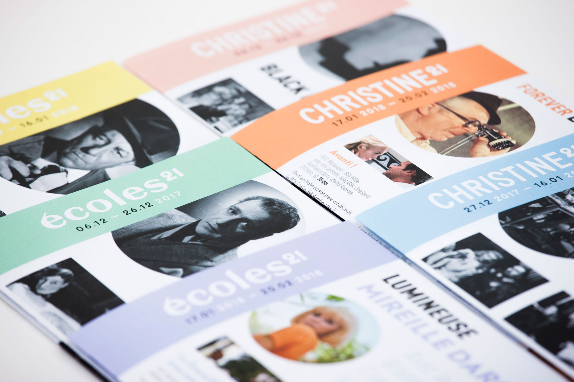 Narrative designed the graphic identity of Cinémas 21 (Christine 21 and Écoles 21). The treatment of the suffix “21”, like a mathematical power, gives a common graphic denominator to the two arthouse cinemas (both located in the 6th arrondissement of Paris), as well as to the Cinemas 21 entity that groups the two sites. Narrative also imagines the model of the monthly Cinéma 21 programs in the form of a 3-fold brochure.