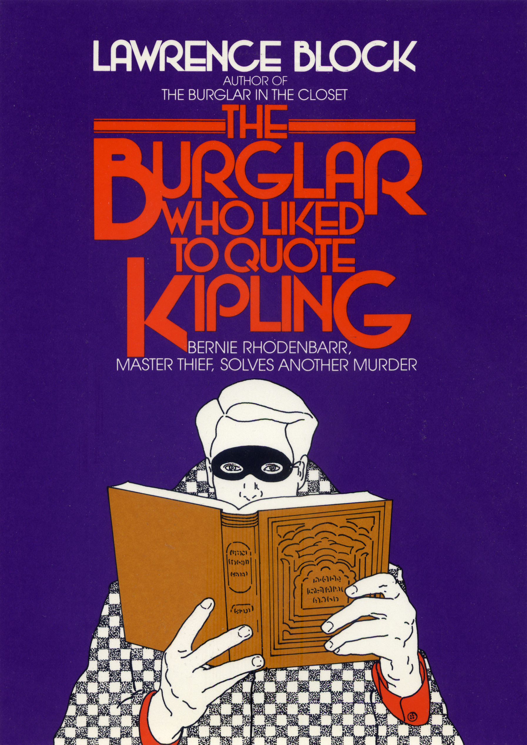 This layout was revised for The Burglar Who Liked to Quote Kipling (1979). The author’s name was moved to the top, and Plaza made way for Wexford. This face is likewise a geometric display sans with Art Deco vibes (see e.g. the round-top A) Designed by Richard A. Schlatter, Wexford was released by VGC in 1972.