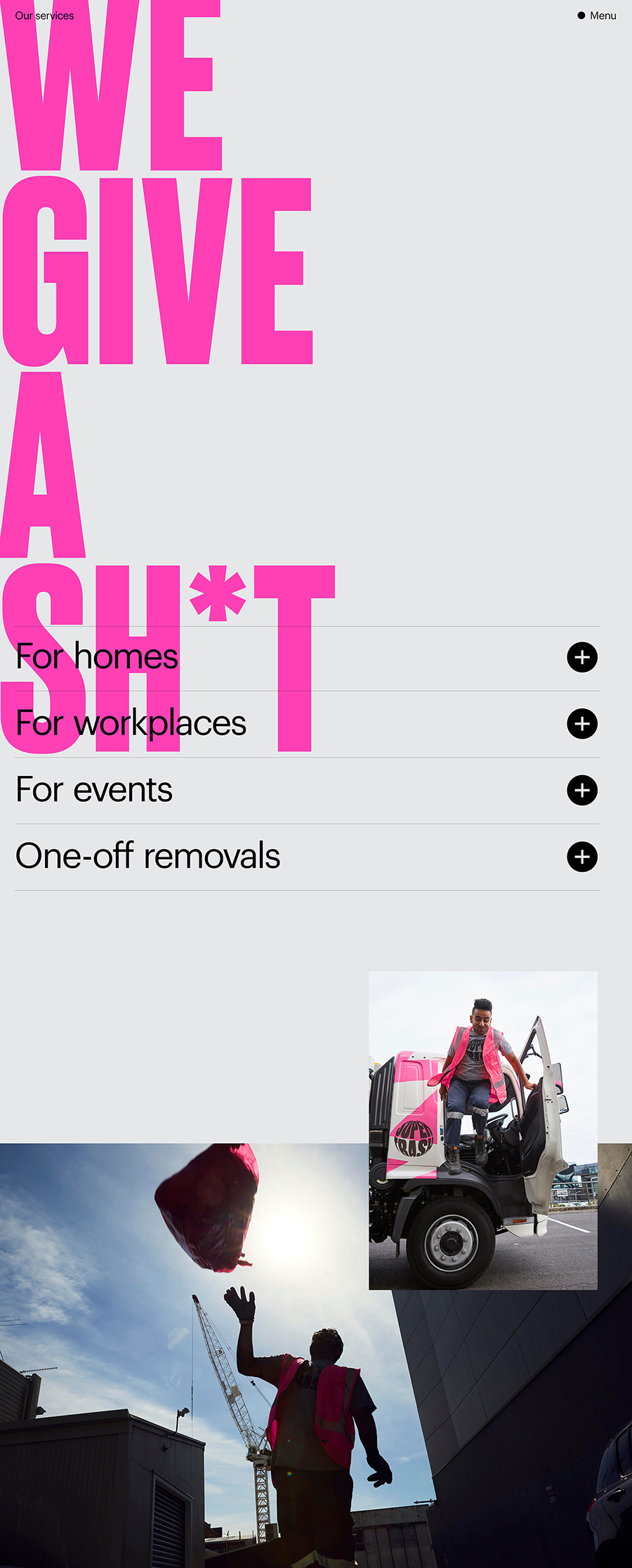 Built around the strategic positioning statement (and visible strapline) “Turning trash around”, design studio Seachange developed a visual identity around the youthful, innovative and energetic disruption of what they describe as a tired and disingenuous industry.