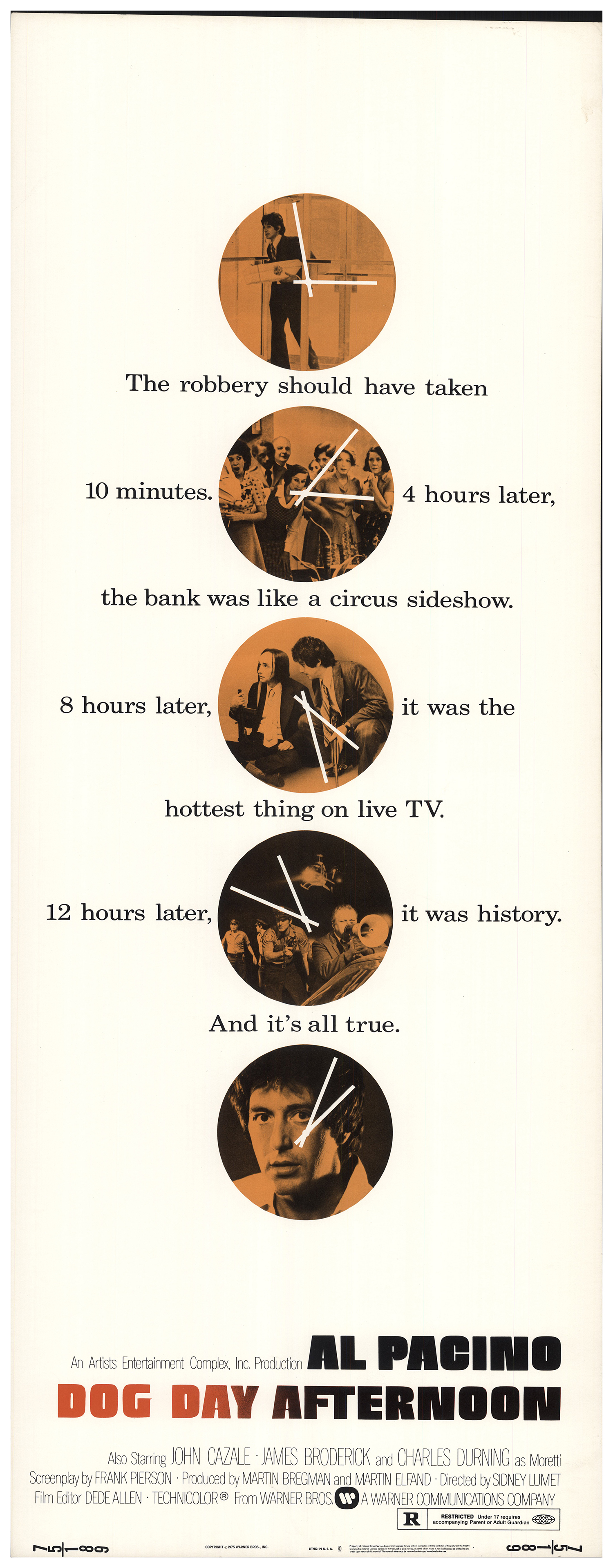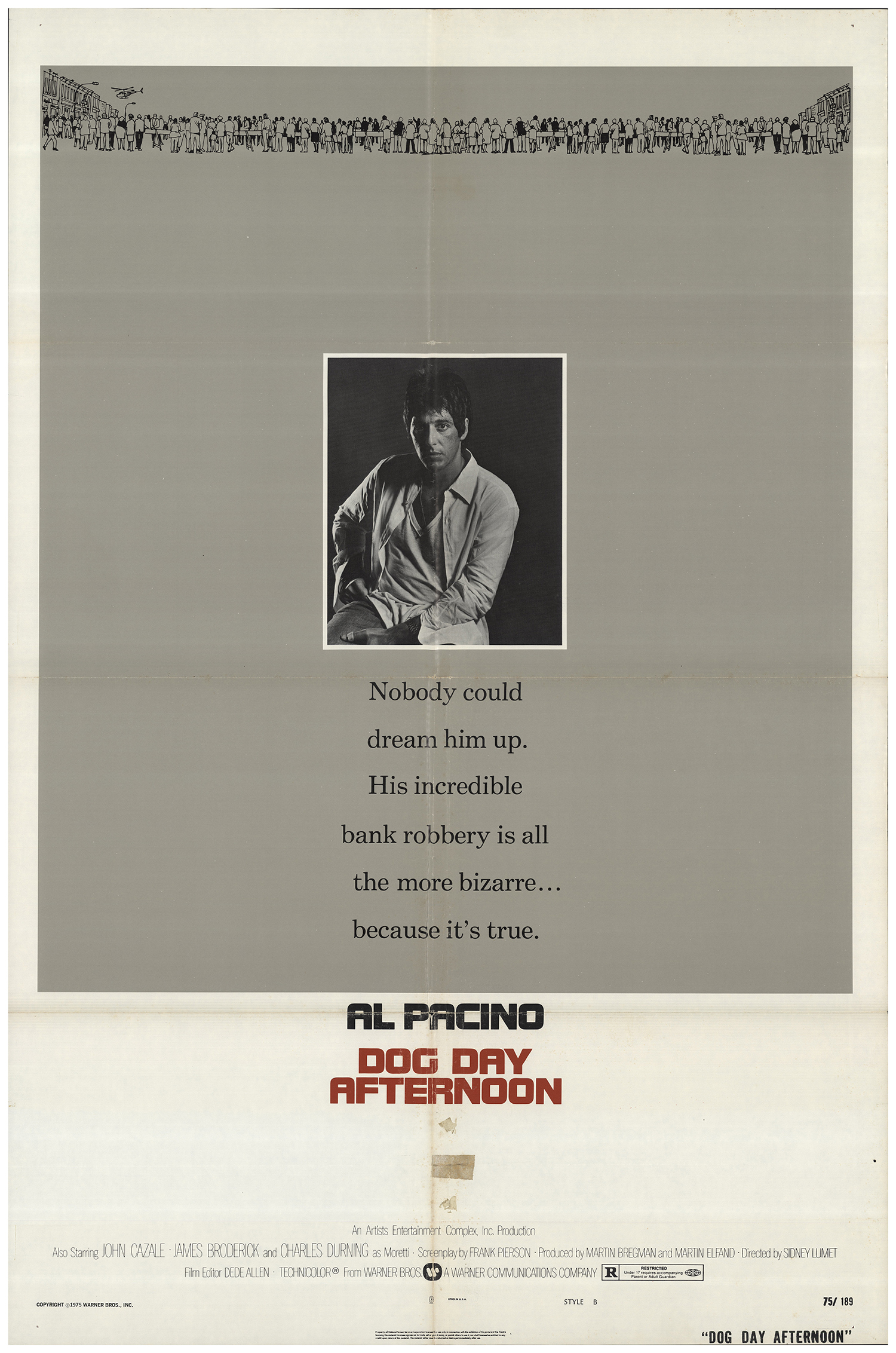 In the film, the robbery is committed by two men. Pacino’s sidekick is played by John Cazale who dons a somewhat unpleasant hairstyle (long hair with receding hairline, brrr). The commercial department apparently did not consider him a suitable poster boy.
