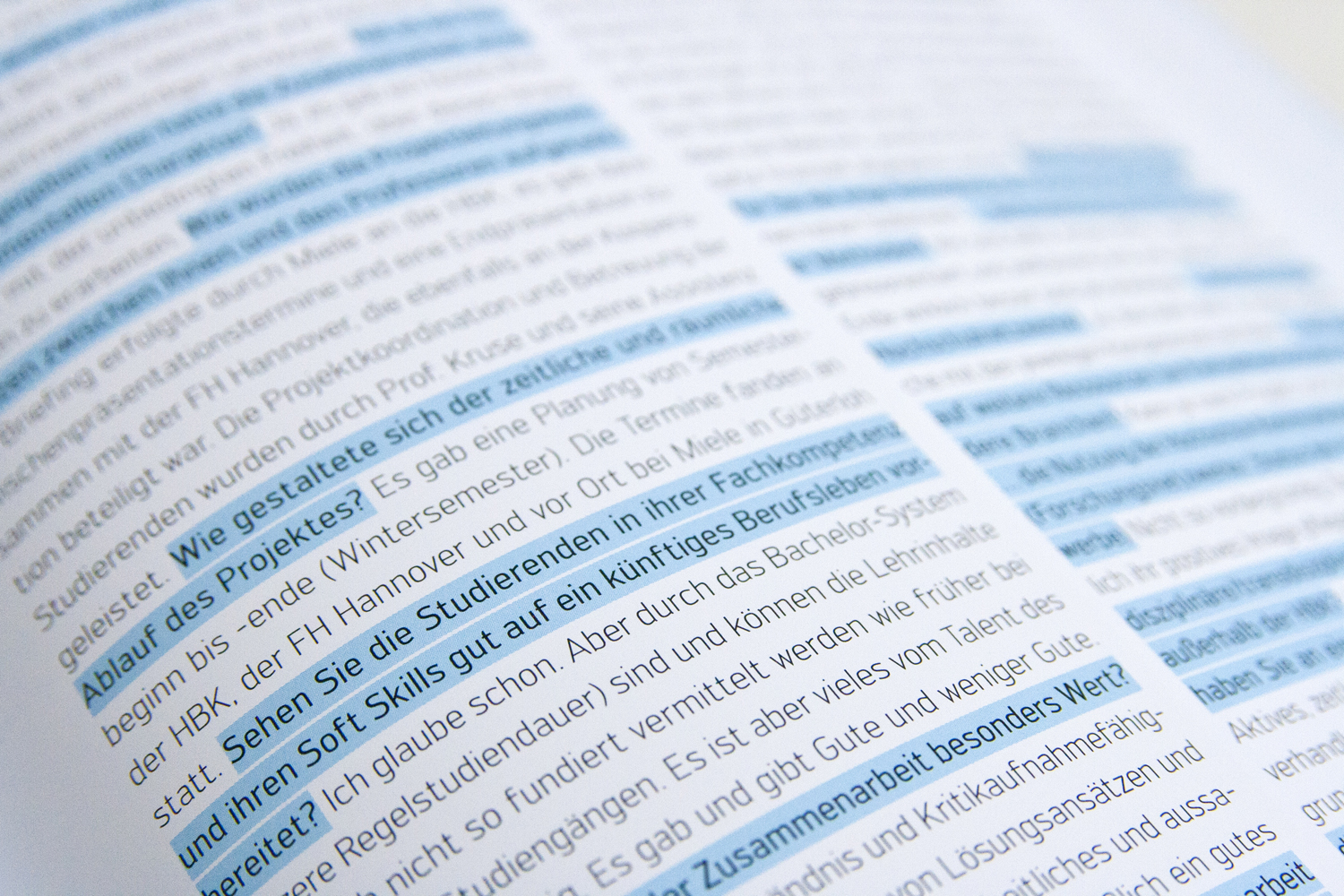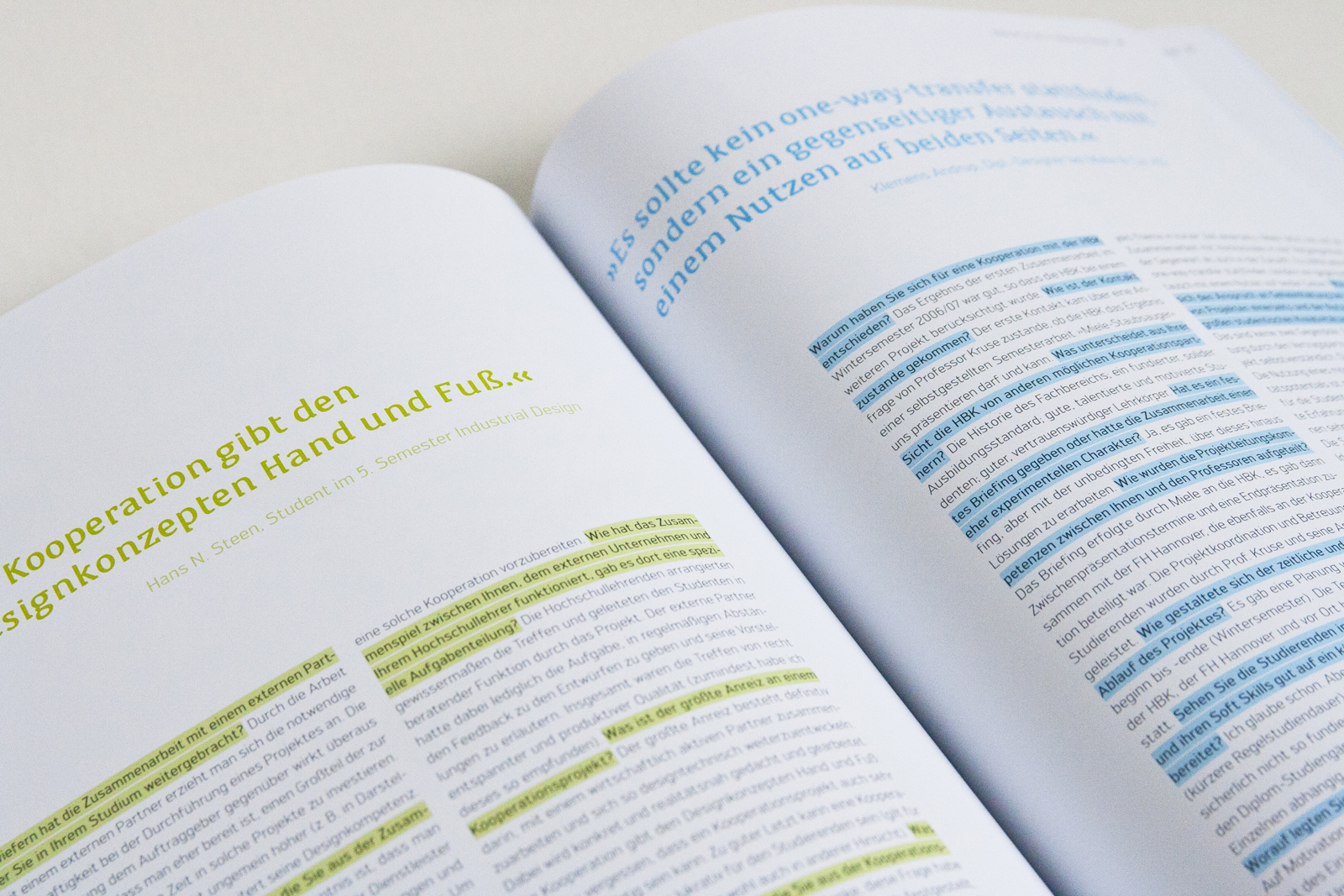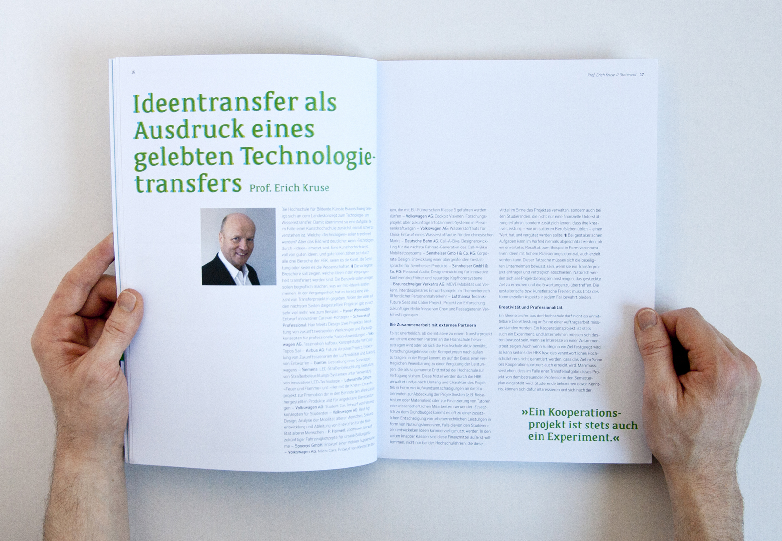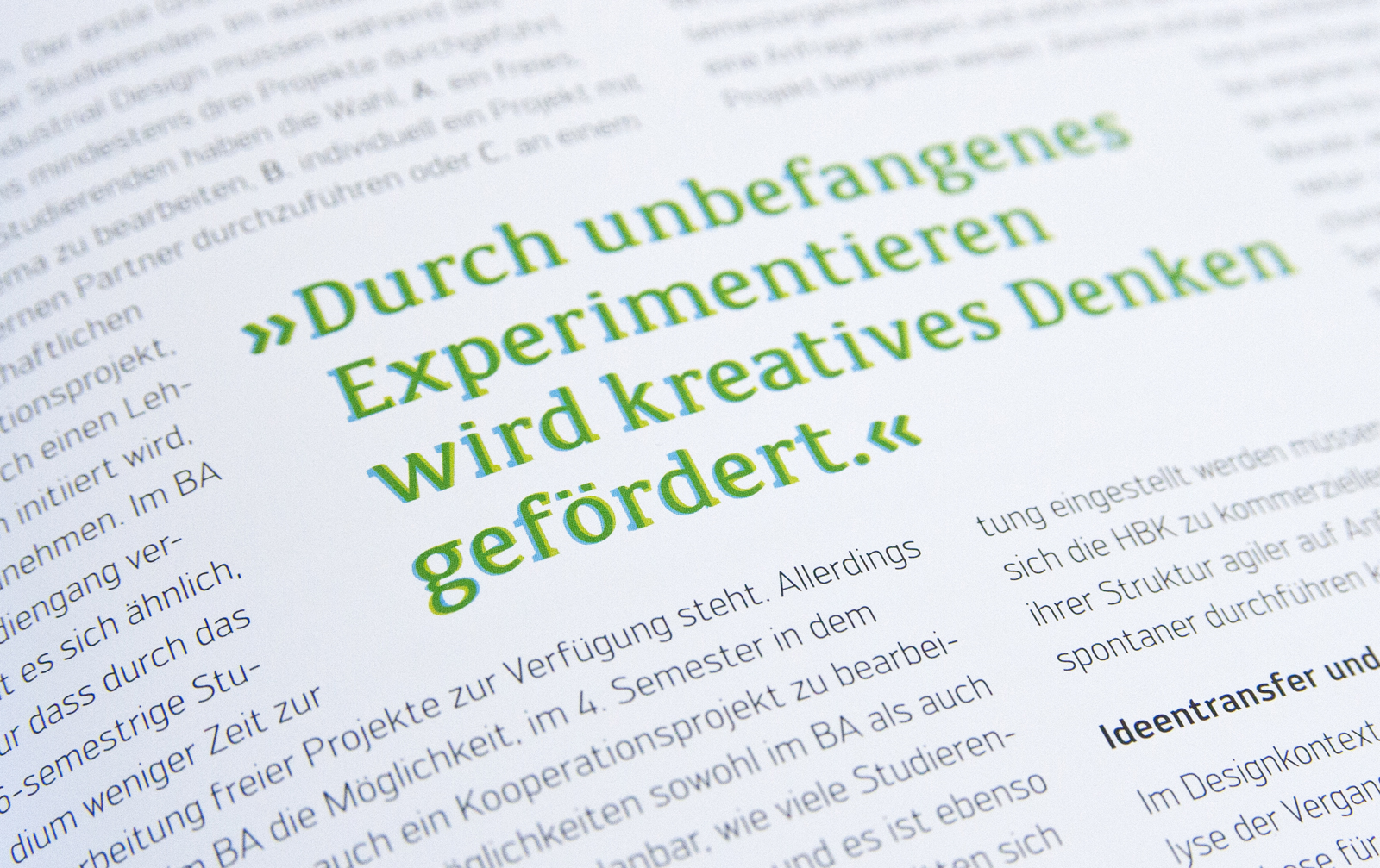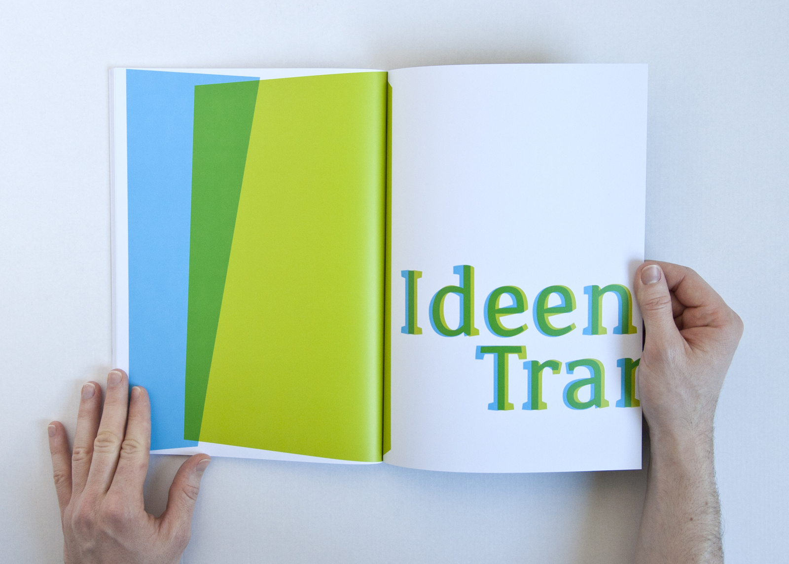 This is a publication of the Braunschweig University of Art designed by interpunktion. It presents projects of cooperation between the university and companies or cultural institutions. The focus is on the transfer of ideas and knowledge between both sides. To visualize the two sides that complement one another to create something new the font Sodachrome fits perfectly: