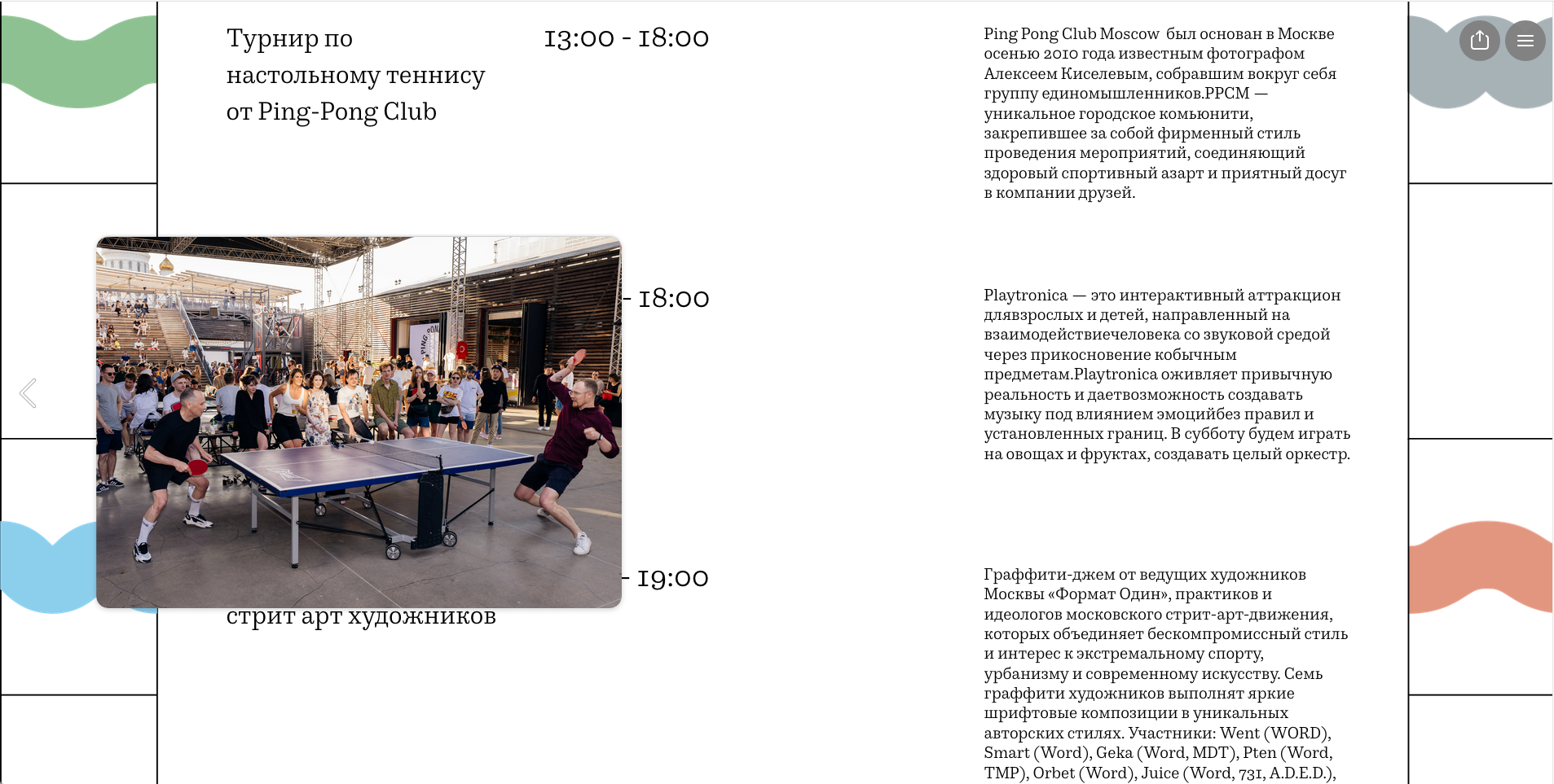 One of the main objectives of Фестиваль Малых Рек (“Little Rivers Festival”) is to help residents learn more about the opportunities that exist in their area. It offers a variety of markets, musicians, games, workshops, jogging tours and many other attractions. The main task of the festival is to remind that a clean river near the house can serve as a kind of intermediary between nature, urban space and people, help renew the ecosystem of the area and create a friendly and environmentally friendly environment for residents.