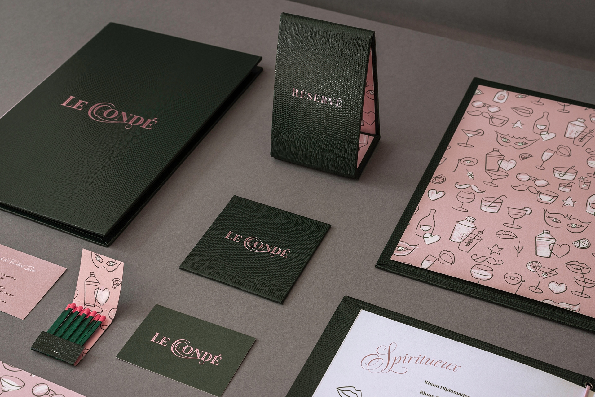 The color palette has two main colors: Condé Diamond Pink & Chantilly Forest Green. The historic heritage of the Prince of Condé family and the Château de Chantilly breathe in the materials and colors selection: from the shinning pink hot foil to the textured green extravaganza.