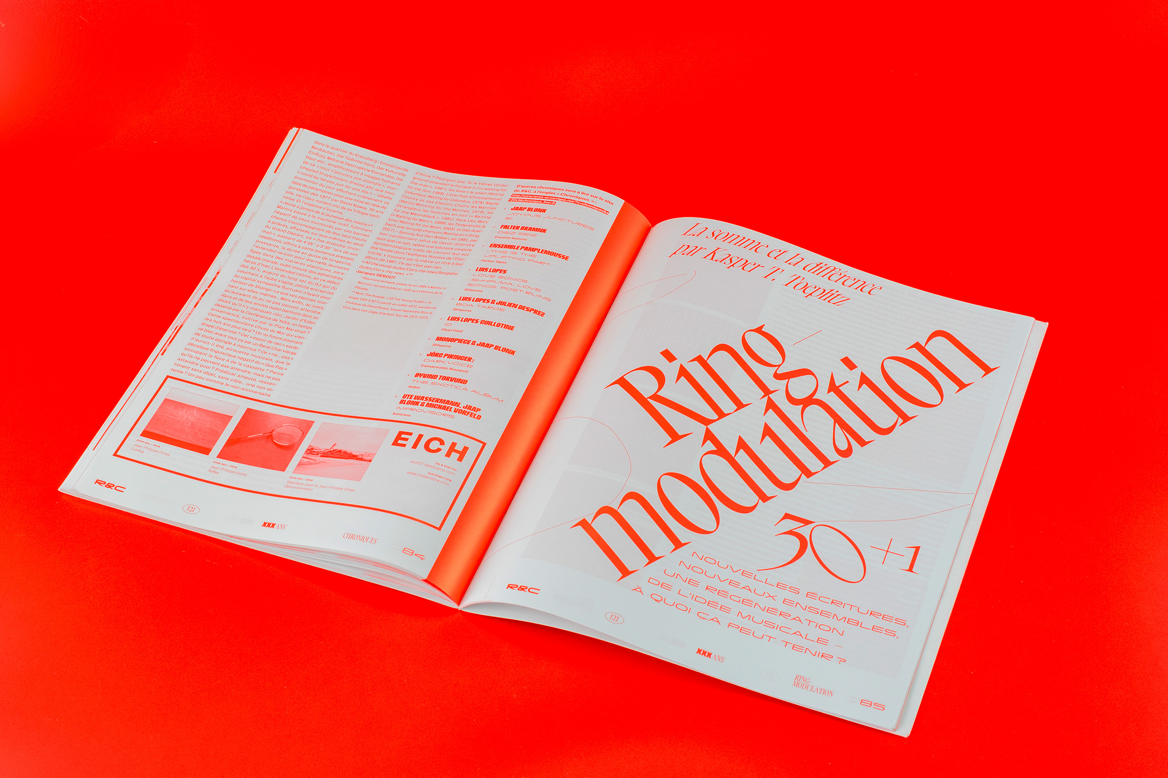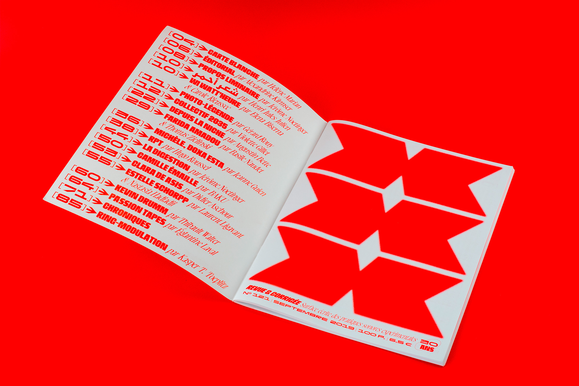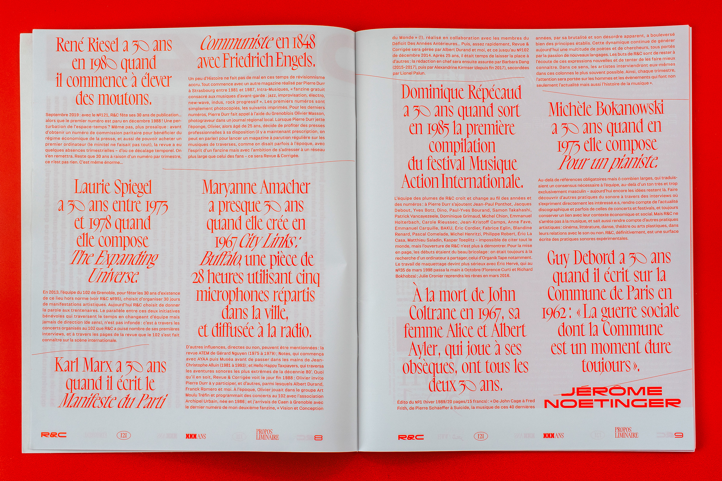 For the special 30th anniversary issue, French designer Hélène Marian was given carte blanche. She limited herself to a single color – red – but went all in with the typography, and indulged in a wild mix from several styles from her own PVC series. In addition to the extrawide PVC Banner (in regular and Ultra weights) and the punchy PVC Promo, the issue also has a preview of the upcoming PVC Dynasty. This sharp serif will further expand the range of the heterogeneous typeface collection. In a supporting role, another typeface from Production Type: Minotaur Sans is used for body copy.