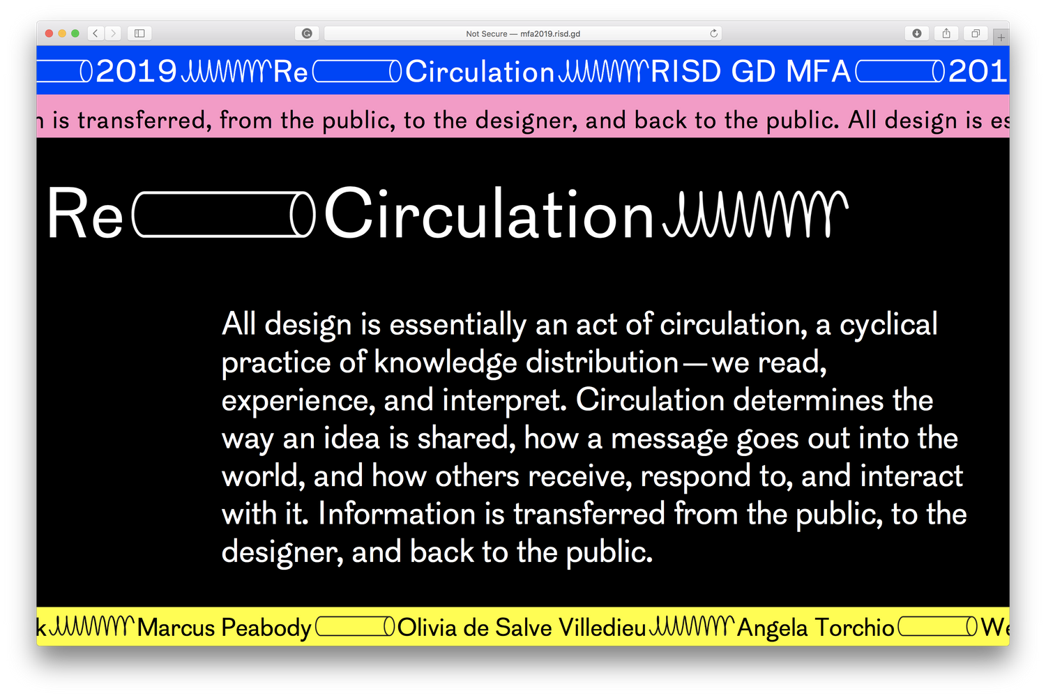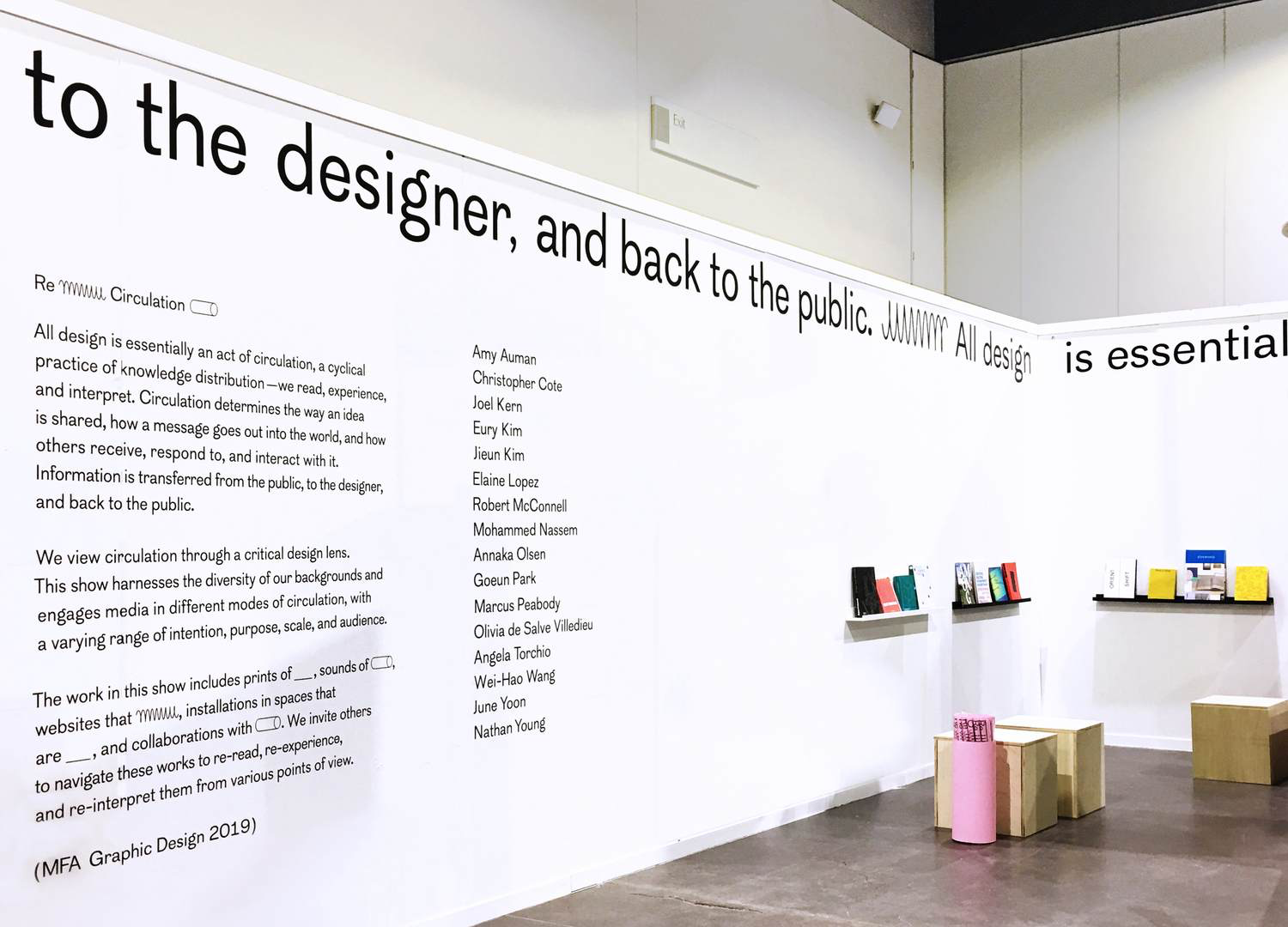 Re-Circulation is the name of The Rhode Island School of Design’s 2019 MFA Graphic Design Thesis Exhibition. This show harnesses the diversity of our backgrounds and engages media in different modes of circulation, with a varying range of intention, purpose, scale, and audience. From the exhibition website (check it out!):