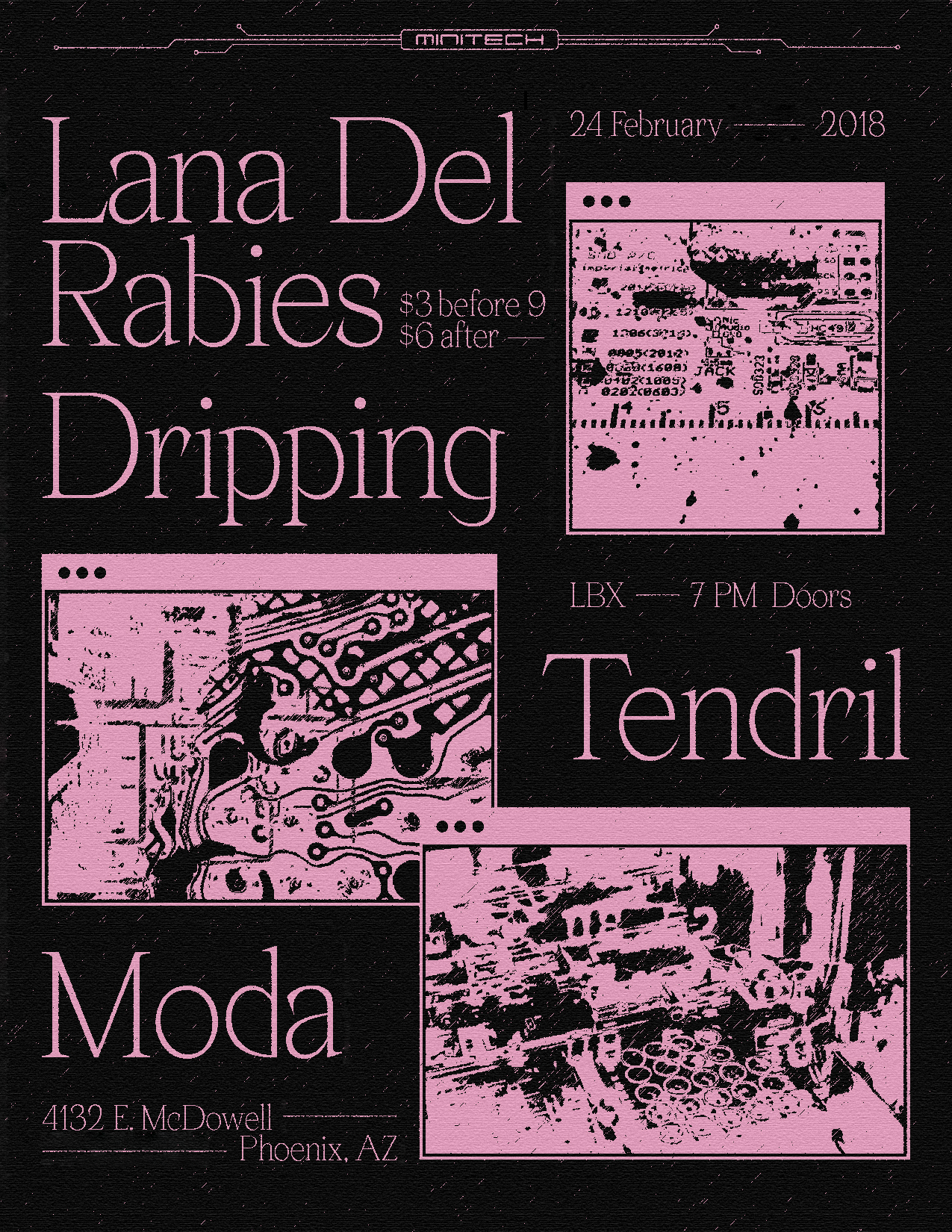 Minitech Contributed by Lauren N. Bailey on Jan 28th, 2020. Artwork published in February 2018. Photo: Lauren N. Bailey. License: All Rights Reserved. Electronic music night in Phoenix, Arizona featuring all local acts. Feb 2018 Typefaces More about ApocGet Apoc Formats Posters/Flyers (5780) Topics Music (6371) Designers/Agencies Lauren N. Bailey (13) Tagged withpink and black (63)electronic music (587)hyphens and dashes (86)one typeface (1755)reversed type (3389) Artwork location United States (9928) Phoenix (15) In Setsexperiential (R. K. Kothar) (26) Post a comment Name Email – will not be published Website Your response Submit Comment More Apoc in use Les Ailleurs festival2020CRC StudioFisheyeContributed by Alain Papazian Laura Scullin website2020unknownContributed by Alain Papazian Jenna Wortham personal website2020Rin KimContributed by Alain Papazian Sponsor More in Music Stig Brenner visual identity2021Gregory PageContributed by WELTKERN® Typefaces The Jackson 5 – Jackson 5 Christmas Album1970Alana CoghlanKatherine MarkingVartanContributed by Garrison Martin Al Caiola – Percussion and Guitars album art1960Murray SteinPhoto(s) by Bart Solenthaler on Flickr. Great Motion Picture Themes album art1960unknownContributed by Florian Hardwig More in Posters/Flyers XXII Bienal de Arquitectura y Urbanismo de Chile2023Felicidad PúblicaContributed by Nguyen Gobber Sober October, Day 10 and 13 posters2023Maurice RiegerContributed by Ethan Nakache “Los Idiomas” by Alessandra García2024Tiquismiquis ClubRoberto EsparteroJuan MartínContributed by Tiquismiquis Club Errors poster2014ReklamekollektivetContributed by Thomas Dahl Birkeland More Fonts In Use Transposition2015Pascal StorzFabian BremerChristian HoferContributed by X-Ray Charles Staff Pick TIME, Jul 30, 20072007Arthur HochsteinContributed by Stephen Coles Staff Pick MDY, “Phantasm” issue, 20212021Pierre P. MarchalContributed by Typotheque Staff Pick The Tudors: Art and Majesty in Renaissance England at Legion of Honor2023Lizzie BaurMeghan MoranKate AgarwalContributed by Lizzie Baur Staff Pick