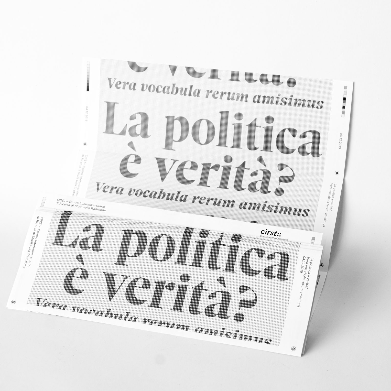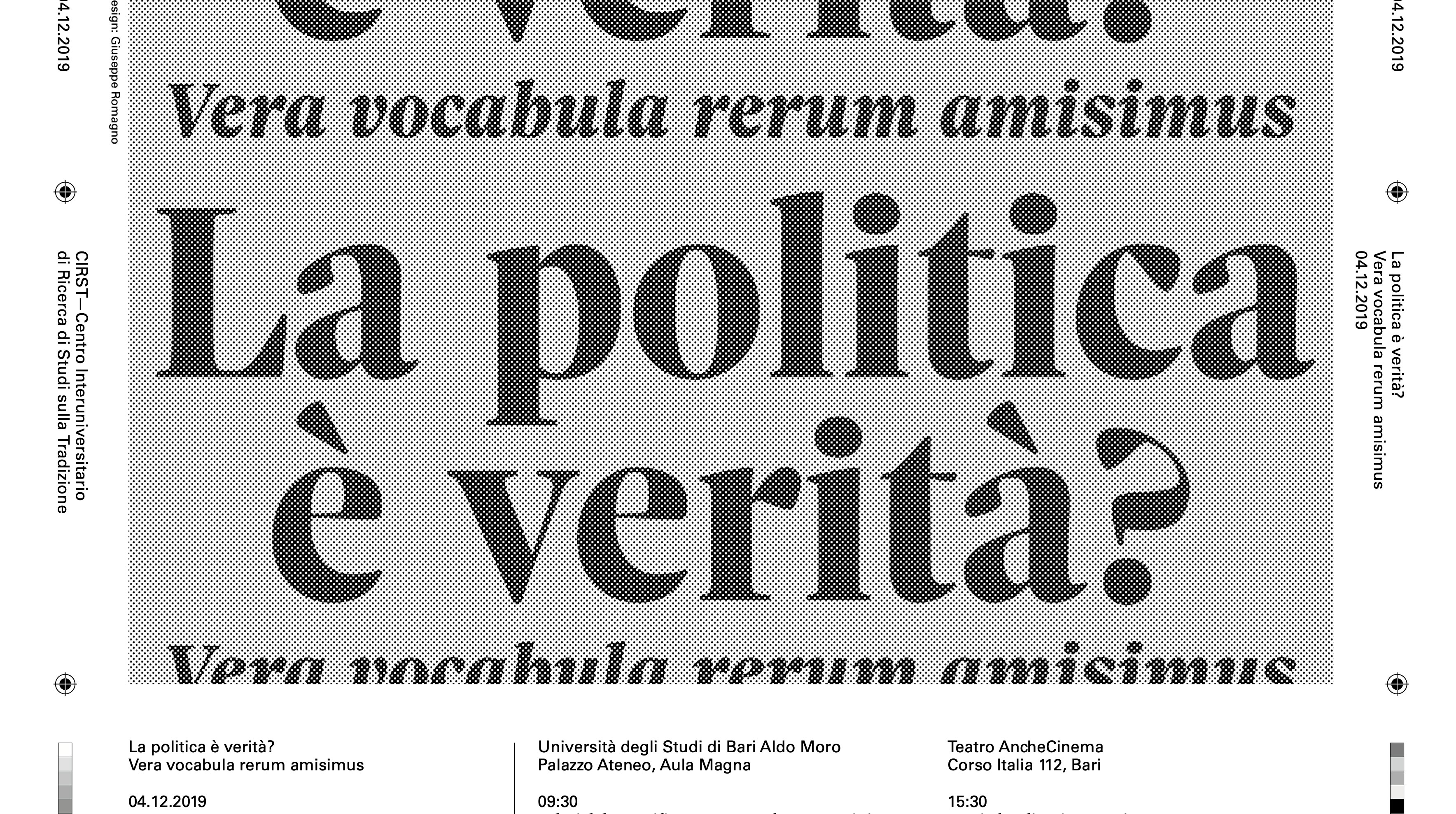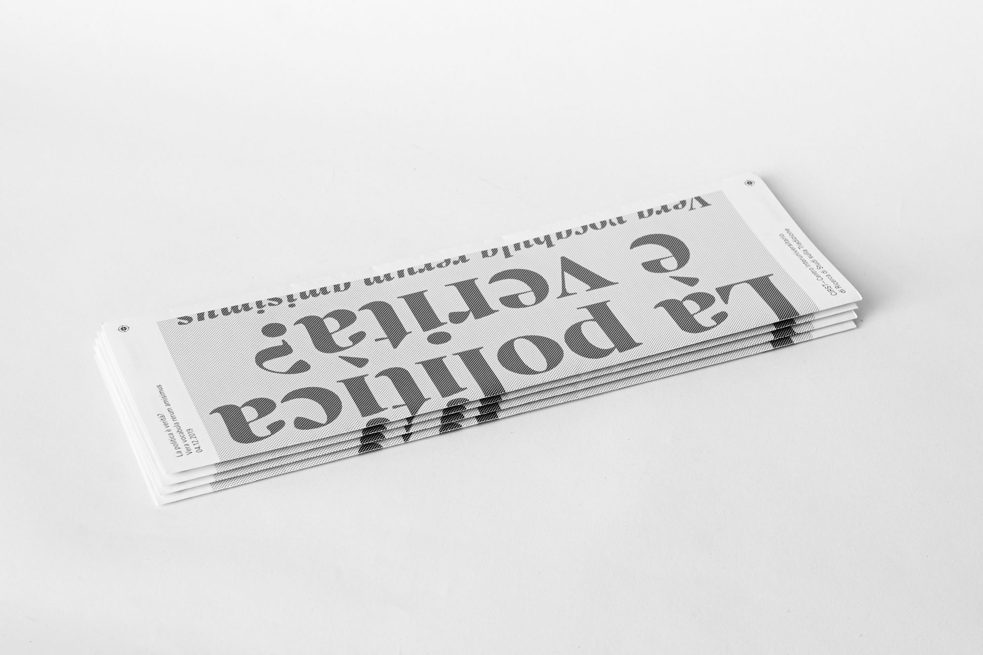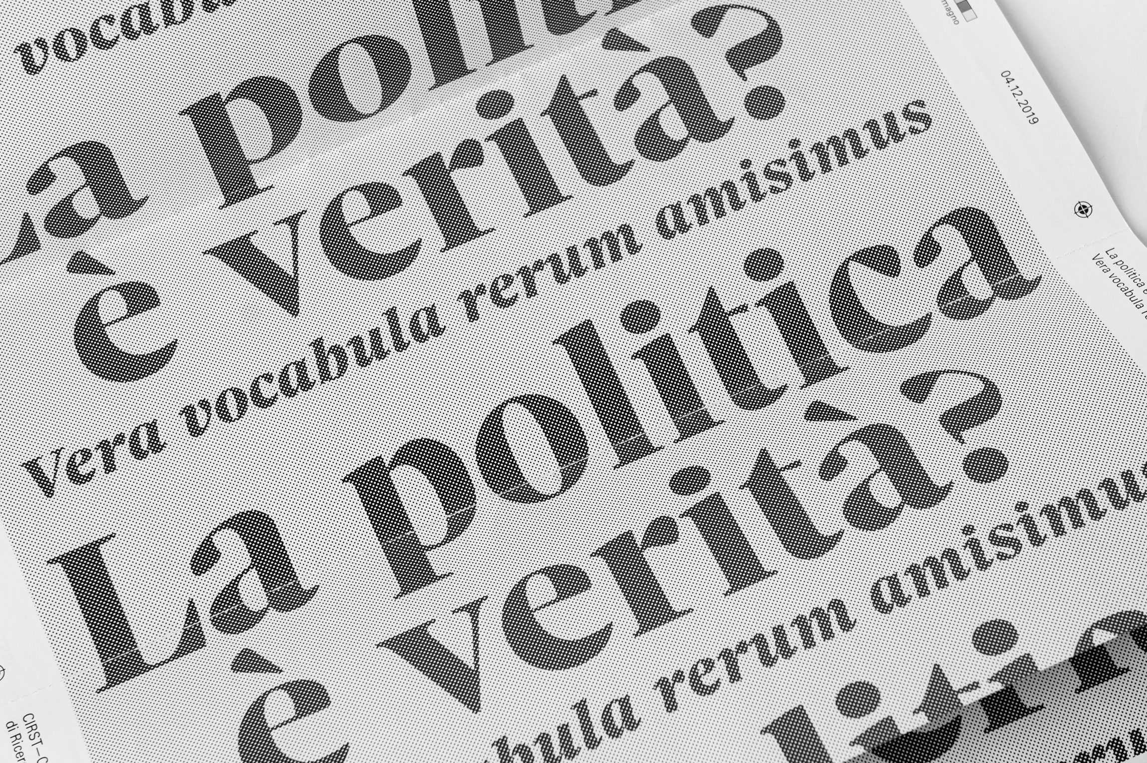 La politica è verità? Contributed by CAST on Feb 7th, 2020. Artwork published in December 2019. Giuseppe Romagno. License: All Rights Reserved. Sole Serif and Univers used on a programme designed by Giuseppe Romagno for the meeting La politica è verità?, focused on the use of the Italian language in politics and in its communication. Giuseppe Romagno. License: All Rights Reserved. Giuseppe Romagno. License: All Rights Reserved. Giuseppe Romagno. License: All Rights Reserved. Giuseppe Romagno. License: All Rights Reserved. Source: www.unirsm.sm License: All Rights Reserved. Typefaces More about Sole SerifGet Sole SerifMore about UniversGet Univers Formats Posters/Flyers (5690) Booklets/Pamphlets (2377) Topics Event (3166) Education/Academia (2163) Politics (846) Local (1534) Designers/Agencies Giuseppe Romagno (1) Tagged withblack and white (1999)only type (1269)big type (1716)halftone effects (118)Italy (47)contrasting typefaces (446)contrasting sizes (659)registration marks (1)gray (151)repetition (770)rotated type (2200)multilingual (2581)Latin (language) (43)Italian (language) (587) Artwork location Italy (958) Bari (3) In SetsColossal Combinations (Jay Mellor) (2126)Serif Goodness (Jay Mellor) (181)Thumbnail Questions (Florian Hardwig) (95)Hot (jean-alexandre Jean) (106) Post a comment Name Email – will not be published Website Your response Submit Comment More Sole Serif in use Journalisten magazine redesign 20202017TorinoAli MoosavianChristian GårdContributed by CAST Yogurtista2019TipibluContributed by CAST Verso Sud. Quando Roma sarà andata a Tunisi / Southward. When Rome will have gone to Tunis2019Andrea VenettiContributed by Matthijs Sluiter Sponsor More in Education/Academia Powers of Ten brochure1977Eames OfficeContributed by Nick Sherman Build Your Safety Kit2021Jillian StilesContributed by XYZ Type Cooperapoly2022Vedia Design StudioClara Briones VediaAntton UgarteContributed by Franziska Weitgruber Type Unseen2020Amy FangContributed by Brando Corradini More in Posters/Flyers Oktoberfest Amsterdam2016Photo(s) by Jarr Geerligs on Flickr. Home Talent broadside1907Pluck PrintPhoto(s) by Alan Mays on Flickr. Panic Room movie poster2002Intralink Film Graphic DesignContributed by Patrick Concannon The Farm2021Studio des formesLabel FamilleContributed by Production Type More Fonts In Use Le journal de La Confluence n° 42018Bureau 205Contributed by 205TF Staff Pick The 19th Amendment at Grand Central Terminal1995Stephen DoyleDrenttel Doyle PartnersContributed by Nick Sherman Staff Pick Supertrash2019SeachangeContributed by Richard Baird Staff Pick Dublin Art Book Fair 20202020Temple Bar Gallery + StudiosAlex SyngeContributed by Florian Hardwig Staff Pick