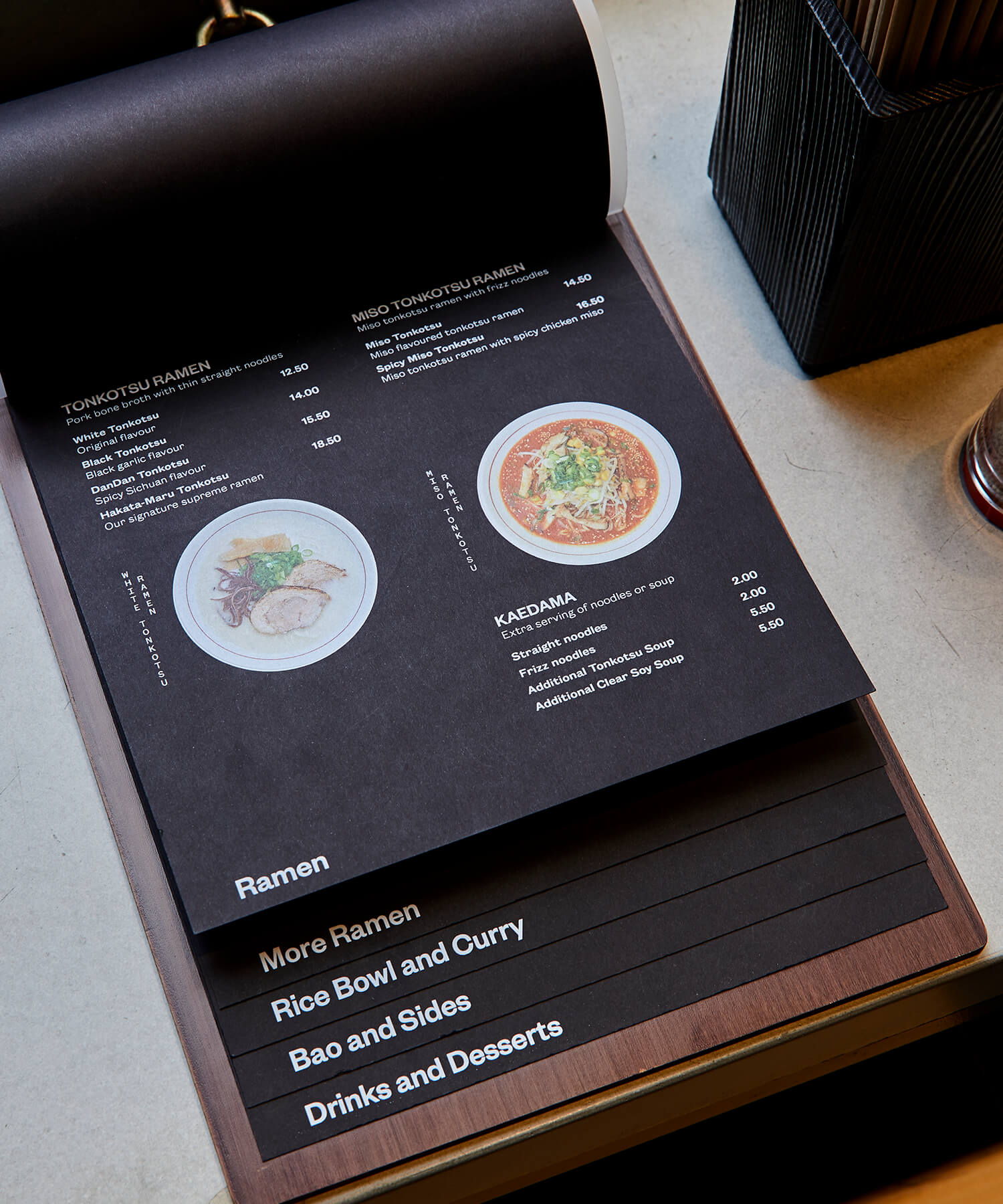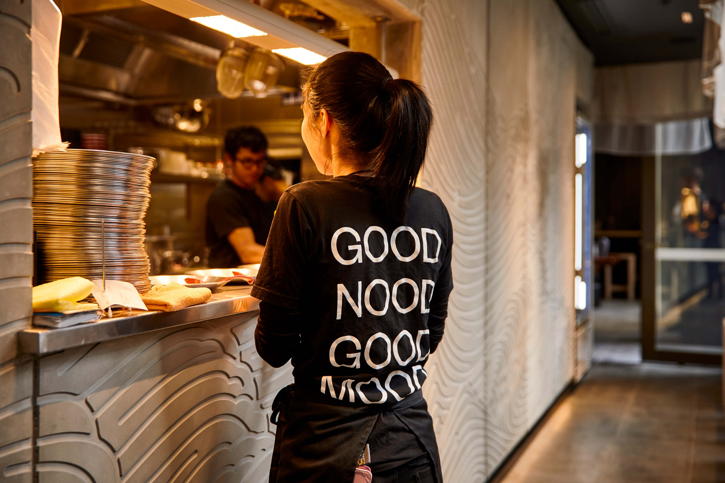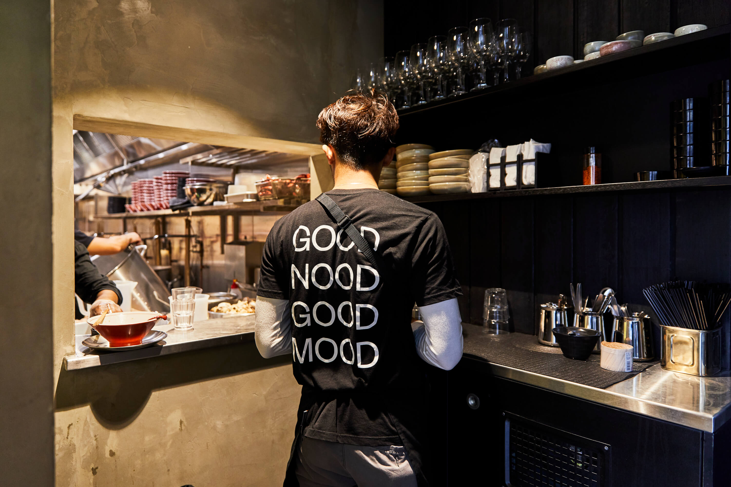 The menus are printed using white ink on thick black paper attached to a wooden backing board to in-keeping with the Japanese fit out. The request for the uniforms was to capture a fun take on ramen, something that staff would be happy to wear and put a grin on the face of customers. The simple pun GOOD NOOD GOOD MOOD is printed large on the back of the black t-shirts to achieve this end.