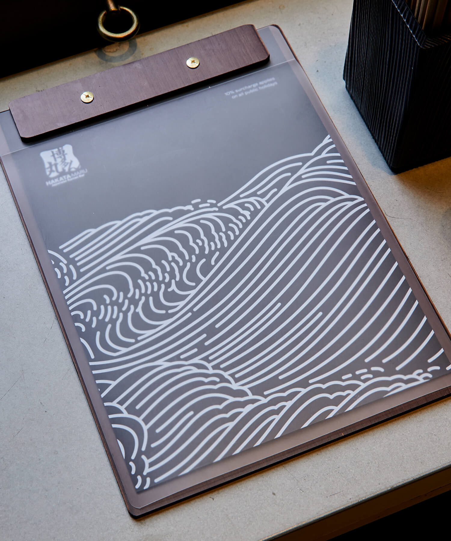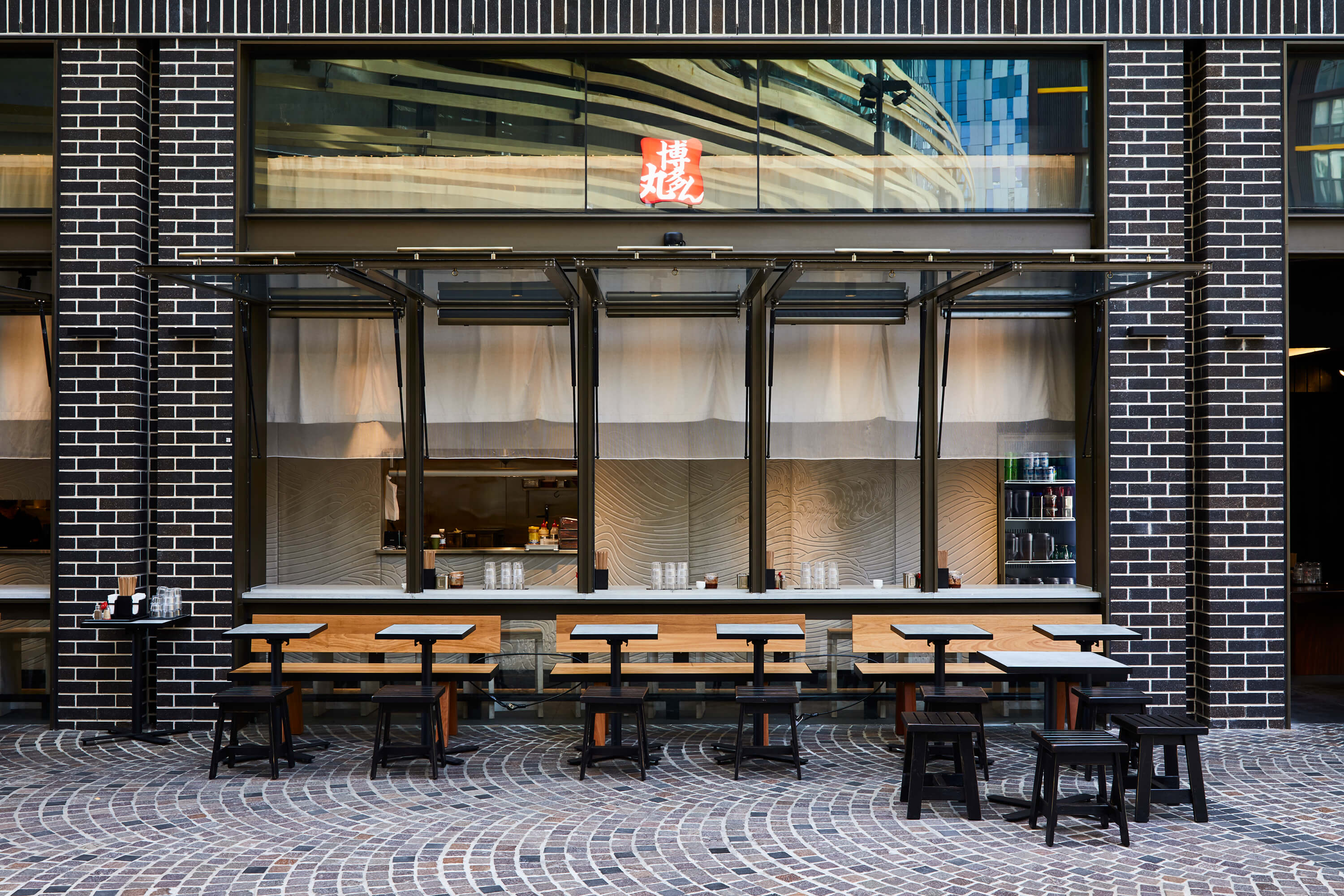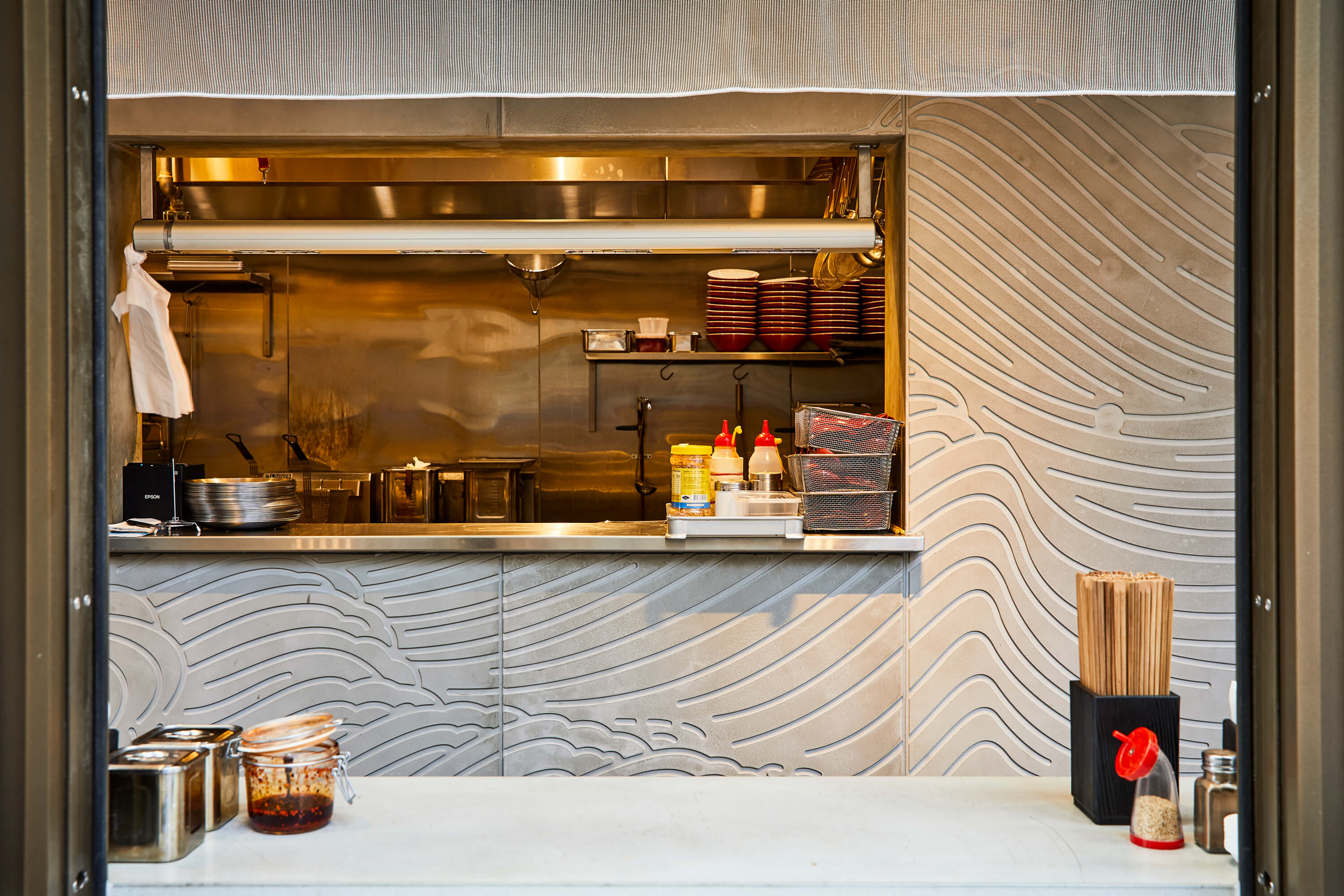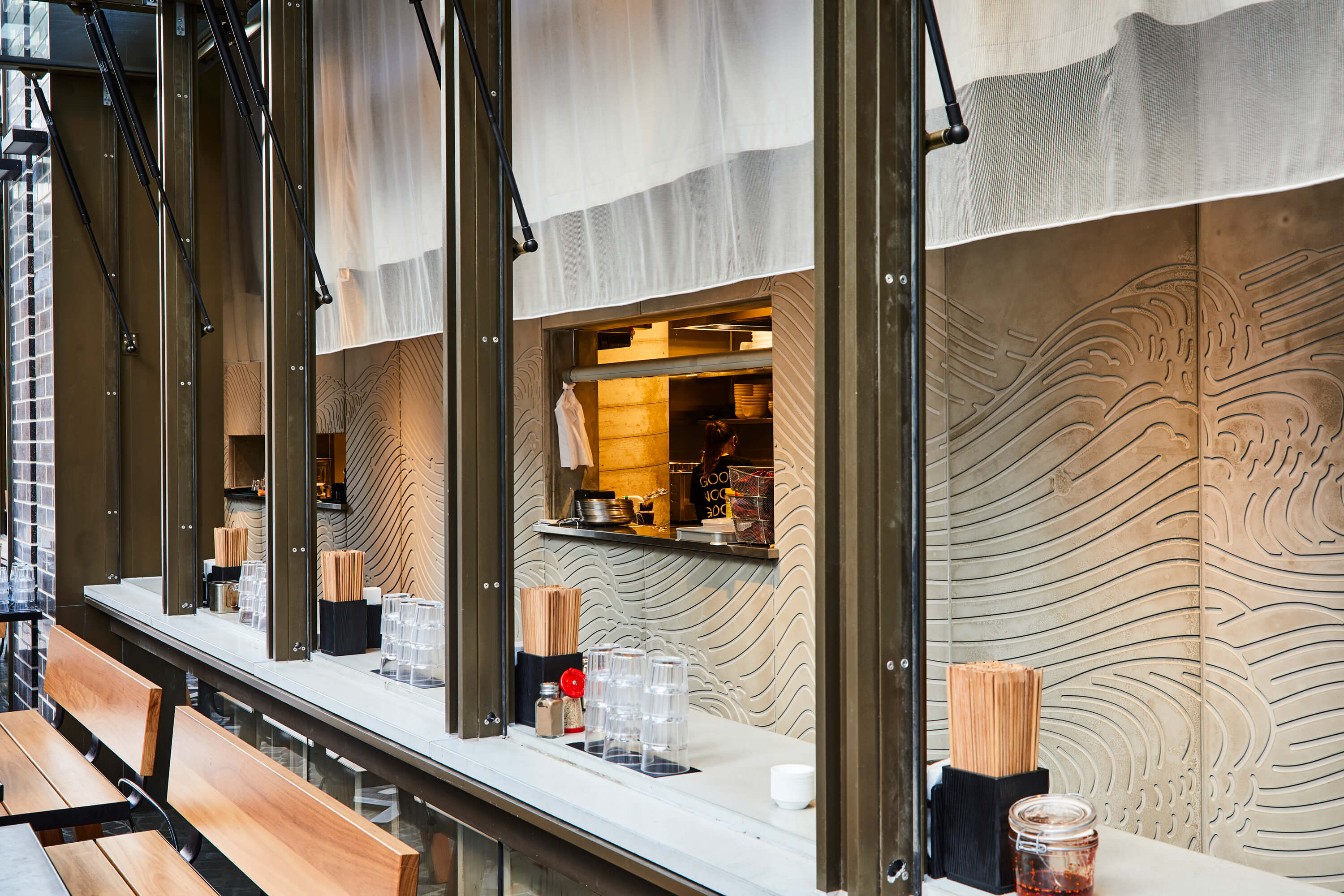 Hakata Maru Ramen makes delicious tonkotsu ramen. The franchise originally hails from Fukuoka, the home of tonkotsu ramen. Their latest venue in Darling Square is a long store that has been hugely popular since opening. Working with the interior design team we designed a large subtle feature graphic produced by moulding concrete panels. The design references the work of Japanese artist Mori Yūzan and his work from 1903 ‘Decoration and ornament, Themes, motives, Waves in art’.