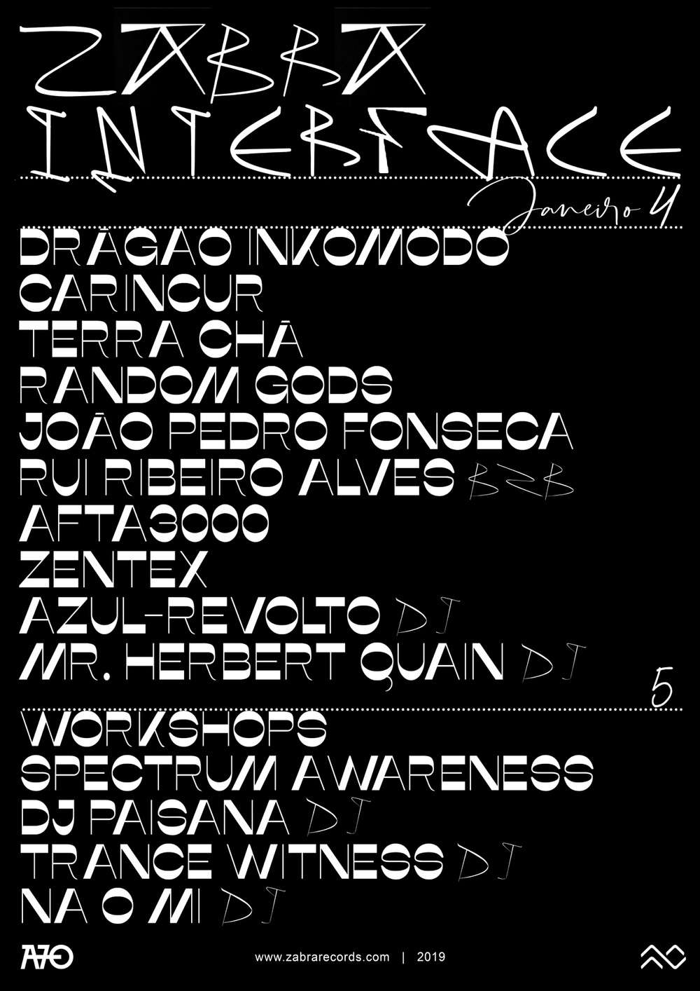 The line-up type shown on the second image (Dragão Inkomodo, Carincur, Terra Chã, Random Gods, João Pedro Fonseca, Rui Ribero Alves, Afta3000, Zentex, Azul-Revolto, Mr. Herbert Quain, Workshops, Spectrum Awarness, DJ Paisana, Trance Witness and Na o Mi) and the third image (Bass Chamber, Kara Conhar, AOOB and DJ-Set, mechanically stretched) is set in Misto by Katerina Korolevtseva.