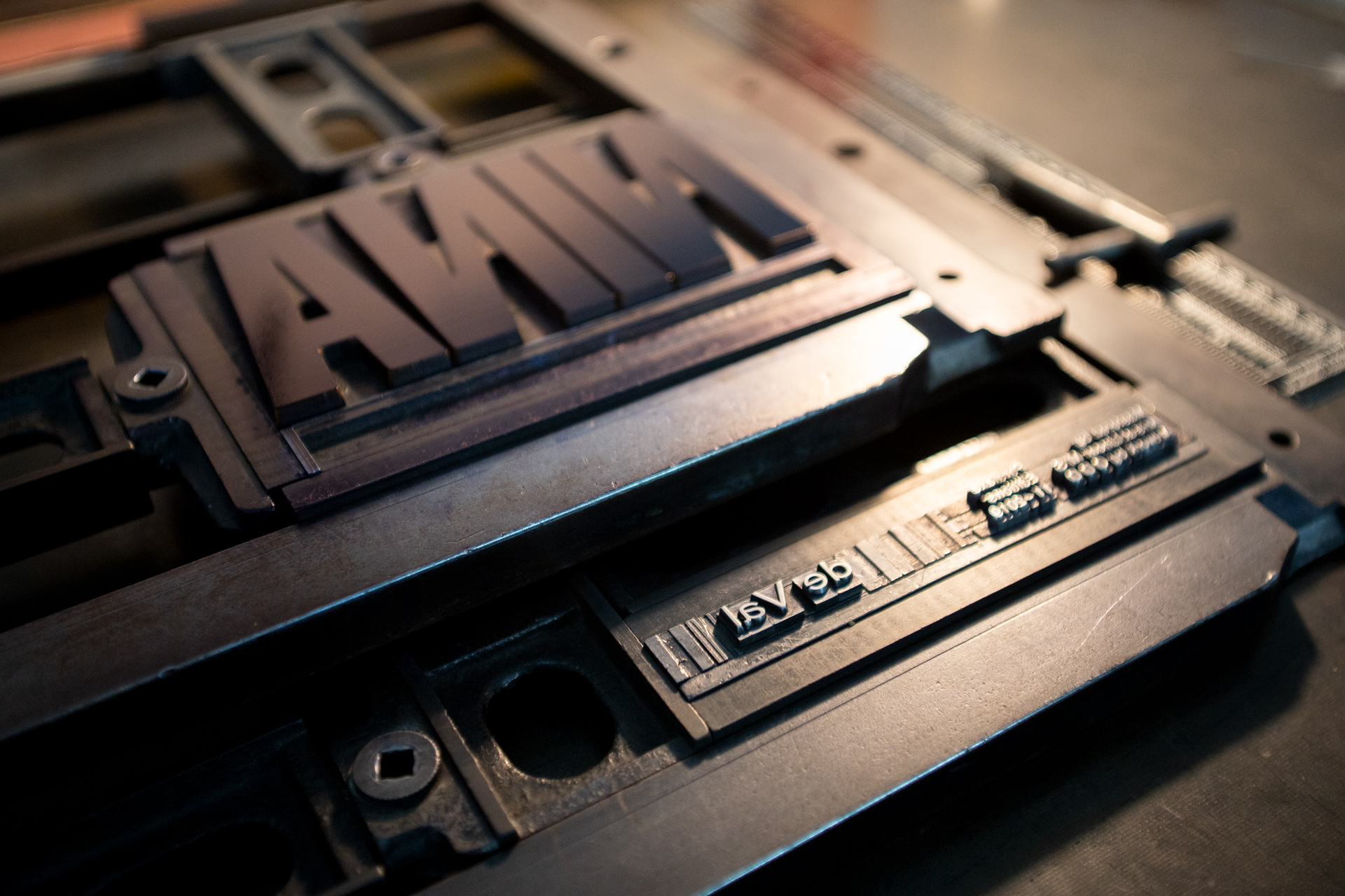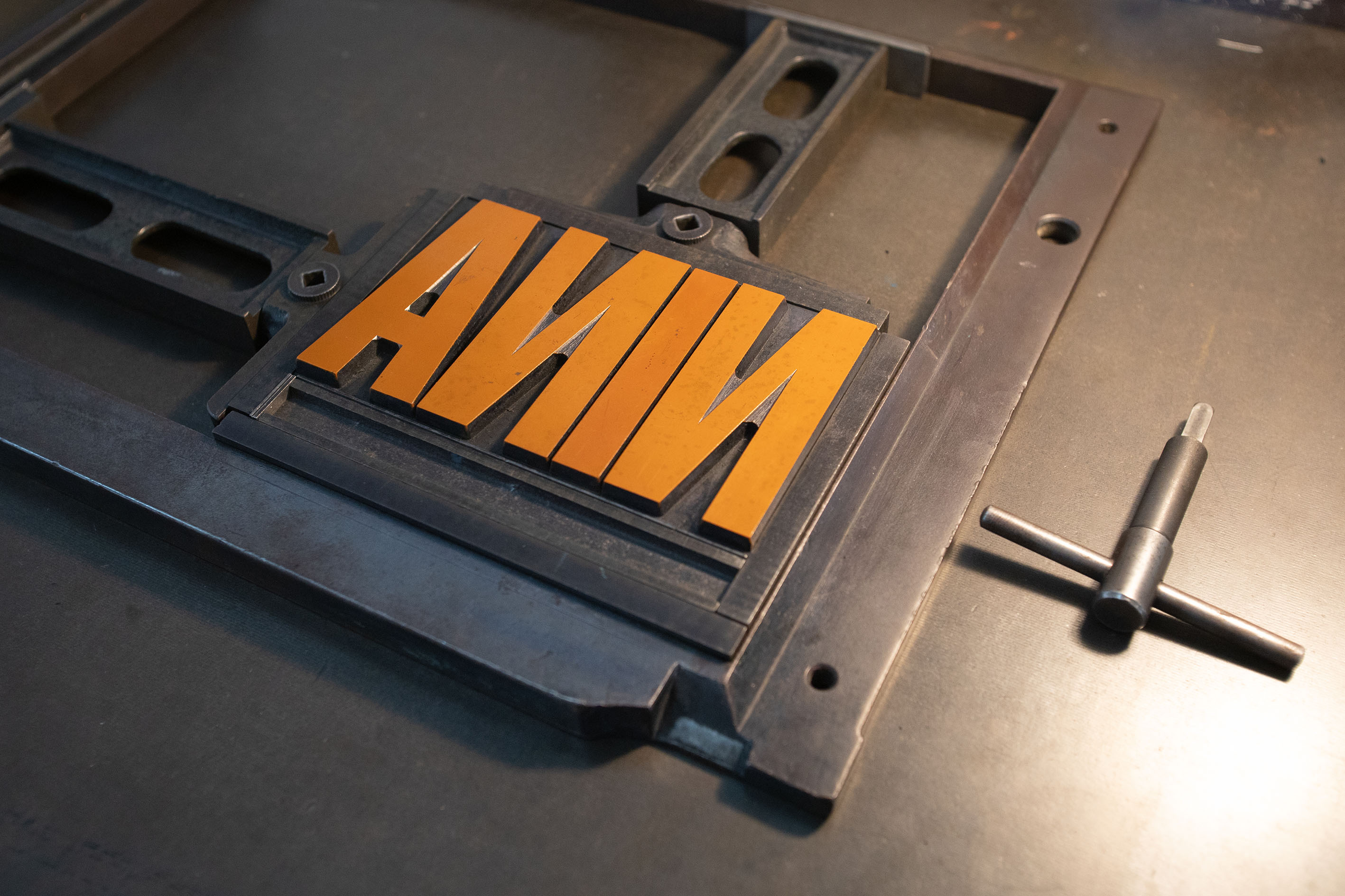 The large condensed type, made from synthetic plastic, is Folio Bold Extra Condensed. It was almost certainly produced at Neufville in Barcelona where they made and sold plastic poster type – including some Bauer typefaces like Folio. [Dafi Kühne, “Alternatives to wood type in the 20th century” (MRes dissertation, University of Reading, 2019), page 85.]