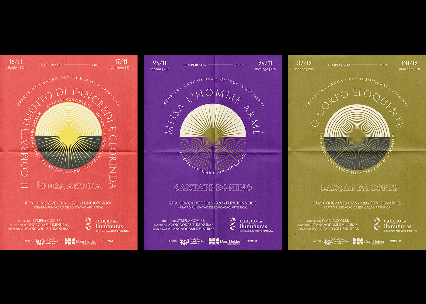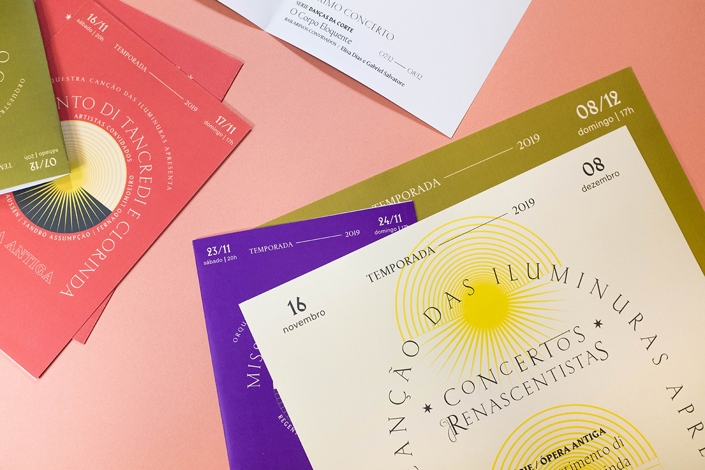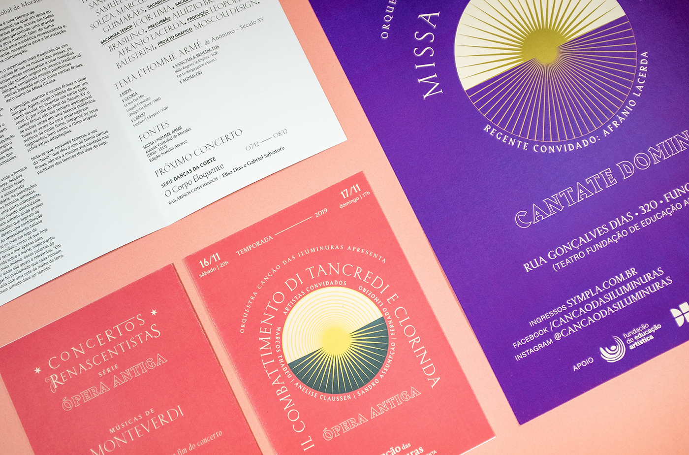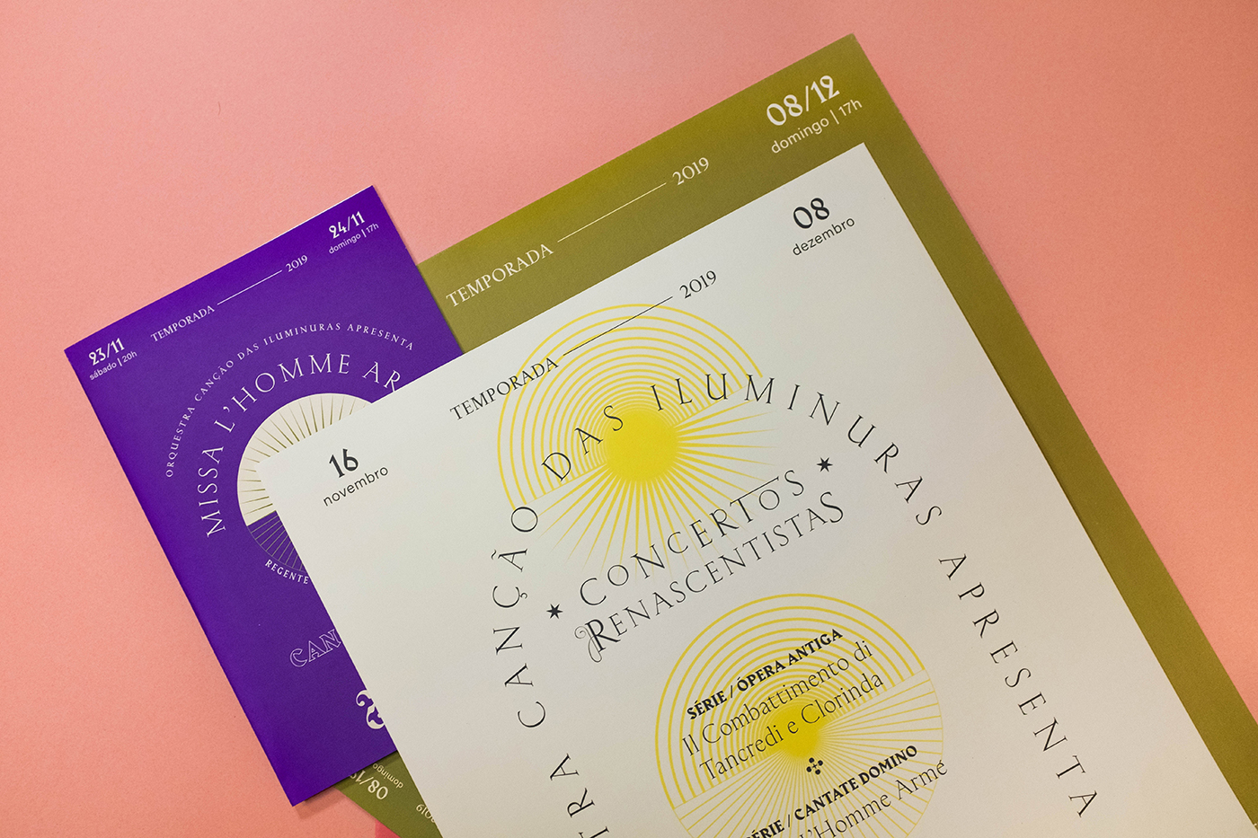 The season featured three concerts, and that was the starting point for the creation of the visual identity system. With the idea of “renaissance”, we created three suns with interchangeably built formats. Each sun becomes central to each concert, and the color palette was built on the vivid colors of paintings by Renaissance painters. Furthermore, the arch shape was fundamental for the compositions, as it is a very present form in Renaissance architecture.