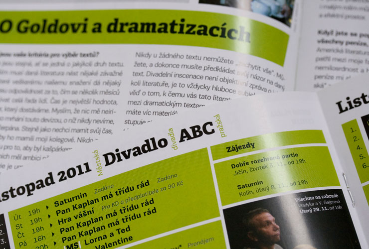 A change was needed. The requirement for uniformity of style remained, but the structure of the brand expanded to better duplicate the real role of individual actors, creating the main logotype and further the logo for the umbrella institution and the individual scenes. Historically there was no common symbol, so a very typographically based logo was chosen featuring Adelle supported by Encore (Parachute foundry). It plays with the composition of individual words. The inspiration for the final version was the map of the house, where the theater is located. It is a labyrinth of alleyways and passages that resemble a tangle of city streets. The map belongs to the city as well as a theater to the life in the city. People need to orientate themselves not only the streets but also within culture. Městká divadla pražská is a theater for everyone. Each graphic layout is like a section of a map, with variable detail, where each color area resemble blocks of houses and the thick white lines between them are streets. The color scheme was maintained; Rococo theater remained black, ABC Theater has a green color. An important element of communication are photographs and illustrations that are clean and free of text. They act as a visual stage with their own tale undisturbed by typography.